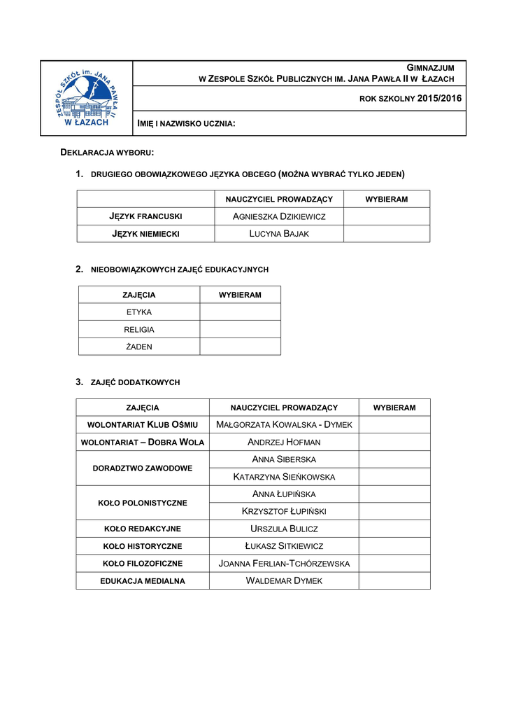Deklaracja wyboru - Zespół Szkół Publicznych im. Jana Pawła II w
