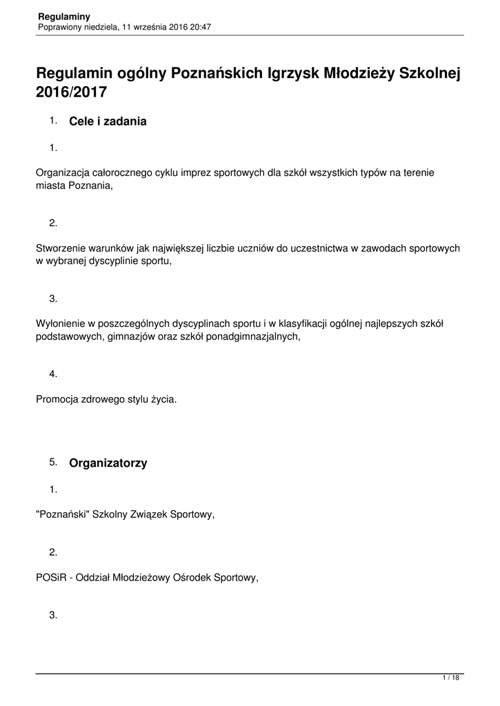 Regulaminy Poprawiony niedziela, 11 września 2016 20:47 Regulamin ogólny Poznańskich Igrzysk Młodzieży Szkolnej 2016/2017 1. Cele i zadania 1. Organizacja całorocznego cyklu imprez sportowych dla szkół wszystkich typów na terenie miasta Poznania, 2. Stworzenie warunków jak największej liczbie uczniów do uczestnictwa w zawodach sportowych w wybranej dyscyplinie sportu, 3. Wyłonienie w poszczególnych dyscyplinach sportu i w klasyfikacji ogólnej najlepszych szkół podstawowych, gimnazjów oraz szkół ponadgimnazjalnych, 4. Promocja zdrowego stylu życia. 5. Organizatorzy 1. "Poznański" Szkolny Związek Sportowy, 2. POSiR - Oddział Młodzieżowy Ośrodek Sportowy, 3. 1 / 18 Regulaminy Poprawiony niedziela, 11 września 2016 20:47 Wydział Sportu Urzędu Miasta Poznania. 4. Program 1. Igrzyska Młodzieży Szkolnej - dla szkół podstawowych, 2. Gimnazjada - dla szkół gimnazjalnych, 3. Licealiada - dla szkół ponadgimnazjalnych. 4. Uczestnictwo 1. Uczestnikami zawodów mogą być: IMS - młodzież ur. w roku 2004 i młodsza, Gimnazjada - młodzież ur. w roku 2001 i młodsza, Licealiada - młodzież ur. w roku 1997 i młodsza. 2 / 18 Regulaminy Poprawiony niedziela, 11 września 2016 20:47 We wszystkich zawodach drużynowych zespół składa się z uczniów jednej szkoły. Prawo reprezentowania szkoły mają uczniowie, którzy rozpoczęli naukę nie później niż 1 października 2016 r. W ramach Poznańskich Igrzysk Młodzieży Szkolnej szkoła ma prawo wystawić wyłącznie 1 zespół. Przed rozpoczęciem zawodów sportowych opiekunowie zespołów zobowiązani są przedłożyć organizatorowi imienną listę zawodników podpisaną przez dyrektora szkoły oraz ważne legitymacje szkolne (aktualna pieczątka oraz podpis właściciela). W przypadku legitymacji wystawionych po 1 października należy przedstawić dodatkowo zaświadczenie ze szkoły o czasie rozpoczęcia nauki. W przypadku stwierdzenia przez organizatora próby oszustwa (np. podrabiania legitymacji, podstawiania innych zawodników, udział zawodnika nieuprawnionego itp.) drużyna lub zawodnik zostają zdyskwalifikowani, a organizator zawodów ma obowiązek powiadomienia o zaistniałej sytuacji biuro głównego organizatora oraz umieszczenie adnotacji o zdarzeniu w komunikacie końcowym zawodów. O sposobie i długości kary zadecyduje powołana komisja. Na wszystkich szczeblach rozgrywania zawodów opiekunowie muszą posiadać aktualną listę zawodników (tj. zgłoszenie do PIMS) zgodnie z aktualnym wzorem. Zawodnicy, dyrekcja oraz opiekunowie podpisując i przekładając listę organizatorowi akceptują regulamin ogólny PIMS w tym wyrażają zgodę na: publikację ich wizerunku (w tym zdjęcia, nagrania filmowe, wywiady) oraz wyników i danych osobowych w relacjach z zawodów zamieszczonych w mediach, reklamach, materiałach promocyjnych organizatorów, partnerów medialnych i sponsorów; przetwarzanie danych osobowych do celów związanych z realizacją zawodów oraz do celów marketingowych organizatorów, partnerów medialnych i sponsorów. 3 / 18 Regulaminy Poprawiony niedziela, 11 września 2016 20:47 Organizator nie zapewnia uczestnikom zawodów ubezpieczenia NNW. Zaleca się aby startujący objęci byli szkolnym ubezpieczeniem NNW. Organizator zapewnia pomoc przedmedyczną w trakcie zawodów. Szczegółowe zasady uczestnictwa w poszczególnych dyscyplinach określają regulaminy tych zawodów opracowane w oparciu o aktualne przepisy polskich związków sportowych. Kary za niesportowe zachowanie (dotyczy szczególnie drastycznych incydentów słownych lub czynnych). Dotyczące zawodników: sędzia nakłada karę zgodnie z przepisami danego związku sportowego, incydent zostaje opisany w protokole przez sędziów, organizator zawodów – Poznański SZS po zasięgnięciu opinii sędziego/sędziów zawodów może nałożyć karę odsunięcia od zawodów sportowych na okres od 1 do 3 meczów, w przypadku powtórzenia się incydentu z tym samym zawodnikiem/zawodnikami następuje kara wykluczenia tego zawodnika/zawodników do końca rozgrywek w danym roku szkolnym. 4 / 18 Regulaminy Poprawiony niedziela, 11 września 2016 20:47 Dotyczące trenerów-opiekunów drużyn, kara nałożona przez sędziego zawodów, która jest równoznaczna z opuszczeniem przez trenera boiska i udaniem się do szatni lub poza teren hali sportowej, powoduje przerwanie meczu i walkower dla drużyny przeciwnej. Incydent ten zostaje opisany przez sędziego/sędziów zawodów w protokole oraz przekazany do siedziby Poznańskiego SZS. Poznański SZS niezwłocznie powiadamia dyrekcję danej szkoły o zdarzeniu. Powyższe ustalenia dotyczą wszystkich rozgrywek organizowanych przez Poznański SZS i MOS POSIR. Szkoły zainteresowane organizacją imprez sportowych, a w szczególności finałowych na swoim terenie proszone są o kontakt z organizatorami. Szkoły, które zakwalifikują się do finałów wojewódzkich zobowiązane są do interesowania się dalszym przebiegiem współzawodnictwa. Szkoły, które nie wystartują w dyscyplinach do których się zgłosiły w danym roku szkolnym, nie będą uwzględniane w nich w kolejnym roku szkolnym. - Sposób przeprowadzania zawodów 1. System rozgrywania zawodów w ramach Poznańskich Igrzysk Młodzieży Szkolnej zostanie 5 / 18 Regulaminy Poprawiony niedziela, 11 września 2016 20:47 ustalony przez organizatora po zasięgnięciu opinii koordynatorów, odrębnie dla każdej dyscypliny. W grach zespołowych zeszłoroczni finaliści będą rozstawieni (jeśli potwierdzą swój udział). 2. Wszystkie zawody sportowe prowadzone będą zgodnie ze szczegółowymi regulaminami Igrzysk oraz przepisami związków sportowych. Przyjęte przepisy obowiązywać będą do końca całego systemu rozgrywek. 3. W grach zespołowych na każdym etapie bezpośredni organizatorzy zobowiązani są do przeprowadzenia losowania kolejności rozgrywania meczów ( tabela Bergera ) 4. Wszystkie rozgrywki kończą si