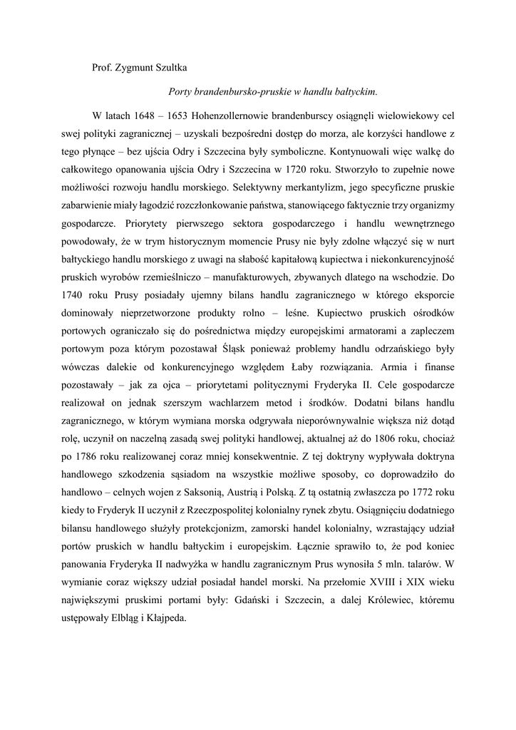 Prof. Zygmunt Szultka Porty brandenbursko-pruskie w handlu bałtyckim. W latach 1648 – 1653 Hohenzollernowie brandenburscy osiągnęli wielowiekowy cel swej polityki zagranicznej – uzyskali bezpośredni dostęp do morza, ale korzyści handlowe z tego płynące – bez ujścia Odry i Szczecina były symboliczne. Kontynuowali więc walkę do całkowitego opanowania ujścia Odry i Szczecina w 1720 roku. Stworzyło to zupełnie nowe możliwości rozwoju handlu morskiego. Selektywny merkantylizm, jego specyficzne pruskie zabarwienie miały łagodzić rozczłonkowanie państwa, stanowiącego faktycznie trzy organizmy gospodarcze. Priorytety pierwszego sektora gospodarczego i handlu wewnętrznego powodowały, że w trym historycznym momencie Prusy nie były zdolne włączyć się w nurt bałtyckiego handlu morskiego z uwagi na słabość kapitałową kupiectwa i niekonkurencyjność pruskich wyrobów rzemieślniczo – manufakturowych, zbywanych dlatego na wschodzie. Do 1740 roku Prusy posiadały ujemny bilans handlu zagranicznego w którego eksporcie dominowały nieprzetworzone produkty rolno – leśne. Kupiectwo pruskich ośrodków portowych ograniczało się do pośrednictwa między europejskimi armatorami a zapleczem portowym poza którym pozostawał Śląsk ponieważ problemy handlu odrzańskiego były wówczas dalekie od konkurencyjnego względem Łaby rozwiązania. Armia i finanse pozostawały – jak za ojca – priorytetami politycznymi Fryderyka II. Cele gospodarcze realizował on jednak szerszym wachlarzem metod i środków. Dodatni bilans handlu zagranicznego, w którym wymiana morska odgrywała nieporównywalnie większa niż dotąd rolę, uczynił on naczelną zasadą swej polityki handlowej, aktualnej aż do 1806 roku, chociaż po 1786 roku realizowanej coraz mniej konsekwentnie. Z tej doktryny wypływała doktryna handlowego szkodzenia sąsiadom na wszystkie możliwe sposoby, co doprowadziło do handlowo – celnych wojen z Saksonią, Austrią i Polską. Z tą ostatnią zwłaszcza po 1772 roku kiedy to Fryderyk II uczynił z Rzeczpospolitej kolonialny rynek zbytu. Osiągnięciu dodatniego bilansu handlowego służyły protekcjonizm, zamorski handel kolonialny, wzrastający udział portów pruskich w handlu bałtyckim i europejskim. Łącznie sprawiło to, że pod koniec panowania Fryderyka II nadwyżka w handlu zagranicznym Prus wynosiła 5 mln. talarów. W wymianie coraz większy udział posiadał handel morski. Na przełomie XVIII i XIX wieku największymi pruskimi portami były: Gdański i Szczecin, a dalej Królewiec, któremu ustępowały Elbląg i Kłajpeda.