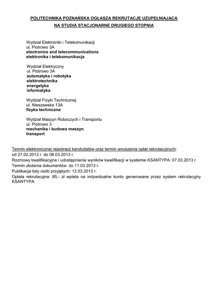 POLITECHNIKA POZNAŃSKA OGŁASZA REKRUTACJĘ UZUPEŁNIAJĄCĄ NA STUDIA STACJONARNE DRUGIEGO STOPNIA Wydział Elektroniki i Telekomunikacji ul. Piotrowo 3A electronics and telecommunications elektronika i telekomunikacja Wydział Elektryczny ul. Piotrowo 3A automatyka i robotyka elektrotechnika energetyka informatyka Wydział Fizyki Technicznej ul. Nieszawska 13A fizyka techniczna Wydział Maszyn Roboczych i Transportu ul. Piotrowo 3 mechanika i budowa maszyn transport Termin elektronicznej rejestracji kandydatów oraz termin wnoszenia opłat rekrutacyjnych: od 27.02.2013 r. do 06.03.2013 r. Rozmowy kwalifikacyjne i udostępnienie wyników kwalifikacji w systemie KSANTYPA: 07.03.2013 r. Termin złożenia dokumentów: do 11.03.2013 r. Publikacja listy osób przyjętych: 12.03.2013 r. Opłata rekrutacyjna: 85,- zł wpłata na indywidualne konto generowane przez system rekrutacyjny KSANTYPA.