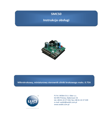 SMC50 Instrukcja obsługi Mikrokrokowy, miniaturowy sterownik silniki krokowego maks. 0.75A P.P.H. WObit E.K.J. Ober s.c. 62-045 Pniewy, Dęborzyce 16 tel.+48 61 22 27 410, fax.+48 61 22 27 439 e-mail: [email protected] www.wobit.com.pl Zawartość 1. Ogólna charakterystyka sterownika .................................................................................................... 3 2. Opis złącz: ............................................................................................................................................ 4 3. Ustawianie prądu fazy ......................................................................................................................... 5 4. Ustawianie podziału ............................................................................................................................ 6 5. Opis wejść sterujących ........................................................................................................................ 6 6. Zasilanie ............................................................................................................................................... 7 7. Podłączenie silnika............................................................................................................................... 8 8. Wskazówki użytkowe i zalecenia dot. bezpieczeństwa ....................................................................... 9 9. Dane techniczne ................................................................................................................................ 10 10. Kompletacja zestawu....................................................................................................................... 10 Dziękujemy za wybór naszego produktu! Niniejsza instrukcja ułatwi Państwu prawidłowa obsługę i poprawna eksploatacje opisywanego urządzenia. Informacje zawarte w niniejszej instrukcji przygotowane zostały z najwyższa uwaga przez naszych specjalistów i służą jako opis produktu. Na podstawie przedstawionych informacji nie należy wnioskować o określonych cechach lub przydatności produktu do konkretnego zastosowania. Informacje te nie zwalniają użytkownika z obowiązku poddania produktu własnej ocenie i sprawdzenia jego właściwości. Zastrzegamy sobie możliwość zmiany parametrów produktów bez powiadomienia. Prosimy o uważne przeczytanie instrukcji i stosowanie się do zawartych w niej zaleceń. Prosimy o zwrócenie szczególnej uwagi na następujące znaki: UWAGA! Niedostosowanie się do instrukcji może spowodować uszkodzenie urządzenia albo utrudnić posługiwanie się sprzętem lub oprogramowaniem. www.wobit.com.pl Instrukcja obsługi -SMC50 – 04.11.2014 – v.1.1 Str. 2 1. Ogólna charakterystyka sterownika SMC50 jest sterownikiem przeznaczonym do współpracy z dwufazowym silnikiem krokowym. Umożliwia sterowanie pełno krokowe lub krokiem podzielonym na 2, 4 lub 8 części, wymuszając odpowiednią wartość prądu w uzwojeniu silnika, niezależnie od napięcia zasilania sterownika. Każdy impuls prostokątny pojawiający się na wejściu kroku (CLK) powoduje przeskok silnika o jeden krok lub mikrokrok, w zależności od głębokości podziału krokowego ustawionego w sterowniku za pomocą zworek (M1 i M2). Prąd znamionowy silnika ustalany jest za pomocą potencjometru znajdującego się na płytce drukowanej sterownika. Potencjometr umożliwia zmianę prądu fazy sterownika w zakresie 0,15 A do 0,75 A. Sterownik posiada wskaźnik napięcia zasilania w postaci czerwonej diody LED. SMC50 oferowany jest w dwóch wersjach: Jako moduł przystosowany do wpięcia w PCB (M), Jako sterownik na profilu L kształtnym (B) z uchwytem do montażu na szynie monterskiej (35mm). Sterownik SMC50 sprzedawany jest jako komponent do budowy system napędowego i powinien być zamontowany zgodnie z zasadami montażu urządzeń elektrycznych. Użytkownik odpowiada za zapewnienie zgodności z normami emisji zakłóceń i kompatybilności elektromagnetycznej (odpowiednie prowadzenie połączeń kablowych, stosowanie ekranowania i pierścieni ferrytowych). Właściwości: Interfejs sterujący KROK/KIERUNEK, Szeroki zakres napięcia zasilania +15V…+28V (30Vmaks.), Miniaturowe wymiary (płytka 50,5x47,6mm wysokość z elementami 20mm), Wysoka częstotliwość kroku do 500kHz, Prąd znamionowy maks. 0.75A na fazę, Ustawianie prądu za pomocą miniaturowego potencjometra na płytce sterownika, Mikrokrok z podziałem do 1/8, Zabezpieczenie termiczne końcówki mocy, Zabezpieczenie przeciwprzebiciowe końcówki mocy, Zabezpieczenie zaniku napięcia zasilania, Podłączenie sygnałów sterujących za pomocą dwurzędowego złącza grzebieniowego przystosowanego do zaciśnięcia taśmy dziesięciożyłowej (złącze IDC10), Profil aluminiowy L kształtny (B) lub moduł do wpięcia w płytę (M), Uchwyt do montażu na szynie DIN (35 mm) – dla wersji B. www.wobit.com.pl Instrukcja obsługi -SMC50 – 04.11.2014 – v.1.1 Str. 3 2. Opis złącz: Złącze SV3 : 1-4: V + Napięcie zasilania z zakresu 15-28 VDC, 5-8: GND masa napięcia zasilania 9-12: A początek uzwojenia fazy A silnika 13-16:/A koniec uzwojenia fazy A silnika 17-20: B początek uzwojenia fazy B silnika 21-24:/B koniec uzwojenia fazy B silnika www.wobit.com.pl Instrukcja obsługi -SMC50 – 04.11.2014 – v.1.1 Str. 4 Złącze SV2: 1,3,5,7,9 – GND masa sygnałów sterujących 2- M2 wejście ustalające głębokość podziału krokowego 4- M1 wejście ustalające głębokość podziału krokowego 6- EN wejście zezwolenia na ruch (Enable) 8- DIR wejście sygnału kierunku 10- CLK wejście sygnału kroku Złącze SV1 – złącze wyboru aktywnego zbocza sygnału zegarowego 1 i 2 zwarte – aktywne zbocze opadające 2 i 3 zwarte – aktywne zbocze narastające 3. Ustawianie prądu fazy Prąd fazy jest ustawiany za pomocą miniaturowego potencjometru R19 znajdującego się na płytce PCB sterownika. Prąd przest