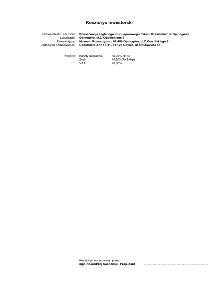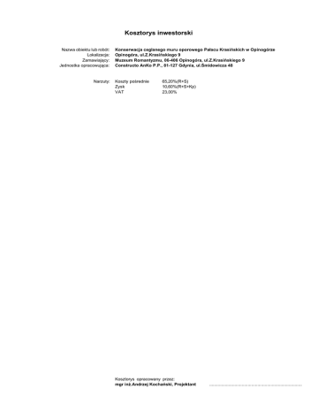 Kosztorys inwestorski Nazwa obiektu lub robót: Lokalizacja: Zamawiający: Jednostka opracowująca: Narzuty: Konserwacja ceglanego muru oporowego Pałacu Krasińskich w Opinogórze Opinogóra, ul.Z.Krasińskiego 9 Muzeum Romantyzmu, 06-406 Opinogóra, ul.Z.Krasińskiego 9 Constructo AnKo P.P., 81-127 Gdynia, ul.Śmidowicza 48 Koszty pośrednie Zysk VAT 65,20%(R+S) 10,60%(R+S+Kp) 23,00% Kosztorys opracowany przez: mgr inż.Andrzej Kochański, Projektant ........................................................................................... 1.3.3.4. Ślepy Konserwacja elementów murowych Zuzia10 (C) Datacomp 1994-2012(lic. 13017) strona nr: 2 Ogólna charakterystyka obiektów lub robót Roboty konserwatorskie i odtworzeniowe Przedmiar robót Nr 1 1.1 Podstawa ceny jednostkowej Kosztorys Element TZKNC 6/106/1 (1) Opis robót, wyliczenie ilości robót TZKNC 6/106/2 (1) TZKNC 6/106/5 (1) 2 Ogółem: = 2,000000 2,000 szt 2,000 Ogółem: = 2,000000 2,000 szt 2,000 = 30,000000 30 szt 30 = 172,000000 172,000 m2 172,000 m2 172,000 dm2 14 620,000 m2 172,000 m2 172,000 m2 172,000 m3 6,192 m2 172,000 m2 172,000 Inwentaryzacja obiektu i wstępny opis, stopień trudności obiektu - przeciętny Mur i korona muru 1.3 2 Nadzór przy fotografowaniu obiektu, stopień trudności obiektu - przeciętny Mur i korona muru 30 Ogółem: 2 2.1 Element KNR 202/1604/1 (1) Rusztowania Rusztowania zewnętrzne rurowe o wysokości do 10˙m, nakłady podstawowe Mur i korona muru 172 Ogółem: 3 3.1 Element TZKNC 6/101/1 (2) Korona muru,pękniecia i ubytki lica muru Oczyszczenie wstępne Mur i korona muru 3.2 3.3 3.4 3.5 3.6 3.7 3.8 Ilość Konserwacja ceglanego muru oporowego Pałacu Krasińskich w Opinogórze Wykonanie dokumentacji fotograficznej i opisowej stanu zachowania obiektu przed konserwacją Wstępne oględziny obiektu, stopień trudności obiektu - przeciętny Mur i korona muru 1.2 J.m. 172 = 172,000000 Ogółem: 172,000 TZKNC 6/101/2 Mycie powierzchni roztworami detergentów bez względu na ilość powtórzeń, kamienie porowate (2) piaskowiec Mur i korona muru (15% upustu na elementy wymieniane) (172/0,1/0,1)*0,85 = 14 620,000000 Ogółem: 14 620,000 KNR BC 2/127/2 Odgrzybianie podłoży budowlanych przy renowacji starego budownictwa, ręczne przez malowanie, 2-krotne Mur i korona muru 172 = 172,000000 Ogółem: 172,000 KNR BC 2/128/1 Dodatkowa neutralizacja soli preparatem przeciwsolnym, 2-krotne, ręczne malowanie podłoża Mur i korona muru 172 = 172,000000 Ogółem: 172,000 TZKNBK 7/301/12 Oczyszczanie spoin ceglanych i skruszalej zaprawy na głębokość do 2 cm w miejscach łatwo dostępnych powierzchnia ponad 5 m2 (poz 242) Mur i korona muru 172 = 172,000000 Ogółem: 172,000 TZKNBK 4/501/4 Uzupełnienie brakujących fragmentów przez wykucie strzępi, oczyszczenie murów cegłą gotycką grub. 1 cegły do 1˙m3 w jednym miejscu, mur o gładkiej powierzchni ścian (poz 66) Mur i korona muru 30% 172*0,12*0,30 = 6,192000 Ogółem: 6,192 TZKNBK 4/901/3 Spoinowanie murów z cegły gotyckiej gładkich w ilości ponad 2˙m2 w jednym miejscu (poz 229) Mur i korona muru 172 = 172,000000 Ogółem: 172,000 TZKNBK 8/105/12 Czyszczenie ścierne lub chemiczne patynowanie murów z cegły gotyckiej (kolorowanie) o powierzchni ponad 5 m2 (poz 158) Mur i korona muru 172 = 172,000000 Ogółem: 172,000 Konserwacja ceglanego muru oporowego Pałacu Krasińskich w Opinogórze 1.3.3.4. Ślepy Konserwacja elementów murowych Nr 3.9 4 4.1 Podstawa ceny jednostkowej KNR BC 2/129/1 Element TZKNC 6/106/1 (1) Zuzia10 (C) Datacomp 1994-2012(lic. 13017) strona nr: 3 Opis robót, wyliczenie ilości robót Hydrofobizacja podłoży przy renowacji starego budownictwa, powierzchnie betonowe, malowanie ręczne Mur i korona muru 2x 172*2 = 344,000000 Ogółem: 344 Wykonanie dokumentacji konserwatorskiej fotograficznej i opisowej robót Wstępne oględziny obiektu, stopień trudności obiektu - przeciętny Mur i korona muru 4.2 TZKNC 6/106/2 (1) TZKNC 6/106/5 (1) 2 Ilość m2 344 Ogółem: = 2,000000 2,000 szt 2,000 Ogółem: = 2,000000 2,000 szt 2,000 = 30,000000 30 szt 30 Inwentaryzacja obiektu i wstępny opis, stopień trudności obiektu - przeciętny Mur i korona muru 4.3 J.m. 2 Nadzór przy fotografowaniu obiektu, stopień trudności obiektu - przeciętny Mur i korona muru 30 Ogółem: Kalkulacja uproszczona Nr Podstawa ceny jednostkowej Kosztorys Opis robót, wyliczenie ilości robót J.m. Ilość Krot. Cena jednost. Konserwacja ceglanego muru oporowego Pałacu Krasińskich w Opinogórze Wykonanie dokumentacji fotograficznej i opisowej stanu zachowania obiektu przed konserwacją Wstępne oględziny obiektu, stopień trudności obiektu - przeciętny 1 Element 1.1 TZKNC 6/106/1 (1) szt 2,000 TZKNC 6/106/2 Inwentaryzacja obiektu i wstępny opis, stopień trudności obiektu (1) przeciętny szt 2,000 TZKNC 6/106/5 Nadzór przy fotografowaniu obiektu, stopień trudności obiektu (1) przeciętny szt 30 Razem Wykonanie dokumentacji fotograficznej i opisowej stanu zachowania obiektu przed konserwacją: Element Rusztowania KNR 202/1604/1 Rusztowania zewnętrzne rurowe o wysokości do 10˙m, nakłady (1) podstawowe m2 172,000 Razem Rusztowania: Element Korona muru,pękniecia i ubytki lica muru TZKNC 6/101/1 Oczyszczenie wstępne (2) m2 172,000 TZKNC 6/101/2 Mycie powierzchni roztworami detergentów bez względu na ilość (2) powtórzeń, kamienie porowate - piaskowiec dm2 14 620,000 KNR BC 2/127/2 Odgrzybianie podłoży budowlanych przy renowacji starego budownictwa, ręczne przez malowanie, 2-krotne m2 172,000 KNR BC 2/128/1 Dodatkowa neutralizacja soli preparatem przeciwsolnym, 2-krotne, ręczne malowanie podłoża m2 172,000 TZKNBK 7/301/12 Oczyszczanie spoin ceglanych i skruszalej zaprawy na głębokość do 2 cm w miejscach łatwo dostępnych powierzchnia ponad 5 m2 (poz 242) m2 172,000 TZKNBK 4/501/4 Uzupełnienie brakujących fragmentów przez wykucie strzępi, oczyszczenie murów cegłą gotycką grub. 1 cegły do 1˙m3 w jednym mi