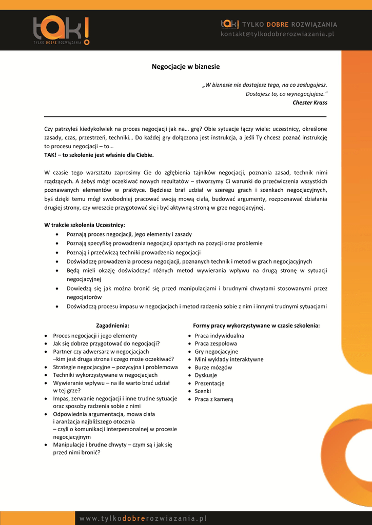 Negocjacje w biznesie „W biznesie nie dostajesz tego, na co zasługujesz. Dostajesz to, co wynegocjujesz." Chester Krass Czy patrzyłeś kiedykolwiek na proces negocjacji jak na… grę? Obie sytuacje łączy wiele: uczestnicy, określone zasady, czas, przestrzeń, techniki… Do każdej gry dołączona jest instrukcja, a jeśli Ty chcesz poznać instrukcję to procesu negocjacji – to… TAK! – to szkolenie jest właśnie dla Ciebie. W czasie tego warsztatu zaprosimy Cie do zgłębienia tajników negocjacji, poznania zasad, technik nimi rządzących. A żebyś mógł oczekiwać nowych rezultatów – stworzymy Ci warunki do przećwiczenia wszystkich poznawanych elementów w praktyce. Będziesz brał udział w szeregu grach i scenkach negocjacyjnych, byś dzięki temu mógł swobodniej pracować swoją mową ciała, budować argumenty, rozpoznawać działania drugiej strony, czy wreszcie przygotować się i być aktywną stroną w grze negocjacyjnej. W trakcie szkolenia Uczestnicy: Poznają proces negocjacji, jego elementy i zasady Poznają specyfikę prowadzenia negocjacji opartych na pozycji oraz problemie Poznają i przećwiczą techniki prowadzenia negocjacji Doświadczę prowadzenia procesu negocjacji, poznanych technik i metod w grach negocjacyjnych Będą mieli okazję doświadczyć różnych metod wywierania wpływu na drugą stronę w sytuacji negocjacyjnej Dowiedzą się jak można bronić się przed manipulacjami i brudnymi chwytami stosowanymi przez negocjatorów Doświadczą procesu impasu w negocjacjach i metod radzenia sobie z nim i innymi trudnymi sytuacjami Zagadnienia: Proces negocjacji i jego elementy Jak się dobrze przygotować do negocjacji? Partner czy adwersarz w negocjacjach –kim jest druga strona i czego może oczekiwać? Strategie negocjacyjne – pozycyjna i problemowa Techniki wykorzystywane w negocjacjach Wywieranie wpływu – na ile warto brać udział w tej grze? Impas, zerwanie negocjacji i inne trudne sytuacje oraz sposoby radzenia sobie z nimi Odpowiednia argumentacja, mowa ciała i aranżacja najbliższego otocznia – czyli o komunikacji interpersonalnej w procesie negocjacyjnym Manipulacje i brudne chwyty – czym są i jak się przed nimi bronić? Formy pracy wykorzystywane w czasie szkolenia: Praca indywidualna Praca zespołowa Gry negocjacyjne Mini wykłady interaktywne Burze mózgów Dyskusje Prezentacje Scenki Praca z kamerą Wsparcie po zakończeniu szkolenia Po szkoleniu Uczestnicy: Otrzymują 3 zadania związane z treściami szkolenia, które są omawiane w trakcie teleklas Biorą udział w 3 teleklasach pozwalających na omówienie zadań poszkoleniowych, znalezienie odpowiedzi na pojawiające się pytania oraz na dzielenie się pierwszymi doświadczeniami Otrzymują raz na tydzień przez okres dwóch miesięcy wiadomość z pomocnymi wskazówkami Chętni Uczestnicy są prowadzeni w sposób coachingowy do uzyskania satysfakcjonujących wyników