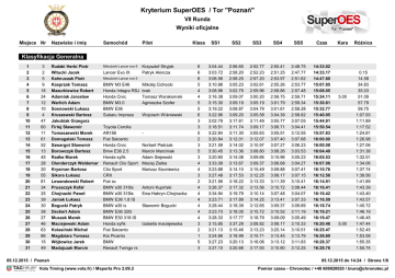 Kryterium SuperOES / Tor "Poznań" VII Runda Wyniki oficjalne Miejsce Nr Nazwisko i imię Samochód Pilot Mitsubishi Lancer evo 9 Krzysztof Stryjek Patryk Akincza Klasa SS1 SS2 SS3 SS4 SS5 Czas 6 6 6 5 4 4 5 5 6 3 3 5 2 3 5 3 4 4 3 2 4 4 4 4 4 4 3 2 1 5 3 3:04.44 3:03.72 3:06.56 3:10.98 3:08.96 3:16.38 3:15.30 3:19.22 3:22.96 3:02.79 3:18.51 3:22.84 3:20.84 3:21.59 3:30.45 3:20.60 3:33.09 3:23.88 3:27.48 3:21.56 3:26.37 3:34.94 3:23.71 3:28.44 3:23.73 3:28.33 3:15.85 3:21.13 3:24.66 3:27.23 3:27.10 2:56.65 2:58.20 2:58.25 3:05.23 3:02.79 3:09.07 3:09.19 3:08.87 3:09.20 3:17.81 3:11.74 3:11.30 3:12.01 3:14.02 3:13.36 3:14.08 3:13.67 3:14.10 3:17.53 3:18.22 3:17.32 3:19.79 3:17.89 3:18.39 3:18.05 3:17.77 3:37.29 3:15.46 3:18.99 3:20.13 3:20.68 2:52.77 2:52.23 2:57.20 3:02.61 2:59.96 3:00.20 3:05.19 3:04.79 3:05.58 3:11.49 3:09.17 3:05.63 3:12.07 3:10.97 3:08.80 3:09.66 3:09.37 3:15.49 3:12.25 3:13.33 3:13.56 3:10.14 3:14.25 3:12.65 3:15.72 3:18.79 3:08.82 3:13.23 3:15.71 3:16.06 3:17.93 2:50.41 2:51.25 2:53.97 2:55.26 2:58.86 2:58.75 3:01.79 3:01.61 3:04.39 3:05.77 3:06.71 3:05.51 3:07.40 3:07.27 3:08.26 3:15.96 3:06.68 3:09.88 3:08.17 3:11.39 3:10.72 3:07.48 3:13.41 3:09.37 3:10.52 3:09.09 3:08.17 3:25.14 3:13.45 3:13.12 3:10.80 2:48.75 2:47.77 2:51.62 2:53.77 2:57.48 2:59.71 2:59.34 2:58.28 2:58.82 3:07.05 3:04.41 3:12.55 3:07.68 3:06.23 3:03.53 3:05.23 3:04.27 3:07.41 3:07.15 3:10.41 3:08.44 3:04.07 3:07.33 3:09.89 3:11.19 3:05.49 3:10.33 3:10.51 3:13.79 3:11.83 3:12.25 14:33.02 14:33.17 14:47.60 15:07.85 15:08.05 15:24.11 15:30.81 15:32.77 15:40.95 15:44.91 15:50.54 15:57.83 16:00.00 16:00.08 16:04.40 16:05.53 16:07.08 16:10.76 16:12.58 16:14.91 16:16.41 16:16.42 16:16.59 16:18.74 16:19.21 16:19.47 16:20.46 16:25.47 16:26.60 16:28.37 16:28.76 Kara Różnica Klasyfikacja Generalna 1 2 3 4 5 6 7 8 9 10 11 12 13 14 15 16 17 18 19 20 21 22 23 24 25 26 27 28 29 30 31 3 2 5 9 18 24 12 10 4 47 60 11 61 52 13 45 28 20 55 81 34 25 39 30 38 27 46 63 86 15 49 Rudzki Herbi Piotr Witucki Jacek Kałmuczak Piotr Kasprzak Tomasz Mazurkiewicz Robert Adamiak Jarosław Warlich Adam Sosnowski Łukasz Kruszewski Bartosz Jakubiak Grzegorz Firlej Sławomir Tomaszewski Marek Domagalski Tomasz Szwargot Sławomir Borowczyk Bartosz Radke Marek Olenderczyk Waldemar Krysman Bartosz Sikora Łukasz Lewandowski Robert Prusaczyk Rafał Chojnacki Paweł Janiak Łukasz Bogucki Patryk Deckert Adam Muszak Marek Maciejewski Adam Kolasiński Michał Magdziarz Tomasz Wójtowicz Jarek Madajczak Marcin Lancer Evo IX Mitsubishi Lancer evo 9 BMW M3 E46 Honda Integra RSJ Honda Civic BMW M3.0 BMW E36 Subaru Impreza Toyota Corolla AR156 Fiat Seicento Honda Civic Bmw E36 2.5 Honda syfik Renault Clio Sport Clio Sport CRX Fiat sc BMW e30 318is BMW e30 318is BMW E36 1.8 IS BMW e30 is BMW E36 320i BMW E30 318 IS Honda syfik Fiat Seicento Kia Picanto BMW Renault Twingo rs 05.12.2015 / Poznań Vola Timing (www.vola.fr) / Msports Pro 2.09.2 Mikołaj Cichocki brak Tomasz Warakomski Agnieszka Szofer Wojciech Wiśniewski Norbert Pietrzak Marcin Marciniak Adam Siejewski Maciej Zielke Mariusz Szuniewicz Antoni Kupiński Ewa Habryn-Chojnacka Sławomir Bogucki Izabella maciejewska 5.00 5.00 0.15 14.58 34.83 35.03 51.09 57.79 59.75 1:07.93 1:11.89 1:17.52 1:24.81 1:26.98 1:27.06 1:31.38 1:32.51 1:34.06 1:37.74 1:39.56 1:41.89 1:43.39 1:43.40 1:43.57 1:45.72 1:46.19 1:46.45 1:47.44 1:52.45 1:53.58 1:55.35 1:55.74 05.12.2015 do 14:24 / Strona 1/8 Pomiar czasu - Chronotec / +48 609020020 / VolaSoftControlPdf [email protected] Kryterium SuperOES / Tor "Poznań" VII Runda Wyniki oficjalne Miejsce Nr 32 33 34 35 36 37 38 39 40 41 42 43 44 45 46 47 48 49 50 51 52 53 54 55 56 57 58 59 60 61 62 63 64 65 8 17 54 7 41 50 90 33 29 26 82 31 64 74 93 87 43 37 72 36 65 70 62 40 75 89 88 56 78 71 91 66 68 35 Nazwisko i imię Samochód Pilot Spławski Sławomir Schmidt Oscar Dziurleja Mateusz Subaru Impreza BMW E36 Honda civic Michał Baranowski Marta Korszylowska Kuster-Kałmuczak Kamila Subaru Impreza GT Tomasz Piotrowski Rybicki Hubert Kowalczyk Szymon Litwinowicz Piotr Maik Łukasz Kęsy Kamil Dwojak Marcin Litwinowicz Damian Figas Filip Wojciechowski Tomasz Sakowska Katarzyna Wierzbicki Wojciech Nowicki Dariusz Łuszczewski Tomek Paetzold Kuba Łączny Jacek Stroiwąs Krzysztof Śmiglak Marek Humański Piotr Grabowski Michał Żukow Lucjan Dolata Jakub Pytlak Przemysław Scheffs Bartosz Grygiel Marcin Schedler Tomasz Banaszyński Cezary Wierzbicki Nikodem Bocheński Krzysztof Sosnowski Michał Cebula Piotr Honda Civic Honda Civic 1.5 Kia Picanto Bmw 318is CorsaLPGmaster Bmw 318 ti Kia Picanto Ford Fiesta Fiat SC Kia Picanto Kia Picanto Kia Picanto Renault Clio Sport BMW E30 318i Kia Picanto Renault CLIO Fiat Seicento Kia Picanto Fiat Seicento BMW E36 318iS Fiat CC Kia Picanto Kia Picanto bmw E30 Fiat Uno Nissan Micra Kia Picanto Ford KA Fiat Uno BMW e36 05.12.2015 / Poznań Vola Timing (www.vola.fr) / Msports Pro 2.09.2 Paula Metelska Michał Rogaczewski Maciej Kolenda Nikola Figas Rafał Relski Piotr Litwinowicz Marta Wiśniewska Anna Wojtowicz Marlena Skrętna Stroiwąs Adam Piechociński Tomasz Dolata Michał Sosnowski Małek Asia Darek Nowicki Piotr Wawrzyniak Tomasz Schedler Karolina Kucharska Klasa SS1 SS2 SS3 SS4 SS5 Czas 6 5 3 6 4 3 1 4 4 4 1 4 2 2 1 1 4 4 2 4 2 2 2 4 2 1 1 3 2 2 1 2 2 4 3:27.53 3:40.64 3:41.19 3:32.98 3:35.14 3:28.11 3:30.64 3:45.28 3:30.01 3:36.16 3:33.35 3:33.49 3:30.00 3:32.26 3:43.17 3:31.67 3:36.08 3:45.40 3:47.27 3:42.42 3:38.36 3:36.92 3:45.50 3:46.77 3:41.53 3:42.94 3:43.97 3:49.68 3:49.46 3:52.81 3:47.97 3:49.54 3:55.57 3:54.73 3:29.44 3:22.69 3:15.77 3:20.93 3:23.94 3:21.41 3:26.93 3:27.84 3:23.96 3:29.07 3:29.52 3:38.13 3:26.60 3:28.81 3:30.98 3:28.01 3:39.52 3:33.87 3:32.71 3:32.99 3:32.39 3:32.55 3:34.63 3:37.94 3:35.71 3:41.09 3:41.12 3:39.58 3:38.74 3:42.08 3:41.36 3:42.75 3:46.93 3:49.47 3:14.45 3:14.58 3:14.63 3:16.97 3:17.44 3:17.73 3:22.00 3:18.72 3:21.34 3:22.01 3:23.56 3:21.65 3:22.47 3:26.38 3:26.48 3:49.95 3:26