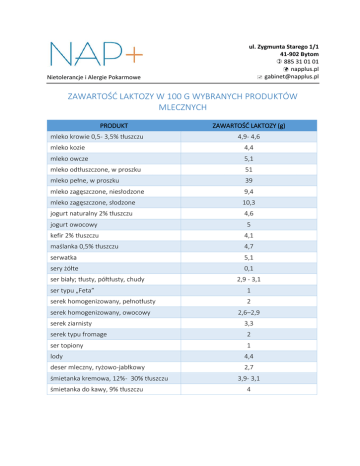 Nietolerancje i Alergie Pokarmowe ul. Zygmunta Starego 1/1 41-902 Bytom 885 31 01 01 napplus.pl [email protected] ZAWARTOŚĆ LAKTOZY W 100 G WYBRANYCH PRODUKTÓW MLECZNYCH PRODUKT mleko krowie 0,5- 3,5% tłuszczu ZAWARTOŚĆ LAKTOZY (g) 4,9- 4,6 mleko kozie 4,4 mleko owcze 5,1 mleko odtłuszczone, w proszku 51 mleko pełne, w proszku 39 mleko zagęszczone, niesłodzone 9,4 mleko zagęszczone, słodzone 10,3 jogurt naturalny 2% tłuszczu 4,6 jogurt owocowy 5 kefir 2% tłuszczu 4,1 maślanka 0,5% tłuszczu 4,7 serwatka 5,1 sery żółte 0,1 ser biały; tłusty, półtłusty, chudy 2,9 - 3,1 ser typu „Feta” 1 serek homogenizowany, pełnotłusty 2 serek homogenizowany, owocowy serek ziarnisty 2,6–2,9 3,3 serek typu fromage 2 ser topiony 1 lody 4,4 deser mleczny, ryżowo-jabłkowy 2,7 śmietanka kremowa, 12%- 30% tłuszczu śmietanka do kawy, 9% tłuszczu 3,9- 3,1 4