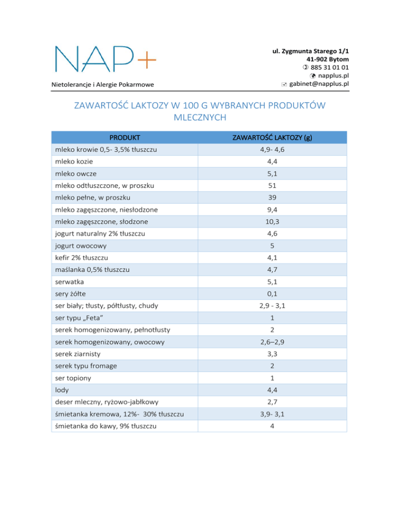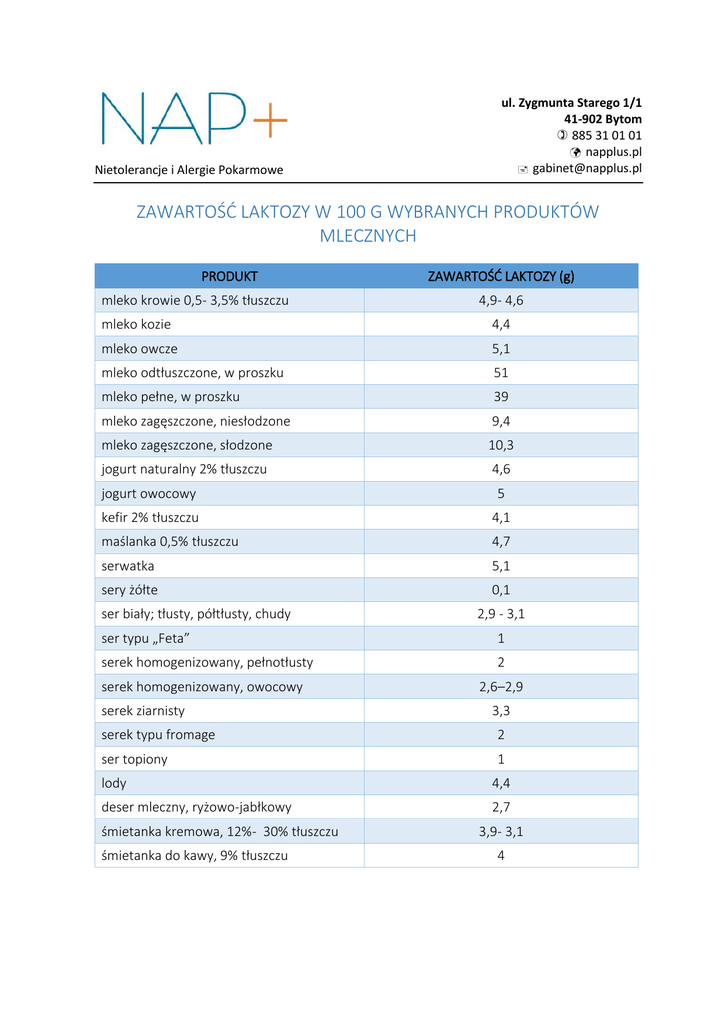 zawartość laktozy w 100 g wybranych produktów mlecznych