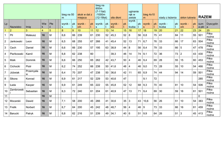bieg na 600m (7-11lat) /1000m (12-19lat) Lp . Nazwisko 1 2 Imię 3 Wie k 4 Płe ć 5 wynik - pk wynik s t cm 8 9 10 uginanie rąk w siła dłoni zwisie wynik pk wynik- pk wynik pk pk t s t kG t liczba t 11 12 13 14 15 16 17 1 Pil Mateusz 16 M 6,6 66 239 61 230 52 45,3 52 8 56 8,8 75 41 84 11 2 Jankowski Leon 16 M 6,5 68 255 67 266 41 45,4 52 13 71 8,7 76 33 66 17 3 Cech Daniel 16 M 6,6 66 230 57 195 63 38,9 44 8 56 8,4 79 33 66 5 4 Pieńkowski Kamil 16 M 6,8 62 238 60 46 14 74 9,1 72 36 73 2 5 Maik Dominik 16 M 6,6 66 250 65 262 42 43,7 50 4 46 9,4 69 28 55 15 6 Cichocki Piotr 16 M 6,2 74 252 66 238 50 41,6 48 4 46 9,0 73 28 55 10 7 Jóźwiak Przemysła w 16 M 6,4 70 207 47 238 50 36,6 42 11 65 8,9 74 44 94 14 8 Sikora Konrad 16 M 6,9 61 217 52 229 53 40,6 47 9 Łada Kacper 16 M 6,9 61 249 65 222 55 45,8 52 12 68 9,3 70 40 81 10 10 Zambrowsk Sebastian i 16 M 6,3 72 240 61 204 61 40,9 47 13 71 9,4 69 30 59 16 16 M bieg na 50 m 11 skok w dal z miejsca 39,3 bieg 4x10 m siady z leżenia wynik - pk wynik s t liczba 18 19 20 9,1 skłon tułowia pk wynik t cm 21 22 72 12 Mocarski Dawid 16 M 7,1 58 200 45 266 41 30,6 35 3 43 10,6 56 26 51 10 13 Frelik Norbert 16 M 6,7 64 200 45 242 48 48,7 56 4 46 9 73 33 66 16 14 Barucki Patryk 16 M 6,8 62 216 51 239 49 34,1 40 6 51 9,9 64 26 51 3 RAZEM pk sum Dyscyplin t a pkt a 23 24 25 Piłka 55 501 nożna Piłka 63 504 nożna Piłka 47 478 nożna Piłka 43 430 nożna Piłka 60 453 nożna Piłka 54 466 nożna Piłka 59 501 nożna Piłka 285 nożna Piłka 54 506 nożna Piłka 61 501 nożna 0 Piłka 54 383 nożna Piłka 61 459 nożna Piłka 45 413 nożna