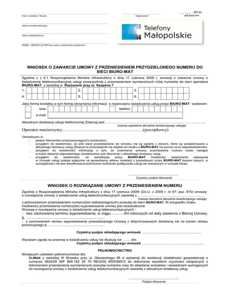 ...................................................................................................................................... Imię i nazwisko / Nazwa .......................................................... miejscowość _ _ - _ _ - 2014r. dd-mm-rrrr ...................................................................................................................................... Adres korespondencyjny ...................................................................................................................................... Adres siedziby(firma) ...................................................................................................................................... PESEL / REGON lub NIP/Typ seria nr dokumentu tożsamości WNIOSEK O ZAWARCIE UMOWY Z PRZENIESIENIEM PRZYDZIELONEGO NUMERU DO SIECI BIURO-MAT Zgodnie z § 6.1 Rozporządzenia Ministra Infrastruktury z dnia 17 czerwca 2009 r. wnoszę o zawarcie umowy o świadczenie telekomunikacyjnej usługi powszechnej z przeniesieniem wymienionych niżej numerów do sieci operatora BIURO-MAT z siedzibą w Rzeszowie przy ul. Szopena 7 1. 2. 3. 4. 5. 6. Jako formę kontaktu w tym formę otrzymania informacji o rozpoczęciu świadczenia usług przez BIURO-MAT wybieram: sms: telefon: e-mail: Aktualnym dostawcą usługi telefonicznej (Dawcą) jest …………………………………………………………………………... (nazwa operatora aktualnie świadczącego usługę) Operator macierzysty:…………………………………………….(początkowy) Oświadczam iż: jestem Abonentem przenoszonego(ch) numeru(ów), przyjąłem do wiadomości, że jeśli dane przedstawione we wniosku nie są zgodne z danymi, które są zarejestrowane u aktualnego dostawcy usług (Dawca) to przeniesienie nie dojdzie do skutku a BIURO-MAT nie ponosi za to odpowiedzialności, przyjąłem do wiadomości informację o tym, że przerwanie procesu przeniesienia numeru może nastąpić w trybie złożenia odpowiedniego oświadczenia woli Abonenta u aktualnego dostawcy usług. przyjąłem do wiadomości, że weryfikacja przez BIURO-MAT możliwości świadczenia wskazanej w Umowie usługi polega wyłącznie na sprawdzeniu adresu instalacji z posiadanymi przez BIURO-MAT bazami danych, w szczególności nie jest weryfikowana techniczna możliwość podłączenia usługi we wskazanym w umowie lokalu .................................................... Czytelny podpis Abonenta WNIOSEK O ROZWIĄZANIE UMOWY Z PRZENIESIENIEM NUMERU Zgodnie z Rozporządzenia Ministra Infrastruktury z dnia 17 czerwca 2009r (Dz.U. z 2009 r. nr 97; poz. 810) wnoszę o rozwiązanie umowy o świadczenie usług telekomunikacyjnych zawartej z …………………………………………………. (nazwa operatora aktualnie świadczącego usługę) z jednoczesnym przeniesieniem numeru(ów) wskazanego(ych) powyżej do sieci BIURO-MAT. W przypadku braku możliwości przeniesienia numeru(ów) wypowiedzenie umowy jest bezskuteczne. Wnoszę o rozwiązanie umowy o świadczenie usług telekomunikacyjnych : bez zachowania terminu wypowiedzenia, w ciągu …..…. dni roboczych od daty zawarcia z Biorcą Umowy, tj. ................................................................................. z zachowaniem okresu wypowiedzenia przewidzianego Umową z dotychczasowym dostawcą lub na koniec okresu promocyjnego tj. …………………………………………. Czytelny podpis składającego wniosek ………………………………………...… Wyrażam zgodę na przerwę w świadczeniu usług nie dłuższą niż …… dni. Czytelny podpis składającego wniosek …………………………………………...… PEŁNOMOCNICTWO Niniejszym udzielam pełnomocnictwa dla: CLIMAX z siedzibą W Brzesku przy ul. Głowackiego 49 d wpisanej do ewidencji działalności gospodarczej o numerze 3924/08 NIP 869 162 25 75 REGON 850538572 do dokonania wszelkich czynności związanych z dokonaniem przeniesienia wymienionych powyżej numerów oraz do składania wniosków i oświadczeń wymaganych do rozwiązania umowy o świadczenie usług telekomunikacyjnych zawartej z aktualnym dostawcą usług. .................................................... Podpis Abonenta