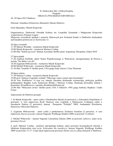 II. Darłowskie Dni z Dobrą Książką Program OBLICZA POLSKIEGO KRYMINAŁU 26 -28 lipca 2012 Darłowo Patronat: Arkadiusz Klimowicz Burmistrz Miasta Darłowo Gość Specjalny: Marek Krajewski Organizatorzy: Darłowski Ośrodek Kultury im. Leopolda Tyrmanda i Małgorzata Krajewska wydawnictwo Primum Legere Miejscem wszystkich spotkań i seansów filmowych jest Terminal Sztuki w Darłówku Zachodnim nad kanałem portowym ul. Kotwiczna 12. 26 lipca czwartek 17.30 Marcin Wroński - rozmawia Marek Krajewski 19.00 Marek Krajewski - rozmawia Mariusz Czubaj 21.00 film "Sekret jej oczu" dramat, kryminał, thriller prod. Argentyna, Hiszpania, Oskar 2010 27 lipca piątek 17.30 Andrzej Zieliński -aktor Teatru Współczesnego w Warszawie, niezapomniany dr Pawica z serialu "Na dobre i na złe" 18.30 Zygmunt Miłoszewski - rozmawia Marek Krajewski 20.00 Michał Witkowski - rozmawia Marek Krajewski 21.30 film "Jennifer 8" thriller prod. USA grają Andy Garcia i Uma Thurman 28 lipca sobota 17.30 Mariusz Czubaj - rozmawia Marek Krajewski 19.00 prof. Tadeusz Cegielski wykład: "Dlaczego warto czytać stare kryminały". 20.30 Noc Profilerów: O tym czy istnieje zbrodnia doskonała rozmawiają: policyjny profiler podinspektor Bogdan Lach, Katarzyna Bonda i Mariusz Czubaj. Dyskusję prowadzą Jolanta i Kazimierz Świetlikowscy z portalu zbrodniawbibliotece.pl 22.00 film "Milczenie owiec" thriller prod. USA 5 Oskarów 1992 grają Anthony Hopkins i Jodie Foster Zaproszenie do Darłowa przyjęli: 1. dr Marek Krajewski - autor cyklu o Eberhardzie Mocku (6 powieści), o Edwardzie Popielskim (3 powieści, w tym najnowsza Rzeki Hadesu) oraz wspólnie z Mariuszem Czubajem cyklu o Jarosławie Paterze (2 powieści), laureat Paszportu "Polityki" 2005, Ambasador Wrocławia, Honorowy Obywatel Darłowa 2. Zygmunt Miłoszewski - autor cyklu o prokuratorze Teodorze Szackim (2 powieści, w tym najnowsza Ziarno prawdy), laureat Nagrody Wielkiego Klaibru 2008 za powieść Uwikłanie 3. Michał Witkowski - laureat Nagrody Literackiej Gdynia 2006 za powieść Lubiewo, autor m.in. powieści Drwal. 4. prof. Mariusz Czubaj - profesor antropologii kultury, autor powieści kryminalnych (dwóch z Markiem Krajewskim oraz m.in. Kołysanka dla mordercy), laureat Nagrody Wielkiego Kalibru 2009 za powieść 21:37. Część akcji najnowszej powieści Zanim znowu zabiję umieścił w Darłowie. 5. Marcin Wroński - autor cyklu czterech powieści o komisarzu Maciejewskim, w tym najnowszej Skrzydlata trumna. Otrzymał trzy nominacje do Nagrody Wielkiego Kalibru Morderstwo pod cenzurą 2008, Kino"Venus" 2009 i Officium Secretum. Pies Pański 2011 6. prof. Tadeusz Cegielski - profesor w Instytucie Historycznym Uniwersytetu Warszawskiego, autor powieści Morderstwo w Alei Róż 7. Katarzyna Bonda - pisarka, scenarzystka, autorka cyklu o detektywie -psychologu policyjnym Hubercie Meyerze, nominowana do Nagrody Wielkiego Kalibru za powieść Sprawa Niny Frank. Współautorka książki Zbrodnia niedoskonała 8. Bogdan Lach - psycholog śledczy, profiler, podinspektor Policji, współautor książki Zbrodnia niedoskonała 9. Andrzej Zieliński - aktor teatralny, filmowy i telewizyjny 10. dr Jolanta i Kazimierz Świetlikowscy - literaturoznawcy, twórcy portalu zbrodniawbibliotece.pl biuro: Arkadiusz Sip tel. 505 186 112 e-mail: [email protected]