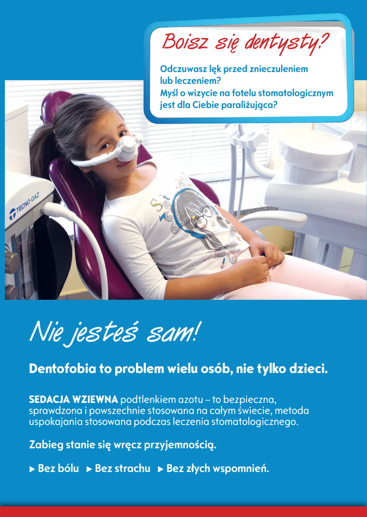 Boisz się dentysty? Odczuwasz lęk przed znieczuleniem lub leczeniem? Myśl o wizycie na fotelu stomatologicznym jest dla Ciebie paraliżująca? Nie jesteś sam! Dentofobia to problem wielu osób, nie tylko dzieci. Sedacja wziewna podtlenkiem azotu – to bezpieczna, sprawdzona i powszechnie stosowana na całym świecie, metoda uspokajania stosowana podczas leczenia stomatologicznego. Zabieg stanie się wręcz przyjemnością. u Bez bólu u Bez strachu u Bez złych wspomnień. Po co sedacja? Uczucie strachu powoduje, że leczenie u stomatologa staje się często przykrym obowiązkiem. Złe wspomnienia i doświadczenia sprawiają, że w konsekwencji unikamy wizyt lub odkładamy je w czasie. Jest na to sposób! Podtlenek azotu pomaga przezwyciężyć strach i niepokój pozostawiając przyjemne uczucie relaksu. Ta metoda jest skuteczna nawet przy bardzo trudnych przypadkach dentofobii! „Pacjenci opisują sedację jak spokojne pływanie w przyjemnym stanie snu” Czy podtlenek azotu jest bezpieczny? Oczywiście stosowanie podtlenku azotu jest bezpieczne. Gaz może być stosowany zarówno u dzieci jaki i dorosłych. Nie uczula, nie podrażnia śluzówek i nie działa na ośrodkowy układ nerwowy. Co ważne, pacjent znajdując się pod wpływem działania gazu zachowuje świadomość i kontrolę nad swoimi reakcjami oraz zmysłami. Przeciwwskazania Zabieg Mieszanina tlenu oraz podtlenku azotu zwana potocznie gazem rozweselającym podawana jest za pomocą maski nosowej. Podczas zabiegu pacjenci odczuwają mrowienie w dłoniach i stopach, uczucie ciepła, dzwonienie w uszach, stan euforii, jak również lekkości lub ciężkości. Już po 3 minutach od zakończenia zabiegu działanie gazu całkowicie ustaje. Niemal od razu można pójść do domu Sedację wyklucza: katar, powiększenie migdałków gardłowych (niedrożność dróg oddechowych), ciężkie choroby płuc - rozstrzenie oskrzeli, rozedma płuc, choroby psychiczne, stwardnienie rozsiane, porfiria, myasthenia gravis, I trymestr ciąży, hipertermia złośliwa, alkoholizm.