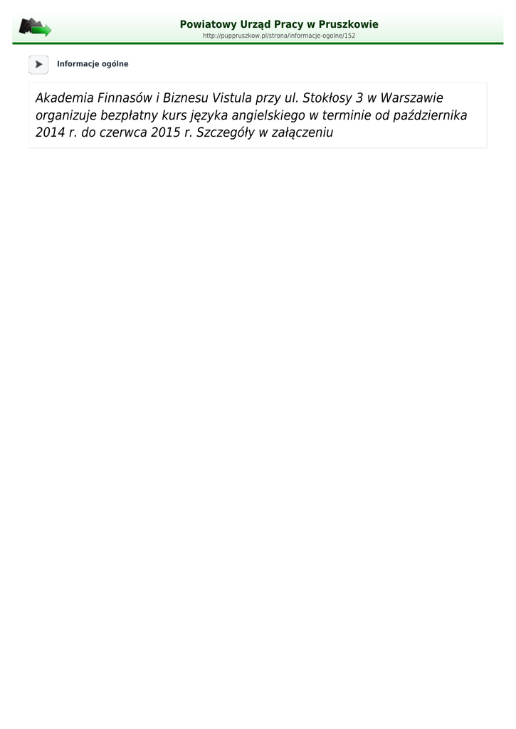 Powiatowy Urząd Pracy w Pruszkowie http://puppruszkow.pl/strona/informacje-ogolne/152 Informacje ogólne Akademia Finnasów i Biznesu Vistula przy ul. Stokłosy 3 w Warszawie organizuje bezpłatny kurs języka angielskiego w terminie od października 2014 r. do czerwca 2015 r. Szczegóły w załączeniu