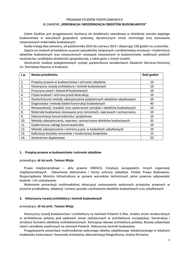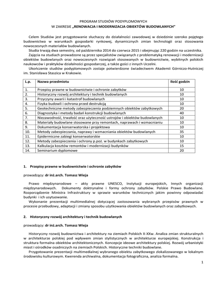 PROGRAM STUDIÓW PODYPLOMOWYCH W ZAKRESIE „RENOWACJA I MODERNIZACJA OBIEKTÓW BUDOWLANYCH” Celem Studiów jest przygotowanie słuchaczy do działalności zawodowej w dziedzinie szeroko pojętego budownictwa w warunkach gospodarki rynkowej, dynamicznych zmian technologii oraz stosowania nowoczesnych materiałów budowlanych. Studia trwają dwa semestry, od października 2014 do czerwca 2015 i obejmując 220 godzin na uczestnika. Zajęcia na studiach prowadzone są przez specjalistów związanych z problematyką renowacji i modernizacji obiektów budowlanych oraz nowoczesnych rozwiązań stosowanych w budownictwie, wybitnych polskich naukowców i praktyków działalności gospodarczej, a także gości z innych Uczelni. Ukończenie studiów podyplomowych zostaje potwierdzone świadectwem Akademii Górniczo-Hutniczej im. Stanisława Staszica w Krakowie. L.p. Nazwa przedmiotu 1. 2. 3. 4. 5. 6. 7. 8. 9. 10. 11. 12. 13. 14. Przepisy prawne w budownictwie i ochronie zabytków Historyczny rozwój architektury i technik budowlanych Przyczyny awarii i katastrof budowlanych Fizyka budowli i ochrona przed destrukcją Geotechniczne metody zabezpieczenia podziemnych obiektów zabytkowych Diagnostyka i metody badań konstrukcji budowlanych Niezawodność, trwałość oraz użyteczność ustrojów i obiektów budowlanych Materiały budowlane stosowane przy remontach, naprawach i wzmacnianiu Dokumentacja konserwatorska i projektowa Metody zabezpieczania, naprawy i wzmacniania obiektów budowlanych Epidermiczne zabiegi konserwatorskie Metody zabezpieczenia i ochrony p.poż. w budynkach zabytkowych Kalkulacja kosztów remontów i modernizacji budynków Seminarium dyplomowe Ilość godzin 10 10 10 10 20 40 10 10 10 35 10 10 15 20 1. Przepisy prawne w budownictwie i ochronie zabytków prowadzący: dr inż.arch. Tomasz Wieja Prawo międzynarodowe – akty prawne UNESCO, Instytucji europejskich, Innych organizacji międzynarodowych. Dokumenty doktrynalne i formy ochrony zabytków. Polskie Prawo Budowlane. Rozporządzenie Ministra Infrastruktury w sprawie warunków technicznych jakim powinny odpowiadać budynki i ich usytuowanie. Wykonanie prezentacji multimedialnej dotyczącej zastosowania wybranych przepisów prawnych w procesie przebudowy, adaptacji i zmiany sposobu użytkowania obiektów budowlanych oraz zabytkowych. 2. Historyczny rozwój architektury i technik budowlanych prowadzący: dr inż.arch. Tomasz Wieja Historyczny rozwój budownictwa i architektury na ziemiach Polskich X-XXw. Analiza zmian strukturalnych w architekturze polskiej pod wpływem zmian stylistycznych w architekturze europejskiej. Konstrukcja i struktura formalna obiektów architektonicznych. Koncepcje ideowe architektury polskiej. Rozwój urbanistyki miast i ośrodków osadniczych na ziemiach Polskich. Historyczne techniki budowlane. Przygotowanie prezentacji multimedialnej wybranego obiektu zabytkowego zlokalizowanego w lokalnym środowisku kulturowym. Kwerenda archiwalna, dokumentacja fotograficzna, analiza formalna. 1 3. Przyczyny awarii i katastrof budowlanych prowadzący: prof. zw., dr hab. inż. Roman KINASH Przedstawienie ogólnej charakterystyki awarii i katastrof budowlanych, ich przyczyn i mechanizmu powstawania oraz zasad rozpoznawania, zabezpieczania i oznakowania miejsca zdarzenia. Zapoznanie słuchaczy z przykładami typowych i najczęstszych awarii, uszkodzeń konstrukcji budowlanych. Zwrócenie uwagi słuchaczy na typowe błędy popełniane podczas projektowania i wykonywania konstrukcji budowlanych. Zasady oceny stanu technicznego konstrukcji i obiektów budowlanych. Ocena stanu zagrożenia awaryjnego. Ogólne charakterystyki awarii i katastrof budowlanych, ich przyczyny i mechanizmy powstawania oraz zasad rozpoznawania, zabezpieczania i oznakowania miejsca zdarzenia. Podstawowe przyczyny katastrof i awarii budowlanych obiektów o konstrukcji betonowych. Uszkodzenia konstrukcji betonowych. Podstawowe przyczyny awarii i katastrof budowlanych obiektów o konstrukcji metalowej. Przykłady awarii stalowych konstrukcji hal, estakad, galerii transportowych, silosów, wież i kominów. Podstawowe przyczyny katastrof i awarii o konstrukcji drewnianych i murowych. Podstawowe przyczyny katastrof i awarii fundamentów. Procedury prawne w przypadku wystąpienia awarii lub katastrofy budowlanej. Tymczasowe zabezpieczenia przed postępująca awarią. 4. Fizyka budowli i ochrona przed destrukcją prowadzący: dr inż. Oksana KINASH Wykłady stanowią przegląd podstawowych zagadnień współczesnej fizyki budowli w zakresie niezbędnym do projektowania architektonicznego. Ćwiczenia audytoryjne uzupełniają treść wykładów i polegają na rozwiązywaniu praktycznych problemów ochrony cieplnej budynków i kształtowania mikroklimatu pomieszczeń zgodnie z obowiązującymi przepisami techniczno-budowlanymi. Wprowadzenie do zagadnień racjonalnego projektowania budynków spełniających współczesne wymagania dotyczące ochrony cieplnej oraz właściwego mikroklimatu pomieszczeń. 5. Geotechniczne metody zabezpieczenia podziemnych obiektów zabytkowych prowadzący: dr hab. inż. Tadeusz MIKOŚ, prof. AGH Zapoznanie się z zagadnieniami ochrony podziemnych obiektów zabytkowych. Ponad 75-letnia działalność Wydziału GIG AGH w tym zakresie ma bogate doświadczenia związane z budownictwem i geotechniką. Po zmianie funkcji użytkowania podziemi zabytkowe obiekty są zabezpieczane i adaptowane na podziemne trasy turystyczne, sanatoria, muzea, miejsca spotkań okolicznościowych i praktyk studenckich. Równocześnie stanowią dziedzinę międzynarodowej współpracy naukowej. Zabytkowe obiekty podziemne i ich systematyka. Specyfika starych podziemi. Geometryczna charakterystyka pustek naturalnych i antropogenicznych. Stan naprężeń w skałach w otoczeniu pustek i budowli podziemnych. Rodzaje stosowanych obudów i ich obciążenie. Stateczność zabytkowych podziemi w aspekcie budowy strukturowej i tekturowej skał. Zagrożenia
