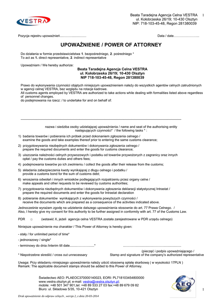 Beata Taradejna Agencja Celna VESTRA ul. Kołobrzeska 26/19; 10-430 Olsztyn NIP: 718-103-45-48, Regon 281380039 Pozycja rejestru upoważnień............................. 1 Data / date…………………... UPOWAŻNIENIE / POWER OF ATTORNEY Do działania w formie przedstawicielstwa 1. bezpośredniego, 2. pośredniego * To act as 1. direct representative, 2. indirect representative Upoważniam / We hereby authorize: Beata Taradejna Agencja Celna VESTRA ul. Kołobrzeska 26/19; 10-430 Olsztyn NIP 718-103-45-48, Regon 281380039 Prawo do wykonywania czynności objętych niniejszym upoważnieniem należy do wszystkich agentów celnych zatrudnionych w agencji celnej VESTRA, bez względu na rotacje kadrowe. All customs agents employed by VESTRA are authorized to take actions while dealing with formalities listed above regardless of personnel changes. do podejmowania na rzecz: / to undertake for and on behalf of: --------------------------------------------------------------------------------------------------------------------------------------------------nazwa i siedziba osoby udzielającej upoważnienia / name and seat of the authorising entity następujących czynności* / the following tasks * : 1) badania towarów i pobierania ich próbek przed dokonaniem zgłoszenia celnego / examine the goods and take examples thereof prior to entering the same customs clearance; 2) przygotowywania niezbędnych dokumentów i dokonywania zgłoszenia celnego / prepare the required documents and enter the goods for customs clearance; 3) uiszczania należności celnych przywozowych i podatku od towarów przywożonych z zagranicy oraz innych opłat / pay the customs duties and others fees; 4) podejmowania towarów po ich zwolnieniu / collect the goods after their release from the customs; 5) składania zabezpieczenia kwoty wynikającej z długu celnego i podatku / provide a customs bond for the sum of customs debt; 6) wnoszenia odwołań i innych wniosków podlegających rozpatrzeniu przez organy celne / make appeals and other requests to be reviewed by customs authorities; 7) przygotowania niezbędnych dokumentów i dokonywania zgłoszenia deklaracji statystycznej Intrastat / prepare the required documents and enter the goods for Intrastat declaration 8) pobieranie dokumentów wynikających z wykonywania powyższych czynności / receive the documents which are prepared as a consequence of the activities indicated above. Jednocześnie wyrażam zgodę na udzielenie dalszego upoważnienia stosownie do art. 77 Prawa Celnego. / Also, I hereby give my consent for this authority to be further assigned in conformity with art. 77 of the Customs Law. PDR □ (wstawić X, jeżeli agencja celna VESTRA została zarejestrowane w PDR urzędu celnego) Niniejsze upoważnienie ma charakter / This Power of Attorney is hereby given: - stały / for unlimited period of time* - jednorazowy / single* - terminowy do dnia /interim till date...........................* * Niepotrzebne skreślić / cross out unnecessary ................................................................ (pieczęć i podpis upoważniającego / Stamp and signature of the company’s authorized representative Uwaga: Przy składaniu niniejszego upoważnienia należy uiścić stosowną opłatę skarbową ( w wysokości 17PLN ) Remark: The applicable document stamps should be added to this Power of Attorney. Świadectwo AEO: PLAEOC370000140023, EORI: PL718103454800000 www.vestra.olsztyn.pl; e-mail: [email protected]; mobile: +48 501 347 901,tel: +48 89 533 27 03 fax:+48 89 679 09 82 Biuro: ul. Składowa 5/35, 10-421 Olsztyn Druk upoważnienie do odpraw celnych , wersja 2, z dnia 20-03-2014 1 Beata Taradejna Agencja Celna VESTRA ul. Kołobrzeska 26/19; 10-430 Olsztyn NIP: 718-103-45-48, Regon 281380039 2 Dane mocodawcy: Information concerning authorising entity: Imię, nazwisko, nr tel.osoby odpowiedzialnej za sprawy finansowe / Name, surname and telephone number of the person responsible for financial issues Regon NIP / VAT no. EORI Imię, nazwisko, nr tel. i fax-u osoby zajmującej się tą sprawą/ Name, surname and telephone fax number of the person responsible for this matter e-mail: Nazwa banku i nr konta / Name of the bank and account number Zobowiązanie mocodawcy Obligation of the authorising entity: Niniejszym zobowiązuje się do pokrycia na rzecz agencji celnej VESTRA, wszelkich kwot wynikających z wykonanych czynności agencyjnych, a w szczególności zwrotu należności: z tytułu długu celnego, naliczonych prowizji i opłat zgodnie z aktualnie obowiązującym cennikiem agencji celnej VESTRA/ We hereby obligate to cover all obligations that would arise as a consequences of services provided by VESTRA in peculiarity in regard with custom duties, counted commissions and fees according to VESTRA tariff in force./ Ponadto zobowiązuje się, na życzenie agencji celnej VESTRA dokonać przedpłaty kwot potrzebnych na zabezpieczenie wyżej wymienionych należności/ Also we hereby obligate, if VESTRA requires, we are going to make payments to ensure above obligations. _____________________________________ (pieczęć imienna i podpis osoby mogącej składać oświadczenia woli lub osoby upoważnionej / Stamp and signature of the company’s authorized representative) Do upoważnienia bezwzględnie należy dołączyć odpisy: dokumentu „REGON”, wyciągu z „KRS” lub „Zaświadczenia o wpisie do ewidencji działalności gospodarczej”, Zezwolenia – koncesji, jeśli działalność gospodarcza objęta jest wymogiem jej uzyskania, decyzji w sprawie nadania numeru identyfikacyjnego NIP. The documents confirming register of the company in the national register should be attached to the Power of Attorney. W przypadku odwołania upoważnienia, zmiany adresu, nazwy Klienta zobowiązuję się do pisemnego powiadomienia o tym fakcie Agencję Celną VESTRA, oraz aktualizacji PDR I undertake to notify Vestra in writing ant to update PDR if I withdraw this P