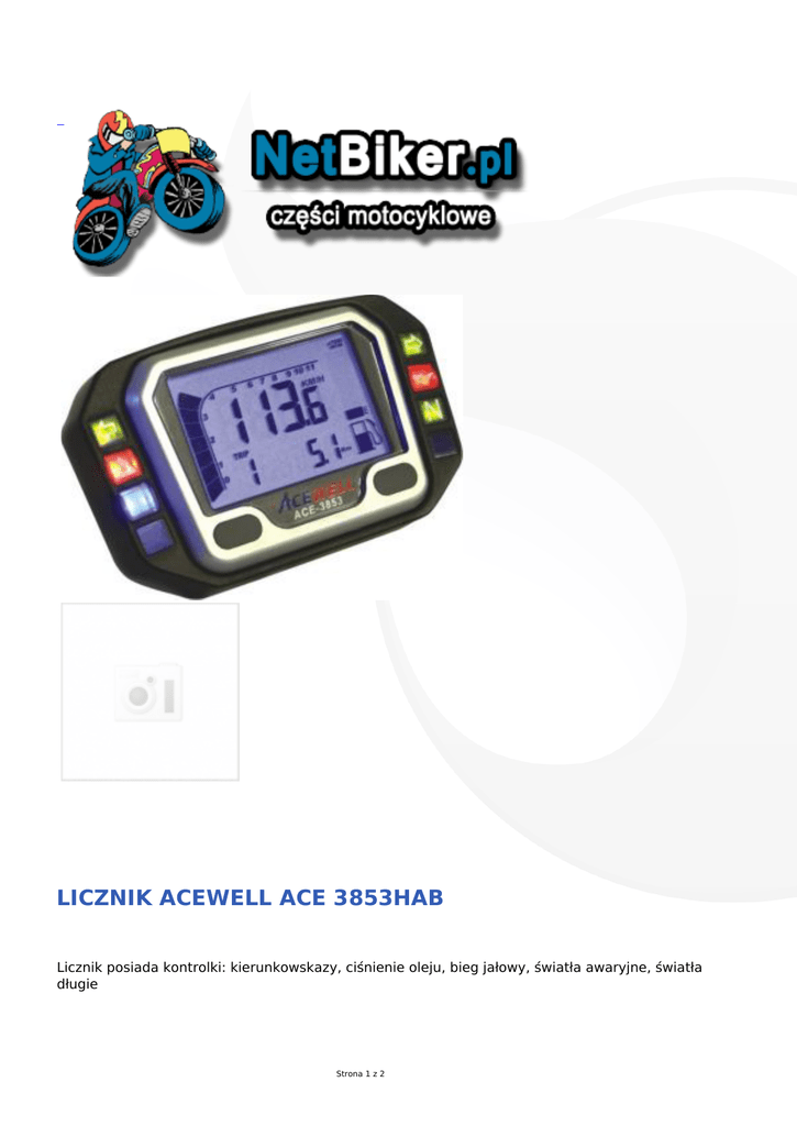 LICZNIK ACEWELL ACE 3853HAB Licznik posiada kontrolki: kierunkowskazy, ciśnienie oleju, bieg jałowy, światła awaryjne, światła długie Strona 1 z 2 Funkcje: Zakres: Wskazania - obrotomierz analogowany 500÷11000 obr/min (co 500 obr/min) - obrotomierz cyfrowy 100÷19900 obr/min (co 100 obr/min) - prędkościomierz 2,4÷300 km/h (co 0,1 km/h) - pamięć prędkości maksymalnej 2,4÷300 km/h (co 0,1 km/h) - średnia prędkość przejazdu 2,4÷300 km/h (co 0,1 km/h) - 1+2 licznik kilometrów okresowe 0÷9999,9 km (co 0,1 km) - licznik kilometrów całkowity 0÷99999,9 km (co 0,1 km) - licznik motogodzin okresowy 0÷99godz.59min59sek (co 1sek) - licznik motogodzin całkowity 0÷9999godz.59min59sek (co 1 sek) - wskaźnik poziomu paliwa - analogowy Właściwości: - wymiary: 125x78x28,5mm - prędkościomierz do 399 km/h - zegarek - wodoodporny - wszystkie połączenia przewodów - wodoodporne - odporny na wibracje (8G) - odporny na uderzenia (100G) - temp. pracy -25°C÷+85°C - zasilanie - 12V W zestawie z licznikiem: -wiązki instalacji do podłączenia licznika -uchwyt mocujący licznik -przejście z napędu linki licznika mechanicznej na sygnał elektroniczny -obrotomierz zasilany sygnałem z modułu zapłonu lub impulsem z cewki zapłonowej (opcja dodatkowa : przejście z napędu linki mechanicznej na sygnał elektroniczny) Po odłączeniu zasilania komputer zachowuje wskazania przebiegu całkowitego oraz ilości motogodzin całkowitych. Homologacja E13 10R-022812 Strona 2 z 2