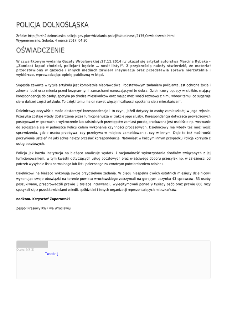 POLICJA DOLNOŚLĄSKA Źródło: http://arch2.dolnoslaska.policja.gov.pl/wr/dzialania-policji/aktualnosci/2175,Oswiadczenie.html Wygenerowano: Sobota, 4 marca 2017, 04:30 OŚWIADCZENIE W czwartkowym wydaniu Gazety Wrocławskiej /27.11.2014 r./ ukazał się artykuł autorstwa Marcina Rybaka – „Zamiast łapać złodziei, policjant będzie … nosił listy!”. Z przykrością należy stwierdzić, że materiał przedstawiony w gazecie i innych mediach zawiera insynuacje oraz przedstawia sprawę nierzetelnie i wybiórczo, wprowadzając opinię publiczną w błąd. Sugestia zawarta w tytule artykułu jest kompletnie nieprawdziwa. Podstawowym zadaniem policjanta jest ochrona życia i zdrowia ludzi oraz mienia przed bezprawnymi zamachami naruszającymi te dobra. Dzielnicowy będący w służbie, mający korespondencję do osoby, spotyka po drodze mieszkańców oraz mając możliwości rozmowy z nimi, wbrew temu, co sugeruje się w dalszej części artykułu. To dzięki temu ma on nawet więcej możliwości spotkania się z mieszkańcami. Dzielnicowy oczywiście może dostarczyć korespondencje i to czyni, jeżeli dotyczy to osoby zamieszkałej w jego rejonie. Przesyłka zostaje wtedy dostarczona przez funkcjonariusza w trakcie jego służby. Korespondencja dotycząca prowadzonych postępowań w sprawach o wykroczenie lub zaistniałych przestępstw zamiast pocztą przekazana jest osobiście np. wezwanie do zgłoszenia się w jednostce Policji celem wykonania czynności procesowych. Dzielnicowy ma wtedy też możliwość sprawdzenia, gdzie osoba przebywa, czy przebywa w miejscu zameldowania, czy w innym. Daje to też możliwość poczynienia ustaleń na jaki adres należy przesłać korespondencje. Natomiast w każdym innym przypadku Policja korzysta z usług pocztowych. Policja jak każda instytucja na bieżąco analizuje wydatki i racjonalność wykorzystania środków związanych z jej funkcjonowaniem, w tym kwestii dotyczących usług pocztowych oraz właściwego doboru przesyłek np. w zależności od potrzeb wysyłanie listu normalnego lub listu poleconego za zwrotnym potwierdzeniem odbioru. Dzielnicowi na bieżąco wykonują swoje przydzielone zadania. W ciągu niespełna dwóch ostatnich miesięcy dzielnicowi wykonując swoje obowiązki na terenie powiatu wrocławskiego zatrzymali na gorącym uczynku 43 sprawców, 53 osoby poszukiwane, przeprowadzili prawie 3 tysiące interwencji, wylegitymowali ponad 9 tysięcy osób oraz prawie 600 razy spotykali się z przedstawicielami osiedli, spółdzielni i innych organizacji reprezentujących mieszkańców. nadkom. Krzysztof Zaporowski Zespół Prasowy KWP we Wrocławiu Ocena: 0/5 (1) Tweetnij