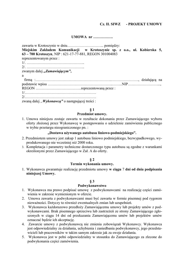 Cz. II. SIWZ - PROJEKT UMOWY UMOWA nr ……………. zawarta w Krotoszynie w dniu………………………... pomiędzy: Miejskim Zakładem Komunikacji w Krotoszynie sp. z o.o., ul. Kobierska 5, 63 – 700 Krotoszyn, NIP : 621-17-77-881, REGON 301004083 reprezentowanym przez : 1/. ……………………………………….. 2/. ……………………………………….. zwanym dalej „Zamawiającym”, a firmą :……………………………………………………..…………………., działającą na podstawie wpisu ……………………………………………..……..NIP……………………..., REGON ……………………………….reprezentowaną przez : 1/.………………………………………………… 2/.………………………………………………… zwaną dalej „Wykonawcą” o następującej treści : §1 Przedmiot umowy. 1. Umowa niniejsza zostaje zawarta w rezultacie dokonania przez Zamawiającego wyboru oferty złożonej przez Wykonawcę w postępowaniu o udzielenie zamówienia publicznego w trybie przetargu nieograniczonego pn. : „Dostawa używanego autobusu liniowo-podmiejskiego”. 2. Przedmiotem umowy jest zakup 1 autobusu liniowo podmiejskiego, bezwypadkowego, wyprodukowanego nie wcześniej niż 2000 roku. 3. Kompletacja i parametry techniczne dostarczonego typu autobusu są zgodne z warunkami określonymi przez Zamawiającego w Zał. A do oferty. §2 Termin wykonania umowy. 1. Wykonawca gwarantuje realizację przedmiotu umowy w ciągu 7 dni od dnia podpisania niniejszej Umowy. 1. 2. 3. 4. 5. §3 Podwykonawstwo Wykonawca ma prawo podpisać umowę z podwykonawcami na realizację części zamówienia w zakresie wymienionym w ofercie. Umowa zawarta z podwykonawcami musi być zawarta w formie pisemnej pod rygorem nieważności. Dotyczy to również ewentualnych zmian lub uzupełnień. Wykonawca każdorazowo przedłoży Zamawiającemu umowy lub projekty umów z podwykonawcami. Brak pisemnego sprzeciwu lub zastrzeżeń ze strony Zamawiającego zgłoszonych w ciągu 14 dni od przekazania Zamawiającemu umów lub projektów umów oznaczać będzie ich akceptację. Zawarcie umowy z podwykonawcą nie zmienia zobowiązań Wykonawcy. Wykonawca jest odpowiedzialny za działania, uchybienia i zaniedbania podwykonawcy, jego przedstawicieli lub pracowników w takim samym zakresie jak za swoje działania. Wykonawca jest w pełni odpowiedzialny w stosunku do Zamawiającego za zlecone do podwykonania części zamówienia. 2 §4 Cena i warunki płatności. 1. Za realizację przedmiotu umowy obowiązuje cena netto: ………………………. PLN, słownie: …………….……………………………………………………………..PLN, Podatek VAT według stawki …………..% w wysokości ……………….PLN, Wartość brutto umowy : .…………………………………….PLN. słownie: ……………………………………………………………………..PLN. 2. Warunki płatności za realizację przedmiotu umowy: Zapłata nastąpi na podstawie faktury VAT - wystawionej przez Wykonawcę, po podpisaniu przez upoważnionego przedstawiciela (przedstawicieli) Zamawiającego protokołu odbioru autobusu bez uwag co do wyposażenia i kompletacji - w terminie do 7 dni od momentu dostarczenia faktury VAT. Zapłata dokonana zostanie w formie przelewu na konto Wykonawcy w banku ..........................................................................................nr konta .................................... Za datę zapłaty strony uznają dzień przyjęcia wykonania przelewu przez bank prowadzący rachunek Zamawiającego. 3. Zapłata dokonana będzie w formie przelewu z konta Zamawiającego : nr ……………………… na konto Wykonawcy nr ………………………………………. 1. 2. 3. 4. §5 Odbiór przedmiotu umowy. Odbioru autobusu dokona upoważniony przedstawiciel (przedstawiciele) Zamawiającego. Potwierdzeniem odbioru autobusu w wersji zgodnej z warunkami określonymi w SIWZ, będzie podpisanie przez upoważnionego przedstawiciela (przedstawicieli) Zamawiającego protokołu odbioru autobusu. Za datę dostawy uważa się dzień podpisania przez Zamawiającego protokołu odbioru autobusu. W odbiorze autobusu bierze udział upoważniony przedstawiciel Wykonawcy, który składa podpis na protokole odbioru, potwierdzając fakt przekazania autobusu. §6 Dokumentacja techniczna Wykonawca przekaże Zamawiającemu w dniu odbioru autobusu książkę przeglądów i serwisowania potwierdzającą rzeczywisty przebieg autobusu. §7 Kary umowne 1. Wykonawca zapłaci Zamawiającemu kary umowne: a. Za odstąpienie od Umowy z przyczyn leżących po stronie Wykonawcy w wysokości 10 % wartości Umowy. b. Za niedotrzymanie terminu dostawy - w wysokości 0,2 % wartości umowy za każdy dzień zwłoki; 2. Kary umowne określone w ust 1 Zamawiający ma prawo potrącić z należności przysługujących Wykonawcy za dostawę autobusu. 3. W przypadku, jeżeli szkoda Zamawiającego z tytułu nie wykonania lub nienależytego wykonania umowy jest wyższa niż naliczane kary umowne, Wykonawca zapłaci Zamawiającemu odszkodowanie w zakresie, w jakim szkoda przewyższa kary umowne. 3 4. W przypadku zwłoki Zamawiającego w płatności zobowiązań określonych w §2 niniejszej umowy, Wykonawca może żądać od Zamawiającego za okres zwłoki zapłaty ustawowych odsetek od kwot uregulowanych z opóźnieniem. 5. Wykonawca nie może dokonać cesji wierzytelności wynikających z niniejszej umowy bez pisemnej zgody Zamawiającego. 1. 2. 3. 4. 5. 6. 7. §8 Postanowienia końcowe. Wszystkie zmiany w treści umowy oraz załącznikach stanowiących jej części mogą nastąpić wyłącznie w formie pisemnej pod rygorem nieważności. Zamawiający dopuszcza zmianę treści zawartej umowy w następujących przypadkach : a) działania siły wyższej, za którą uważa się zdarzenie o charakterze nadzwyczajnym, wyst