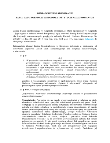 OŚWIADCZENIE O STOSOWANIU ZASAD ŁADU KORPORACYJNEGO DLA INSTYTUCJI NADZOROWANYCH Zarząd Banku Spółdzielczego w Księżpolu oświadcza, że Bank Spółdzielczy w Księżpolu i jego organy w zakresie swoich kompetencji będą stosować Zasady Ładu Korporacyjnego dla instytucji nadzorowanych, przyjętych uchwałą Komisji Nadzoru Finansowego Nr 218/2014 z dnia 22 lipca 2014 roku (Dz. Urz. KNF poz. 17), stanowiące Załącznik do niniejszego oświadczenia. Jednocześnie Zarząd Banku Spółdzielczego w Księżpolu informuje o odstąpieniu od stosowania częściowo Zasad Ładu Korporacyjnego dla instytucji nadzorowanych, a mianowicie: 1) § 6: „§ 6. 1. W przypadku wprowadzenia instytucji nadzorowanej anonimowego sposobu powiadamiania organu nadzorującego lub organu nadzorującego o nadużyciach w tejże instytucji, powinna być zapewniona możliwość korzystania z tego narzędzia przez pracowników bez obawy negatywnych konsekwencji ze strony kierownictwa i innych pracowników instytucji nadzorowanej. 2. Organ zarządzający powinien przedstawić organowi nadzorującemu raporty dotyczące powiadomień o poważnych nadużyciach.” Zgodnie z wyjaśnieniami zawartymi w opublikowanym przez Urząd Komisji Nadzoru Finansowego dokumencie „Pytania i odpowiedzi” odstąpienie od przestrzegania zapisu § 6 nie wymaga uzasadnienia. 2) § 8 ust. 4 w części dotyczącej: „zapewnienie możliwości elektronicznego aktywnego udziału w posiedzeniach organu stanowiącego.” Uzasadnienie: Powołując się na zasadę proporcjonalności wynikającą ze skali, charakteru działalności oraz specyfiki działalności prowadzonej przez Bank, odstępuję się od przestrzegania zasady dotyczącej umożliwienia elektronicznego udziału wszystkim członkom w posiedzeniach organu stanowiącego. W ocenie Banku spełnienie powyższej zasady nie znajduje zastosowania przy uwzględnieniu specyfiki działalności banku spółdzielczego, którego większość właścicieli stanowią mieszkańcy lokalnego środowiska. Ponadto zgodnie ze Statutem Banku zawiadomienia członków o czasie, miejscu i porządku obrad Zebrania Przedstawicieli wysyłane są za zwrotnym potwierdzeniem odbioru lub listem poleconym, co najmniej 21 dni przed terminem obrad. Tak uregulowany sposób informowania członków Banku gwarantuje możliwość ich osobistego uczestnictwa w Zebraniu Przedstawicieli. Bank nie jest przygotowany pod względem technicznym i organizacyjnym do wykonywania tej zasady. Dodatkowo jej wprowadzenie wiąże się ze znacznymi kosztami, które w ocenie Banku są nieuzasadnione. Powyższe uzasadnia rezygnację z organizacji posiedzeń organu stanowiącego poprzez zdalny, elektroniczny udział członków. Ponadto w Banku Spółdzielczym w Księżpolu nie mają zastosowania Zasady Ładu Korporacyjnego dla instytucji nadzorowanych, zawarte w § 11, § 22 ust. 1 i 2 oraz ust. 4 - 6 w części dotyczącej komitetu audytu, § 53, § 54, § 55, § 56, § 57, gdyż nie dotyczą Banku. Księżpol, 30.12.2014r. ZA ZARZĄD BS KSIĘŻPOL ZA RADĘ NADZORCZĄ BS KSIEŻPOL PREZES ZARZĄDU PRZEWODNICZĄCY RADY NADZORCZEJ JANINA WOLANIN STANISŁAW SKWAREK