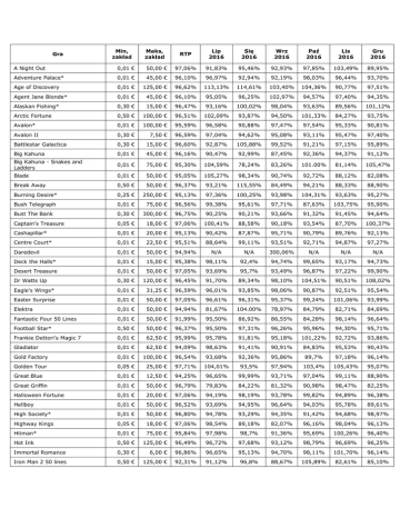 Gra Min, zakład Maks, zakład RTP Lip 2016 Się 2016 Wrz 2016 Paź 2016 Lis 2016 Gru 2016 A Night Out 0,01 € 50,00 € 97,06% 91,83% 95,46% 92,93% 97,85% 103,49% 89,95% Adventure Palace* 0,01 € 45,00 € 96,10% 96,97% 92,94% 92,19% 98,03% 96,44% 93,70% Age of Discovery 0,01 € 125,00 € 96,62% 113,13% 114,61% 103,40% 104,36% 90,77% 97,51% Agent Jane Blonde* 0,01 € 45,00 € 96,10% 95,05% 96,25% 102,97% 94,57% 97,40% 94,35% Alaskan Fishing* 0,30 € 15,00 € 96,47% 93,16% 100,02% 98,04% 93,63% 89,56% 101,12% Arctic Fortune 0,50 € 100,00 € 96,51% 102,09% 93,87% 94,50% 101,33% 84,27% 93,75% Avalon* 0,01 € 100,00 € 95,59% 96,58% 90,88% 97,47% 97,54% 95,33% 90,81% Avalon II 0,30 € 7,50 € 96,59% 97,04% 94,62% 95,08% 93,11% 95,47% 97,40% Battlestar Galactica 0,30 € 15,00 € 96,60% 92,87% 105,88% 99,52% 91,21% 97,15% 95,89% Big Kahuna 0,01 € 45,00 € 96,16% 90,47% 92,99% 87,45% 92,36% 94,37% 91,12% Big Kahuna - Snakes and Ladders 0,01 € 75,00 € 95,30% 104,59% 78,24% 83,26% 101.00% 81,14% 105,47% Blade 0,01 € 50,00 € 95,05% 105,27% 98,34% 90,74% 92,72% 88,12% 82,08% Break Away 0,50 € 50,00 € 96,37% 93,21% 115,55% 84,49% 94,21% 88,33% 88,90% Burning Desire* 0,25 € 250,00 € 95,13% 97,36% 100,25% 93,98% 104,31% 93,63% 95,27% Bush Telegraph 0,01 € 75,00 € 96,56% 99,38% 95,61% 97,71% 87,63% 103,75% 95,90% Bust The Bank 0,30 € 300,00 € 96,75% 90,25% 90,21% 93,66% 91,32% 91,45% 94,64% Captain's Treasure 0,05 € 18,00 € 97,06% 100,41% 88,58% 90,18% 93,54% 87,70% 100,37% Cashapillar* 0,01 € 20,00 € 95,13% 90,42% 87,87% 95,71% 90,79% 89,76% 92,13% Centre Court* 0,01 € 22,50 € 95,51% 88,64% 99,11% 93,51% 92,71% 94,87% 97,27% Daredevil 0,01 € 50,00 € 94,94% N/A N/A 300,06% N/A N/A N/A Deck the Halls* 0,01 € 15,00 € 95,38% 98,11% 92,4% 94,74% 99,65% 93,17% 94,73% Desert Treasure 0,01 € 50,00 € 97,05% 93,69% 95,7% 93,49% 96,87% 97,22% 99,90% Dr Watts Up 0,30 € 120,00 € 96,45% 91,70% 89,34% 98,10% 104,51% 90,51% 108,02% Eagle's Wings* 0,01 € 31,25 € 96,59% 96,01% 93,85% 98,06% 90,87% 92,51% 95,54% Easter Surprise 0,01 € 50,00 € 97,05% 96,61% 96,31% 95,37% 99,24% 101,06% 93,99% Elektra 0,01 € 50,00 € 94,94% 81,67% 104.00% 78,97% 84,79% 82,71% 84,69% Fantastic Four 50 Lines 0,01 € 50,00 € 91,99% 95,50% 86,92% 86,55% 84,28% 98,14% 96,64% Football Star* 0,50 € 50,00 € 96,37% 95,50% 97,31% 96,26% 95,96% 94,30% 95,71% Frankie Dettori's Magic 7 0,01 € 62,50 € 95,99% 95,78% 91,81% 95,18% 101,22% 92,72% 93,86% Gladiator 0,01 € 62,50 € 94,09% 98,63% 91,41% 90,91% 84,83% 95,53% 90,43% Gold Factory 0,01 € 100,00 € 96,54% 93,68% 92,36% 95,86% 89,7% 97,18% 96,14% Golden Tour 0,05 € 25,00 € 97,71% 104,01% 93,5% 97,94% 103,4% 105,43% 95,07% Great Blue 0,01 € 12,50 € 94,25% 96,65% 99,99% 93,71% 97,04% 99,11% 88,90% Great Griffin 0,01 € 50,00 € 96,79% 79,83% 84,22% 81,32% 90,98% 98,47% 82,25% Halloween Fortune 0,01 € 20,00 € 97,06% 94,19% 98,19% 93,78% 99,82% 94,89% 96,38% Hellboy 0,01 € 50,00 € 96,52% 93,69% 94,95% 96,64% 94,03% 95,78% 89,61% High Society* 0,01 € 50,00 € 96,80% 94,78% 93,29% 94,35% 91,42% 94,68% 98,97% Highway Kings 0,05 € 18,00 € 97,06% 98,54% 89,18% 82,07% 96,16% 98,04% 96,13% Hitman* 0,01 € 75,00 € 95,84% 97,98% 98,7% 91,36% 95,69% 100,26% 96,40% Hot Ink 0,50 € 125,00 € 96,49% 96,72% 97,68% 93,12% 98,79% 96,69% 96,25% Immortal Romance 0,30 € 6,00 € 96,86% 96,65% 95,13% 94,70% 98,11% 101,70% 96,14% Iron Man 2 50 lines 0,50 € 125,00 € 92,31% 91,12% 96,8% 88,67% 105,89% 82,61% 85,10% Isis* 0,25 € 62,50 € 95,15% 95,93% 88,27% 84,94% 96,13% 90,04% 96,75% Jason and the Golden Fleece 0,25 € 125,00 € 95,77% 98,85% 92,7% 107,32% 89,97% 102,83% 95,28% Jurassic Park 0,30 € 15,00 € 96,67% 92,34% 93,05% 95,35% 101,61% 93,91% 93,05% Karate Pig 0,01 € 20,00 € 96,52% 102,16% 90,91% 91,69% 91,82% 98,33% 92,76% Kings of Cash 0,01 € 75,00 € 96,68% 98,52% 88,9% 95,71% 93,82% 89,57% 101,06% King Kong the Eighth Wonder of the World 0,01 € 20,00 € 95,50% 103,44% 93,79% 87,54% 93,3% 98,02% 89,66% Ladies Nite* 0,09 € 45,00 € 96,10% N/A N/A 102,47% 98,35% 99,75% 91,13% Loaded 0,01 € 125,00 € 96,56% 97,15% 105,7% 72,68% 89,72% 95,66% 95,60% Lotto Madness 0,01 € 50,00 € 97,06% 93,08% 99,3% 95,13% 98,38% 105,19% 91,29% Lucky Witch 0,01 € 60,00 € 96,39% 100,89% 91,93% 91,09% 99,24% 83,08% 178,94% Mad Hatters 0,01 € 75,00 € 96,08% 99,24% 103,24% 80,88% 107,14% 90,78% 90,48% Mayan Princess* 0,20 € 40,00 € 96,45% 95,64% 96,02% 101,70% 93,22% 94,78% 99,87% Mermaids Millions* 0,01 € 75,00 € 96,56% 96,76% 96,12% 97,19% 98,96% 95,21% 96,02% Pink Panther 0,01 € 100,00 € 97,06% 92,43% 96,69% 88,36% 93,53% 90,32% 92,73% Prime Property 0,01 € 50,00 € 95,99% 86,14% 132,69% 90,43% 102,89% 100,85% 104,08% Pure Platinum* 0,01 € 20,00 € 96,49% 96,81% 92,12% 95,20% 97,38% 100,12% 97,17% Retro Reels - Diamond Glitz 0,01 € 125,00 € 96,47% 98,78% 103,23% 82,91% 92,64% 86,62% 97,04% Riviera Riches 0,01 € 150,00 € 96,51% 95,12% 93,16% 89,38% 90,37% 99,39% 87,31% Robojack 0,30 € 30,00 € 95,77% 94,29% 95,67% 93,56% 90,2% 94,77% 91,95% Rocky 0,01 € 62,50 € 95,02% 93,38% 101,03% 96,84% 99,48% 92,91% 99,62% Santa's Wild Ride 0,30 € 7,50 € 96,47% 95,73% 104,22% 97,44% 100,88% 90,38% 80,67% Scrooge 0,01 € 250,00 € 96,74% 95,48% 98,29% 93,49% 99,65% 94,91% 92,46% Soccer Safari 0,01 € 30,00 € 96,54% 97,34% 101,04% 95,76% 95,6% 98,39% 94,40% Spring Break* 0,09 € 45,00 € 96,10% N/A N/A N/A 95,32% 91,99% 93,44% Terminator II 0,30 € 30,00 € 96,75% 97,30% 94,46% 87,35% 91,3% 95,22% 94.00% The Dark Knight Rises 0,30 € 7,50 € 96,43% N/A N/A N/A N/A N/A N/A The Incredible Hulk 50 lines 0,01 € 125,00 € 91.00% 86,93% 90,03% 92,39% 86,87% 89,49% 86,80% The Twisted Circus* 0,30 € 120,00 € 96,36% 93,31% 99,69% 100,10% 95,96% 97,68% 96,25% Thor The Mighty Avenger 0,30 € 30,00 € 91,92% 90,80% 87,55% 90,35% 88,83% 80,