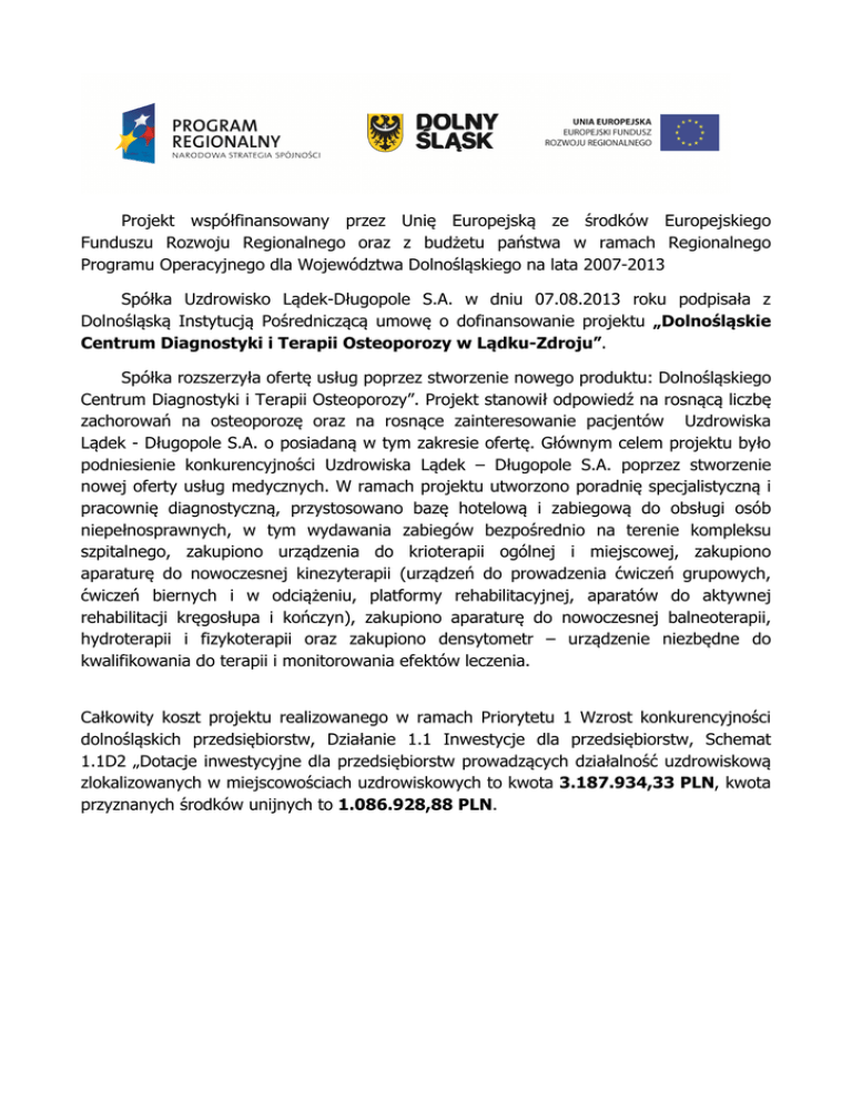 Projekt współfinansowany przez Unię Europejską ze środków Europejskiego Funduszu Rozwoju Regionalnego oraz z budżetu państwa w ramach Regionalnego Programu Operacyjnego dla Województwa Dolnośląskiego na lata 2007-2013 Spółka Uzdrowisko Lądek-Długopole S.A. w dniu 07.08.2013 roku podpisała z Dolnośląską Instytucją Pośredniczącą umowę o dofinansowanie projektu „Dolnośląskie Centrum Diagnostyki i Terapii Osteoporozy w Lądku-Zdroju”. Spółka rozszerzyła ofertę usług poprzez stworzenie nowego produktu: Dolnośląskiego Centrum Diagnostyki i Terapii Osteoporozy”. Projekt stanowił odpowiedź na rosnącą liczbę zachorowań na osteoporozę oraz na rosnące zainteresowanie pacjentów Uzdrowiska Lądek - Długopole S.A. o posiadaną w tym zakresie ofertę. Głównym celem projektu było podniesienie konkurencyjności Uzdrowiska Lądek – Długopole S.A. poprzez stworzenie nowej oferty usług medycznych. W ramach projektu utworzono poradnię specjalistyczną i pracownię diagnostyczną, przystosowano bazę hotelową i zabiegową do obsługi osób niepełnosprawnych, w tym wydawania zabiegów bezpośrednio na terenie kompleksu szpitalnego, zakupiono urządzenia do krioterapii ogólnej i miejscowej, zakupiono aparaturę do nowoczesnej kinezyterapii (urządzeń do prowadzenia ćwiczeń grupowych, ćwiczeń biernych i w odciążeniu, platformy rehabilitacyjnej, aparatów do aktywnej rehabilitacji kręgosłupa i kończyn), zakupiono aparaturę do nowoczesnej balneoterapii, hydroterapii i fizykoterapii oraz zakupiono densytometr – urządzenie niezbędne do kwalifikowania do terapii i monitorowania efektów leczenia. Całkowity koszt projektu realizowanego w ramach Priorytetu 1 Wzrost konkurencyjności dolnośląskich przedsiębiorstw, Działanie 1.1 Inwestycje dla przedsiębiorstw, Schemat 1.1D2 „Dotacje inwestycyjne dla przedsiębiorstw prowadzących działalność uzdrowiskową zlokalizowanych w miejscowościach uzdrowiskowych to kwota 3.187.934,33 PLN, kwota przyznanych środków unijnych to 1.086.928,88 PLN.