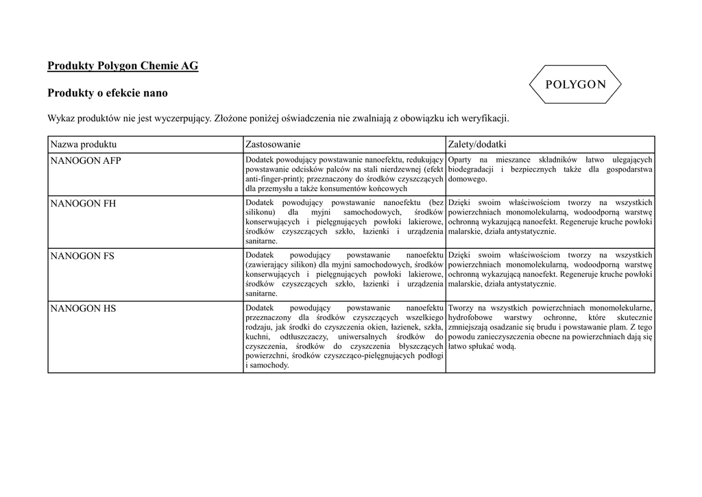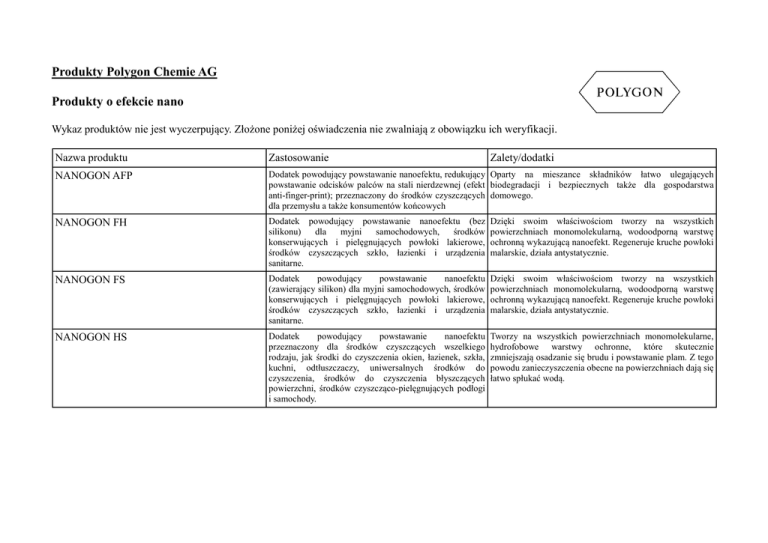 Produkty Polygon Chemie AG Produkty o efekcie nano Wykaz produktów nie jest wyczerpujący. Złożone poniżej oświadczenia nie zwalniają z obowiązku ich weryfikacji. Nazwa produktu Zastosowanie Zalety/dodatki NANOGON AFP Dodatek powodujący powstawanie nanoefektu, redukujący Oparty na mieszance składników łatwo ulegających powstawanie odcisków palców na stali nierdzewnej (efekt biodegradacji i bezpiecznych także dla gospodarstwa anti-finger-print); przeznaczony do środków czyszczących domowego. dla przemysłu a także konsumentów końcowych NANOGON FH Dodatek powodujący powstawanie nanoefektu (bez silikonu) dla myjni samochodowych, środków konserwujących i pielęgnujących powłoki lakierowe, środków czyszczących szkło, łazienki i urządzenia sanitarne. Dzięki swoim właściwościom tworzy na wszystkich powierzchniach monomolekularną, wodoodporną warstwę ochronną wykazującą nanoefekt. Regeneruje kruche powłoki malarskie, działa antystatycznie. NANOGON FS Dodatek powodujący powstawanie nanoefektu (zawierający silikon) dla myjni samochodowych, środków konserwujących i pielęgnujących powłoki lakierowe, środków czyszczących szkło, łazienki i urządzenia sanitarne. Dzięki swoim właściwościom tworzy na wszystkich powierzchniach monomolekularną, wodoodporną warstwę ochronną wykazującą nanoefekt. Regeneruje kruche powłoki malarskie, działa antystatycznie. NANOGON HS Dodatek powodujący powstawanie nanoefektu przeznaczony dla środków czyszczących wszelkiego rodzaju, jak środki do czyszczenia okien, łazienek, szkła, kuchni, odtłuszczaczy, uniwersalnych środków do czyszczenia, środków do czyszczenia błyszczących powierzchni, środków czyszcząco-pielęgnujących podłogi i samochody. Tworzy na wszystkich powierzchniach monomolekularne, hydrofobowe warstwy ochronne, które skutecznie zmniejszają osadzanie się brudu i powstawanie plam. Z tego powodu zanieczyszczenia obecne na powierzchniach dają się łatwo spłukać wodą.
