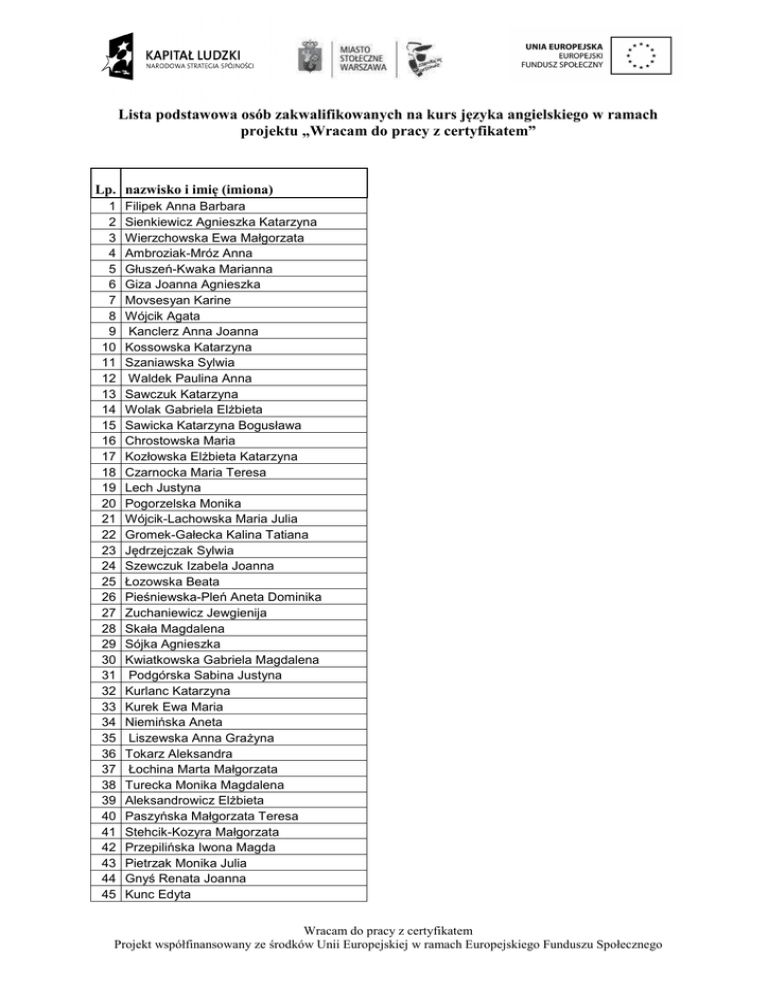Lista podstawowa osób zakwalifikowanych na kurs języka angielskiego w ramach projektu „Wracam do pracy z certyfikatem” Lp. nazwisko i imię (imiona) 1 2 3 4 5 6 7 8 9 10 11 12 13 14 15 16 17 18 19 20 21 22 23 24 25 26 27 28 29 30 31 32 33 34 35 36 37 38 39 40 41 42 43 44 45 Filipek Anna Barbara Sienkiewicz Agnieszka Katarzyna Wierzchowska Ewa Małgorzata Ambroziak-Mróz Anna Głuszeń-Kwaka Marianna Giza Joanna Agnieszka Movsesyan Karine Wójcik Agata Kanclerz Anna Joanna Kossowska Katarzyna Szaniawska Sylwia Waldek Paulina Anna Sawczuk Katarzyna Wolak Gabriela Elżbieta Sawicka Katarzyna Bogusława Chrostowska Maria Kozłowska Elżbieta Katarzyna Czarnocka Maria Teresa Lech Justyna Pogorzelska Monika Wójcik-Lachowska Maria Julia Gromek-Gałecka Kalina Tatiana Jędrzejczak Sylwia Szewczuk Izabela Joanna Łozowska Beata Pieśniewska-Pleń Aneta Dominika Zuchaniewicz Jewgienija Skała Magdalena Sójka Agnieszka Kwiatkowska Gabriela Magdalena Podgórska Sabina Justyna Kurlanc Katarzyna Kurek Ewa Maria Niemińska Aneta Liszewska Anna Grażyna Tokarz Aleksandra Łochina Marta Małgorzata Turecka Monika Magdalena Aleksandrowicz Elżbieta Paszyńska Małgorzata Teresa Stehcik-Kozyra Małgorzata Przepilińska Iwona Magda Pietrzak Monika Julia Gnyś Renata Joanna Kunc Edyta Wracam do pracy z certyfikatem Projekt współfinansowany ze środków Unii Europejskiej w ramach Europejskiego Funduszu Społecznego 46 47 48 49 50 51 52 53 54 55 56 57 58 59 60 61 62 63 64 65 66 67 68 69 70 71 72 73 74 75 76 77 78 79 80 81 82 83 84 Jóźwicka Maria Anna Herman Marta Subda Ewelina Waśniewska Marta Marlena Łukomska-Ładczuk Katarzyna Sposób Martyna Andrzejewska Agnieszka Polak Ewa Elżbieta Przesmycka Karolina Maria Słota Beata Maria Nowakowska Paulina Wanda Dąbrowska Klaudia Marta Chłodzińska Małgorzata Czaja Katarzyna Joanna Jabłonka Katarzyna Maria Sosnowska Małgorzata Niezgoda Magdalena Naworska Katarzyna Mroczek Justyna Pacek Agnieszka Chwiszczuk Elżbieta Sawośko Julia Incaudo Sylwia Długołęcka Agata Duda Anna Beata Milczarek-Szpak Monika Sobiech Sylwia Asińska-Paluch Katarzyna Halina Majewska Marta Katarzyna Filipczak Katarzyna Nabiałek Marta Bugajewska Małgorzata Borecka Anna Wanda Walczak-Buczkowska Marta Paluch Wioletta Jedynak Agnieszka Dugiel Sabina Górska Ewelina Getka Ewa Wracam do pracy z certyfikatem Projekt współfinansowany ze środków Unii Europejskiej w ramach Europejskiego Funduszu Społecznego