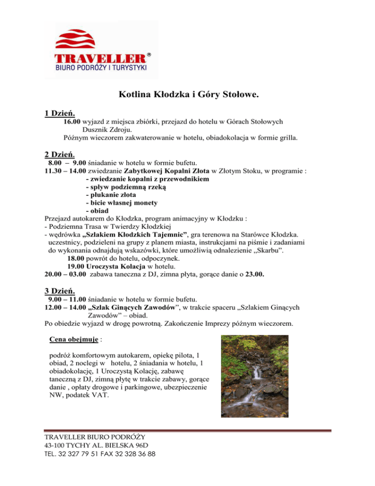 Kotlina Kłodzka i Góry Stołowe. 1 Dzień. 16.00 wyjazd z miejsca zbiórki, przejazd do hotelu w Górach Stołowych Dusznik Zdroju. Późnym wieczorem zakwaterowanie w hotelu, obiadokolacja w formie grilla. 2 Dzień. 8.00 – 9.00 śniadanie w hotelu w formie bufetu. 11.30 – 14.00 zwiedzanie Zabytkowej Kopalni Złota w Złotym Stoku, w programie : - zwiedzanie kopalni z przewodnikiem - spływ podziemną rzeką - płukanie złota - bicie własnej monety - obiad Przejazd autokarem do Kłodzka, program animacyjny w Kłodzku : - Podziemna Trasa w Twierdzy Kłodzkiej - wędrówka „Szlakiem Kłodzkich Tajemnic”, gra terenowa na Starówce Kłodzka. uczestnicy, podzieleni na grupy z planem miasta, instrukcjami na piśmie i zadaniami do wykonania odnajdują wskazówki, które umoŜliwią odnalezienie „Skarbu”. 18.00 powrót do hotelu, odpoczynek. 19.00 Uroczysta Kolacja w hotelu. 20.00 – 03.00 zabawa taneczna z DJ, zimna płyta, gorące danie o 23.00. 3 Dzień. 9.00 – 11.00 śniadanie w hotelu w formie bufetu. 12.00 – 14.00 „Szlak Ginących Zawodów”, w trakcie spaceru „Szlakiem Ginących Zawodów” – obiad. Po obiedzie wyjazd w drogę powrotną. Zakończenie Imprezy późnym wieczorem. Cena obejmuje : podróŜ komfortowym autokarem, opiekę pilota, 1 obiad, 2 noclegi w hotelu, 2 śniadania w hotelu, 1 obiadokolację, 1 Uroczystą Kolację, zabawę taneczną z DJ, zimną płytę w trakcie zabawy, gorące danie , opłaty drogowe i parkingowe, ubezpieczenie NW, podatek VAT. TRAVELLER BIURO PODRÓŻY 43-100 TYCHY AL. BIELSKA 96D TEL. 32 327 79 51 FAX 32 328 36 88