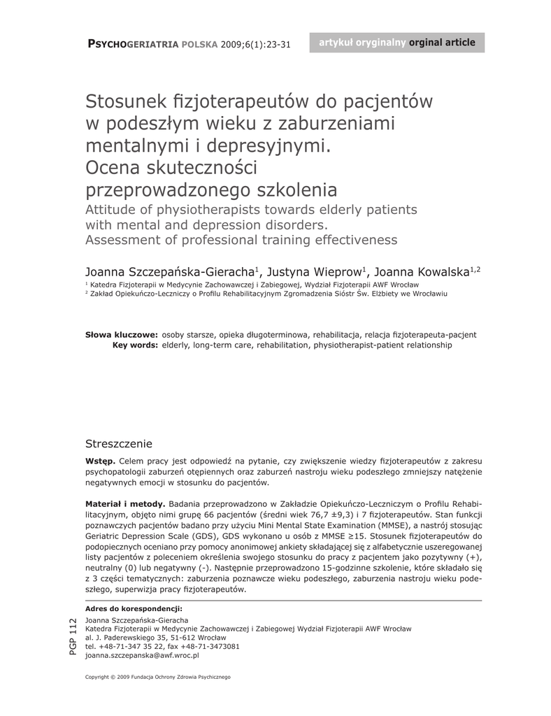 PSYCHOGERIATRIA POLSKA 2009;6(1):23-31 artykuł oryginalny orginal article Stosunek fizjoterapeutów do pacjentów w podeszłym wieku z zaburzeniami mentalnymi i depresyjnymi. Ocena skuteczności przeprowadzonego szkolenia Attitude of physiotherapists towards elderly patients with mental and depression disorders. Assessment of professional training effectiveness Joanna Szczepańska-Gieracha1, Justyna Wieprow1, Joanna Kowalska1,2 1 2 Katedra Fizjoterapii w Medycynie Zachowawczej i Zabiegowej, Wydział Fizjoterapii AWF Wrocław Zakład Opiekuńczo-Leczniczy o Profilu Rehabilitacyjnym Zgromadzenia Sióstr Św. Elżbiety we Wrocławiu Słowa kluczowe: osoby starsze, opieka długoterminowa, rehabilitacja, relacja fizjoterapeuta-pacjent Key words: elderly, long-term care, rehabilitation, physiotherapist-patient relationship Streszczenie Wstęp. Celem pracy jest odpowiedź na pytanie, czy zwiększenie wiedzy fizjoterapeutów z zakresu psychopatologii zaburzeń otępiennych oraz zaburzeń nastroju wieku podeszłego zmniejszy natężenie negatywnych emocji w stosunku do pacjentów. Materiał i metody. Badania przeprowadzono w Zakładzie Opiekuńczo-Leczniczym o Profilu Rehabilitacyjnym, objęto nimi grupę 66 pacjentów (średni wiek 76,7 ±9,3) i 7 fizjoterapeutów. Stan funkcji poznawczych pacjentów badano przy użyciu Mini Mental State Examination (MMSE), a nastrój stosując Geriatric Depression Scale (GDS), GDS wykonano u osób z MMSE ≥15. Stosunek fizjoterapeutów do podopiecznych oceniano przy pomocy anonimowej ankiety składającej się z alfabetycznie uszeregowanej listy pacjentów z poleceniem określenia swojego stosunku do pracy z pacjentem jako pozytywny (+), neutralny (0) lub negatywny (-). Następnie przeprowadzono 15-godzinne szkolenie, które składało się z 3 części tematycznych: zaburzenia poznawcze wieku podeszłego, zaburzenia nastroju wieku podeszłego, superwizja pracy fizjoterapeutów. PGP 112 Adres do korespondencji: Joanna Szczepańska-Gieracha Katedra Fizjoterapii w Medycynie Zachowawczej i Zabiegowej Wydział Fizjoterapii AWF Wrocław al. J. Paderewskiego 35, 51-612 Wrocław tel. +48-71-347 35 22, fax +48-71-3473081 [email protected] Copyright © 2009 Fundacja Ochrony Zdrowia Psychicznego 24 Joanna Szczepańska-Gieracha i wsp.: Stosunek fizjoterapeutów do pacjentów w wieku podeszłym Wyniki. W badanej grupie pacjentów średni wynik MMSE wynosił 18,9 (±6,9) punktów, objawy otępienia o różnym stopniu zaawansowania stwierdzono u 78,8% osób. Spośród 32 pacjentów z MMSE ≥15 średni wynik GDS wynosił 7,1 (± 4,4), objawy depresyjne stwierdzono u 65,6% badanych. Przed szkoleniem średnia ilość ocen negatywnych przypadających na jednego pacjenta wynosiła 1,71, neutralnych 2,27, a pozytywnych 2,13. Po szkoleniu istotnie spadła ilość ocen negatywnych (p=0,000003) przy istotnym wzroście ocen neutralnych (p=0,000032). Wnioski. W Zakładach Opiekuńczo-Leczniczych problem deficytów poznawczych oraz zaburzeń nastroju jest znacznie bardziej rozpowszechniony niż w ogólnej populacji osób starszych. W wyniku przeprowadzonego szkolenia istotnie zmniejszyła się ilość negatywnych opinii na temat pacjentów na rzecz opinii o charakterze neutralnym. Summary Background. The aim of this study is to verify, whether increase of physiotherapists’ knowledge about psychopathology of cognitive and mood disorders will decrease the amount of negative emotions towards patients. Material and methods. The study was carried out in Geriatric Rehabilitation Unit, it involved 66 patients ( 76,7 ±9,3 years) and 7 physiotherapists. Cognitive status and mood of the patients were examined using Mini Mental State Examination (MMSE), and the Geriatric Depression Scale (GDS) respectively. GDS was performed only in patients with MMSE ≥15. Physiotherapists’ attitude towards particular patients was examined using anonymous questionnaire which included list of patients in alphabetical order. They could evaluate their attitude towards work with patients as positive (+), neutral (0) or negative (-). Afterwards all physiotherapists were involved into 15-hours training. The training included 3 ranges of topics: cognitive disorders of elderly patients, mood disorders of elderly patients, physiotherapists’ supervision. Results. In the examined group symptoms of cognitive deficits of different degree were diagnosed in 78,8% of patients. 32 patients classified as MMSE ≥15 achieved mean GDS result 7,1(± 4,4). Before the training mean amount of negative opinions per one patient was 1,71, neutral 2,27 and positive 2,13. After the training the amount of negative opinions decreased significantly (p=0,000003) with significant increase of neutral opinions (p=0,000032). Conclusions. Problem of cognitive deficits and mood disorders is much more widespread in Geriatric Rehabilitation Units than in the general population of elderly people. As a result of the professional training the amount of negative opinions about patients decreased while neutral ones increased. Wstęp Dzięki osiągnięciom współczesnej medycyny i farmakologii z roku na rok wzrasta w Polsce średnia długość życia zarówno mężczyzn jak i kobiet. Niestety wielu seniorów wymaga intensywnej i często długoterminowej rehabilitacji. W przypadku niepowodzenia procesu fizjoterapii niekiedy konieczne jest umieszczenie chorego w placówce świadczącej całodobową opiekę, ponieważ samodzielne funkcjonowanie w warunkach domowych okazuje się niemożliwe. Zatem końcowe wyniki usprawniania mogą mieć decydujące znaczenie co do dalszych losów starszych pacjentów, ich jakości życia oraz kosztów ewentualnej opieki. W tym kontekście rozważania na temat poprawy jakości pracy i efektywności fizjoterapii na geriatrycznych oddziałach rehabilitacyjnych wydają się uzasadnione i potrzebne. Fizjoterapia osób w podeszłym wieku to złożony problem zarówno z medycznego, jak i psychologicznego punktu widzenia. W 