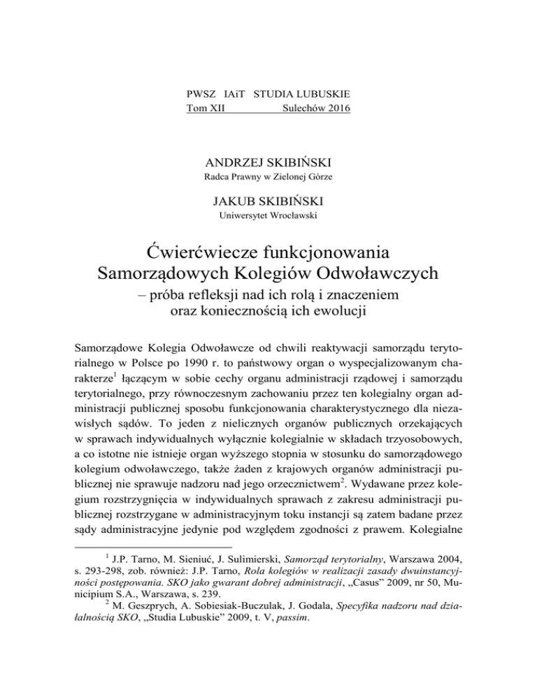 PWSZ IAiT STUDIA LUBUSKIE Tom XII Sulechów 2016 ANDRZEJ SKIBIŃSKI Radca Prawny w Zielonej Górze JAKUB SKIBIŃSKI Uniwersytet Wrocławski Ćwierćwiecze funkcjonowania Samorządowych Kolegiów Odwoławczych – próba refleksji nad ich rolą i znaczeniem oraz koniecznością ich ewolucji Samorządowe Kolegia Odwoławcze od chwili reaktywacji samorządu terytorialnego w Polsce po 1990 r. to państwowy organ o wyspecjalizowanym charakterze1 łączącym w sobie cechy organu administracji rządowej i samorządu terytorialnego, przy równoczesnym zachowaniu przez ten kolegialny organ administracji publicznej sposobu funkcjonowania charakterystycznego dla niezawisłych sądów. To jeden z nielicznych organów publicznych orzekających w sprawach indywidualnych wyłącznie kolegialnie w składach trzyosobowych, a co istotne nie istnieje organ wyższego stopnia w stosunku do samorządowego kolegium odwoławczego, także żaden z krajowych organów administracji publicznej nie sprawuje nadzoru nad jego orzecznictwem2. Wydawane przez kolegium rozstrzygnięcia w indywidualnych sprawach z zakresu administracji publicznej rozstrzygane w administracyjnym toku instancji są zatem badane przez sądy administracyjne jedynie pod względem zgodności z prawem. Kolegialne 1 J.P. Tarno, M. Sieniuć, J. Sulimierski, Samorząd terytorialny, Warszawa 2004, s. 293-298, zob. również: J.P. Tarno, Rola kolegiów w realizacji zasady dwuinstancyjności postępowania. SKO jako gwarant dobrej administracji, „Casus” 2009, nr 50, Municipium S.A., Warszawa, s. 239. 2 M. Geszprych, A. Sobiesiak-Buczulak, J. Godala, Specyfika nadzoru nad działalnością SKO, „Studia Lubuskie” 2009, t. V, passim. ANDRZEJ SKIBIŃSKI, JAKUB SKIBIŃSKI 30 i niezależne orzekanie, realizowane przez składy orzekające i brak podporządkowania orzecznictwa kolegium organom administracyjnym wyższego stopnia oraz powierzenie kolegium rozpoznawania spraw również w sprawach cywilnych, w mieszanym administracyjno-sądowym trybie weryfikacji – wskazuje jednoznacznie na rolę kolegiów jako organów administracyjnych o quasi sądowym charakterze3. Bardzo istotny w rozważaniach nad pozycją ustrojową kolegiów jest również aspekt ich niezależności orzeczniczej, gdyż kolegia obecnie są niezależne tak pod względem organizacyjnym, jak i w sprawach orzekania od organów administracji rządowej4. Prawo do bezstronnego i rzetelnego rozpoznania sprawy, będące podstawą kontroli instancyjnej jest zapewnione i zrealizowane tylko wówczas, gdy przepisy prawa procesowego wyłączają łączenie ról procesowych, a zatem, gdy organ władzy publicznej powołany do orzekania nie jest jednocześnie przedstawicielem jednej ze stron czy stroną w sprawie5. Kolegia spełniają priorytetową rolę w zapewnieniu realizacji zasady dwuinstancyjności postępowania w administracyjnym toku instancji6, będąc niezależne finansowo, personalnie i organizacyjnie od organów, względem których wykonują swoje funkcje – są nie tylko gwarantem poszanowania zasad procesowych i uprawnień stron postępowania w sprawach indywidualnych z zakresu administracji publicznej, ale również stoją na straży samodzielności kompetencyjnej samorządu terytorialnego, nie ingerując w sposób realizacji zadań przez organy samorządowe, a jedynie stojąc na straży poszanowania norm procesowych i norm prawa materialnego oraz zasad ogólnych procedury administracyjnej i podatkowej7. Możliwość zaskarżenia do wojewódzkiego sądu administracyj3 J.P. Tarno, SKO jako szczególne organy administracji publicznej, „Samorząd Terytorialny” 1997, nr 1-2, s. 126. 4 M. Geszprych, A. Sobiesiak-Buczulak, J. Godala, Specyfika nadzoru nad działalnością SKO…, op. cit., s. 14; zob. również: D. Kijowski, W kwestii nadzoru nad SKO. Pozycja SKO w postępowaniu administracyjnym, Kraków 2005, s. 210-212. 5 B. Adamiak, Tok instancji przed organami samorządu terytorialnego, „Samorząd Terytorialny” 1991, nr 9, s. 9. 6 J.P. Tarno, Miejsce i rola SKO w systemie organów samorządu terytorialnego. Samorząd Terytorialny w Polsce, Warszawa 2002, s. 294; zob. również: A. Skibiński, Samorządowe kolegia odwoławcze a konstytucyjna zasada dwuinstancyjności postępowania administracyjnego. Miejsce i rola RIO i SKO w systemie samorządu terytorialnego, Zielona Góra 2005, s. 206-207. 7 R. Sawuła, Samorządowe kolegia odwoławcze, a samodzielność orzekania przez organy samorządu terytorialnego, „Casus” 1999, nr 13, s. 16. Ćwierćwiecze funkcjonowania Samorządowych Kolegiów Odwoławczych… 31 nego decyzji wydanej w I instancji, nie stanowi ani wystarczającej, ani zupełnej realizacji prawa, o którym mowa w art. 78 Konstytucji RP, dyspozycja tego przepisu bowiem wprost przewiduje, że realizacja tej zasady konstytucyjnej ma mieć w swojej istocie postać realnej możliwości zaskarżenia decyzji w toku postępowania administracyjnego, a więc odwołania nie do sądu, ale do organu administracji wyższego stopnia8. Zasada ta nie będzie nigdy zrealizowana, gdy strona będzie miała wyłącznie możliwość odwołania się do sądu9. Przedstawiciele nauki wskazują także, że kontrola instancyjna powinna odbywać się w samej gminie i ewentualnie dopiero w następstwie wniosku strony winno być rozpatrzone przez niezależny sąd administracyjny10, albowiem w ich ocenie samorządowe kolegia odwoławcze utraciły rację bytu z chwilą, gdy przestały być częścią struktury samorządowej i przeszły „pod skrzydła budżetu państwa”11. Reprezentujący te poglądy przedstawiciele doktryny12 wskazują, iż system kolegiów jest systemem niewydolnym, biurokratycznie ociężałym (49 jednostek w 16 województwach). Ich zdaniem optymalnym modelem w Polsce byłby model 1+2, gdzie po decyzji organu I instancji następują od razu 2 instancje sądowe, a wniosek o ewentualną zmianę decyzji powinien być rozpoznawany jedynie przez organ I instancji13. Koncepcje te 