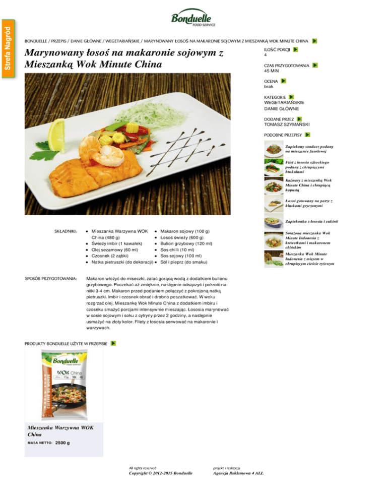 BONDUELLE / PRZEPIS / DANIE GŁÓWNE / WEGETARIAŃSKIE / MARYNOWANY ŁOSOŚ NA MAKARONIE SOJOWYM Z MIESZANKĄ WOK MINUTE CHINA Marynowany łosoś na makaronie sojowym z Mieszanką Wok Minute China ILOŚĆ PORCJI 4 CZAS PRZYGOTOWANIA 45 MIN OCENA brak KATEGORIE WEGETARIAŃSKIE DANIE GŁÓWNE DODANE PRZEZ TOMASZ SZYMAŃSKI PODOBNE PRZEPISY Zapiekany sandacz podany na mieszance fasolowej Filet z łososia szkockiego podany z chrupiącymi brokułami Kalmary z mieszanką Wok Minute China i chrupiącą kapustą Łosoś gotowany na parze z kluskami gryczanymi Zapiekanka z łososia i cukinii SKŁADNIKI: SPOSÓB PRZYGOTOWANIA: Mieszanka Warzywna WOK China (480 g) Świeży imbir (1 kawałek) Olej sezamowy (60 ml) Czosnek (2 ząbki) Natka pietruszki (do dekoracji) Makaron sojowy (100 g) Łosoś świeży (600 g) Bulion grzybowy (120 ml) Sos chilli (10 ml) Sos sojowy (100 ml) Sól i pieprz (do smaku) Smażona mieszanka Wok Minute Indonesia z krewetkami i makaronem chińskim Mieszanka Wok Minute Indonesia z mięsem w chrupiącym cieście ryżowym Makaron włożyć do miseczki, zalać gorącą wodą z dodatkiem bulionu grzybowego. Poczekać aż zmięknie, następnie odsączyć i pokroić na nitki 3-4 cm. Makaron przed podaniem połączyć z pokrojoną natką pietruszki. Imbir i czosnek obrać i drobno poszatkować. W woku rozgrzać olej. Mieszankę Wok Minute China z dodatkiem imbiru i czosnku smażyć porcjami intensywnie mieszając. Łososia marynować w sosie sojowym i soku z cytryny przez 2 godziny, a następnie usmażyć na złoty kolor. Filety z łososia serwować na makaronie i warzywach. PRODUKTY BONDUELLE UŻYTE W PRZEPISIE Mieszanka Warzywna WOK China MASA NETTO: 2500 g All rights reserved projekt i realizacja Copyright © 2012-2015 Bonduelle Agencja Reklamowa 4 ALL