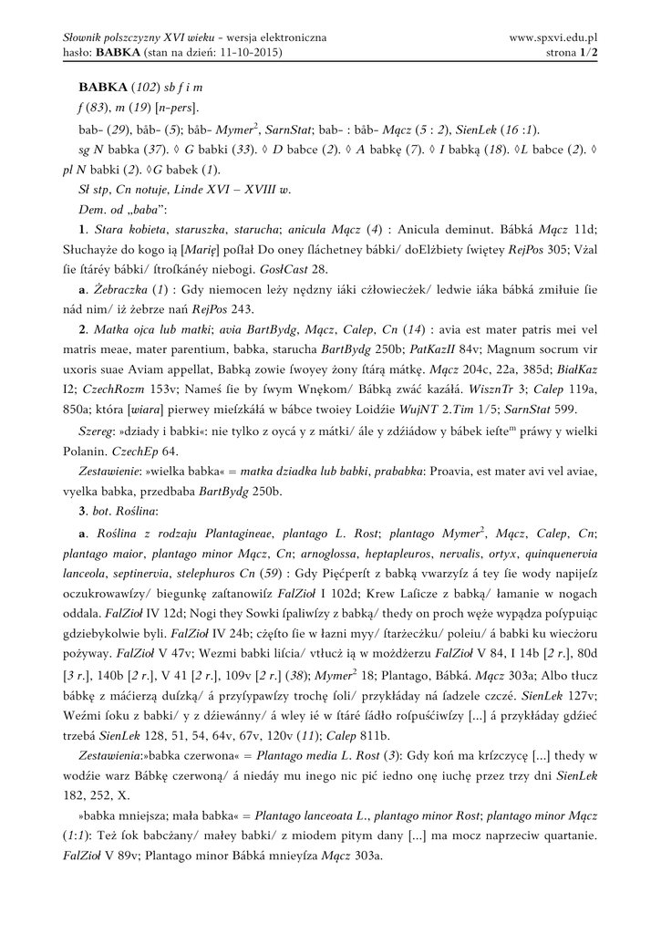 Słownik polszczyzny XVI wieku - wersja elektroniczna hasło: BABKA (stan na dzień: 11-10-2015) www.spxvi.edu.pl strona 1/2 BABKA (102) sb f i m f (83), m (19) [n-pers]. bab- (29), båb- (5); båb- Mymer2, SarnStat; bab- : båb- Mącz (5 : 2), SienLek (16 :1). sg N babka (37). ◊ G babki (33). ◊ D babce (2). ◊ A babkę (7). ◊ I babką (18). ◊L babce (2). ◊ pl N babki (2). ◊G babek (1). Sł stp, Cn notuje, Linde XVI – XVIII w. Dem. od „baba”: 1. Stara kobieta, staruszka, starucha; anicula Mącz (4) : Anicula deminut. Bábká Mącz 11d; Słuchayże do kogo ią [Marię] poſłał Do oney ſláchetney bábki/ doElżbiety ſwiętey RejPos 305; Vżal ſie ſtáréy bábki/ ſtroſkánéy niebogi. GosłCast 28. a. Żebraczka (1) : Gdy niemocen leży nędzny iáki cżłowiecżek/ ledwie iáka bábká zmiłuie ſie nád nim/ iż żebrze nań RejPos 243. 2. Matka ojca lub matki; avia BartBydg, Mącz, Calep, Cn (14) : avia est mater patris mei vel matris meae, mater parentium, babka, starucha BartBydg 250b; PatKazII 84v; Magnum socrum vir uxoris suae Aviam appellat, Babką zowie ſwoyey żony ſtárą mátkę. Mącz 204c, 22a, 385d; BiałKaz I2; CzechRozm 153v; Nameś ſie by ſwym Wnękom/ Bábką zwáć kazáłá. WisznTr 3; Calep 119a, 850a; która [wiara] pierwey mieſzkáłá w bábce twoiey Loidźie WujNT 2.Tim 1/5; SarnStat 599. Szereg: »dziady i babki«: nie tylko z oycá y z mátki/ ále y zdźiádow y bábek ieſtem práwy y wielki Polanin. CzechEp 64. Zestawienie: »wielka babka« = matka dziadka lub babki, prababka: Proavia, est mater avi vel aviae, vyelka babka, przedbaba BartBydg 250b. 3. bot. Roślina: a. Roślina z rodzaju Plantagineae, plantago L. Rost; plantago Mymer2, Mącz, Calep, Cn; plantago maior, plantago minor Mącz, Cn; arnoglossa, heptapleuros, nervalis, ortyx, quinquenervia lanceola, septinervia, stelephuros Cn (59) : Gdy Pięćperſt z babką vwarzyſz á tey ſie wody napijeſz oczukrowawſzy/ biegunkę zaſtanowiſz FalZioł I 102d; Krew Laſicze z babką/ łamanie w nogach oddala. FalZioł IV 12d; Nogi they Sowki ſpaliwſzy z babką/ thedy on proch węże wypądza poſypuiąc gdziebykolwie byli. FalZioł IV 24b; cżęſto ſie w łazni myy/ ſtarżecżku/ poleiu/ á babki ku wiecżoru pożyway. FalZioł V 47v; Wezmi babki liſcia/ vtłucż ią w możdżerzu FalZioł V 84, I 14b [2 r.], 80d [3 r.], 140b [2 r.], V 41 [2 r.], 109v [2 r.] (38); Mymer2 18; Plantago, Bábká. Mącz 303a; Albo tłucz bábkę z máćierzą duſzką/ á przyſypawſzy trochę ſoli/ przykłáday ná ſadzele czczé. SienLek 127v; Weźmi ſoku z babki/ y z dźiewánny/ á wley ié w ſtáré ſádło roſpuśćiwſzy [...] á przykłáday gdźieć trzebá SienLek 128, 51, 54, 64v, 67v, 120v (11); Calep 811b. Zestawienia:»babka czerwona« = Plantago media L. Rost (3): Gdy koń ma krſzczycę [...] thedy w wodźie warz Bábkę czerwoną/ á niedáy mu inego nic pić iedno onę iuchę przez trzy dni SienLek 182, 252, X. »babka mniejsza; mała babka« = Plantago lanceoata L., plantago minor Rost; plantago minor Mącz (1:1): Też ſok babcżany/ małey babki/ z miodem pitym dany [...] ma mocz naprzeciw quartanie. FalZioł V 89v; Plantago minor Bábká mnieyſza Mącz 303a. Słownik polszczyzny XVI wieku - wersja elektroniczna hasło: BABKA (stan na dzień: 11-10-2015) www.spxvi.edu.pl strona 2/2 »babka ogrodna«: Bábka ogrodna SienLek X. »babka wielka; więtsza babka« = Plantago major L. Rost; plantago maior Mącz (1:1): Wezmi [...] babki wielkiey y zdrowey piołynu młodego/ wirzchow hanyżowych gdy kwcie [!] FalZioł II 19c; Plantago maior. Więtſza Bábká. Mącz 303a. b. Roślina wodna; Alismaceae, Alisma PlantagoL., plantago aquatica Rost; damassonium Calep; plantago aquatica Cn (3) : Zestawienie: »wodna babka, babka wodna« (2 : 1): Wodna bábká/ Plantago aquatica SienLek 217v, X; Damassonium ‒ Wodna bábká. Calep 286b. 4.astr. (tylko w pl) Konstelacja; Plejady; pleiades BartBydg; cynosura Calep (2) : Pleiades, signum coeleste, pliades, galina, vel babky vel cocosz s kurcząty BartBydg 117b; CYNOSVRA ‒ Gwiazd ſziedm, babky poſpoliczie rzekacze, albo iak ie Aſtrologowie naziwaia niedwiedziem mnieiſzim P. G. Calep 284a. 5. n-pers (19) : Prziſzedwſzy przed Vrząd naſz Miaſteczka Koſcierziny Sliachetny Piotr Goſtomſki alias Babka ZapKościer 1; Gdze thę vgodę vdzalaly [...] Pán Ianyſz Goſtomſky babka Pan bartlomy bronk ZapKościer 36v; Stanyeli slachetny pánowyę braczya strijeczny przet prawo naſzyę Iako waltyn babka a Ian babka ZapKościer 58v; y spanyem Waltinyem Goſtomſkim babką ſzeſnawamy ZapKościer 60; slubuyę pokoy wyeczny na wyęky slachetny pán Ian babka goſtomſky ZapKościer 79v, 5, 37, 57v [5 r.], 58v [3 r.], 59v (19). Synonimy: 2. stara matka, starka, starucha; 3. języczek, języczki, psi język; 4. gwiazda niebieska, gwiazd siedm, kokosz z kurczęty, mniejszy niedźwiadek, nasiadka z kurczęty, niedźwiedź mniejszy, siedm gwiazd niebieskich. LZ