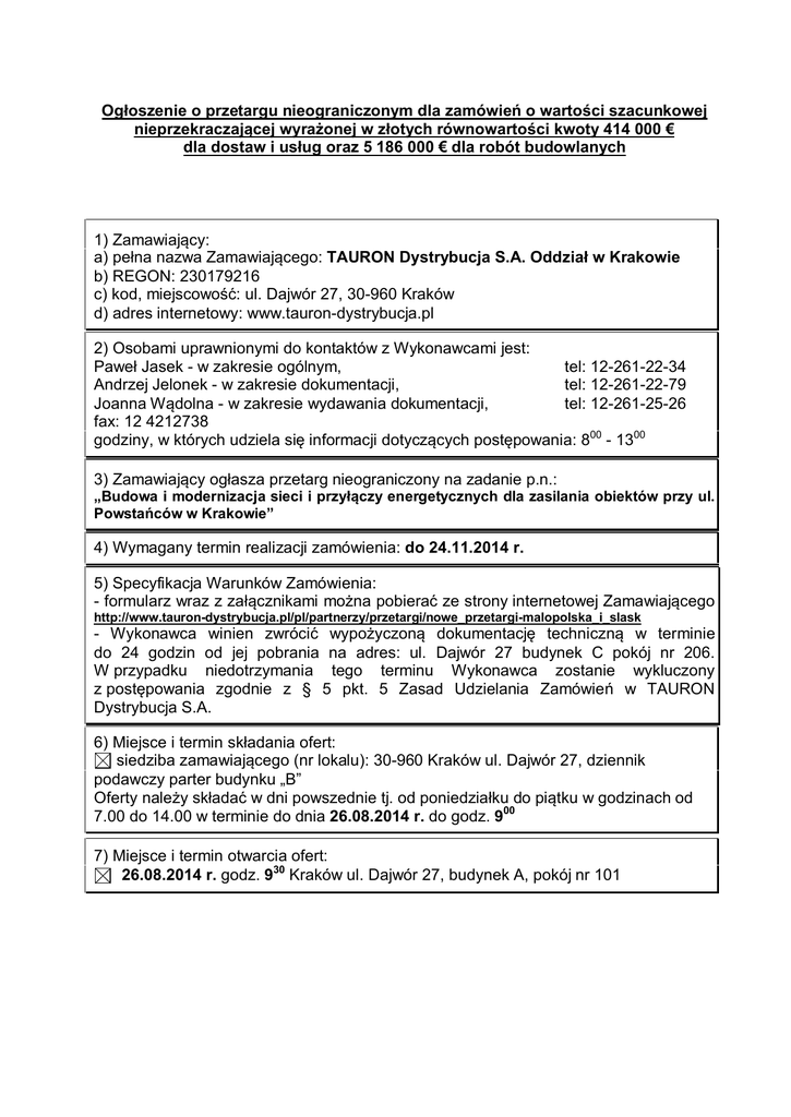 Og oszenie o przetargu nieograniczonym dla zamówie o warto ci szacunkowej nieprzekraczaj cej wyra onej w z otych równowarto ci kwoty 414 000 € dla dostaw i us ug oraz 5 186 000 € dla robót budowlanych 1) Zamawiaj cy: a) pe na nazwa Zamawiaj cego: TAURON Dystrybucja S.A. Oddzia w Krakowie b) REGON: 230179216 c) kod, miejscowo : ul. Dajwór 27, 30-960 Kraków d) adres internetowy: www.tauron-dystrybucja.pl 2) Osobami uprawnionymi do kontaktów z Wykonawcami jest: Pawe Jasek - w zakresie ogólnym, tel: 12-261-22-34 Andrzej Jelonek - w zakresie dokumentacji, tel: 12-261-22-79 Joanna W dolna - w zakresie wydawania dokumentacji, tel: 12-261-25-26 fax: 12 4212738 godziny, w których udziela si informacji dotycz cych post powania: 800 - 1300 3) Zamawiaj cy og asza przetarg nieograniczony na zadanie p.n.: „Budowa i modernizacja sieci i przy czy energetycznych dla zasilania obiektów przy ul. Powsta ców w Krakowie” 4) Wymagany termin realizacji zamówienia: do 24.11.2014 r. 5) Specyfikacja Warunków Zamówienia: - formularz wraz z za cznikami mo na pobiera ze strony internetowej Zamawiaj cego http://www.tauron-dystrybucja.pl/pl/partnerzy/przetargi/nowe_przetargi-malopolska_i_slask - Wykonawca winien zwróci wypo yczon dokumentacj techniczn w terminie do 24 godzin od jej pobrania na adres: ul. Dajwór 27 budynek C pokój nr 206. W przypadku niedotrzymania tego terminu Wykonawca zostanie wykluczony z post powania zgodnie z § 5 pkt. 5 Zasad Udzielania Zamówie w TAURON Dystrybucja S.A. 6) Miejsce i termin sk adania ofert: siedziba zamawiaj cego (nr lokalu): 30-960 Kraków ul. Dajwór 27, dziennik podawczy parter budynku „B” Oferty nale y sk ada w dni powszednie tj. od poniedzia ku do pi tku w godzinach od 7.00 do 14.00 w terminie do dnia 26.08.2014 r. do godz. 900 7) Miejsce i termin otwarcia ofert: 26.08.2014 r. godz. 930 Kraków ul. Dajwór 27, budynek A, pokój nr 101