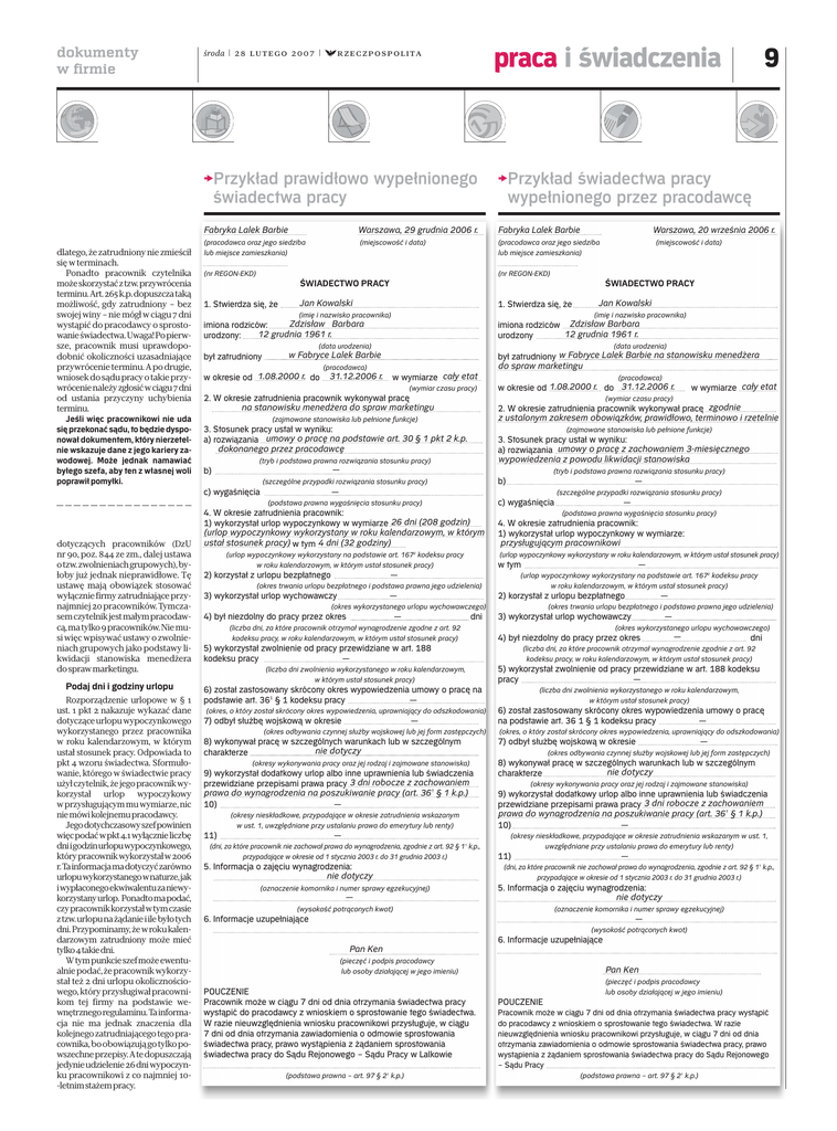 dokumenty w firmie dlatego, że zatrudniony nie zmieścił się w terminach. Ponadto pracownik czytelnika może skorzystać ztzw. przywrócenia terminu. Art.265 k.p. dopuszcza taką możliwość, gdy zatrudniony – bez swojej winy – nie mógł w ciągu 7 dni wystąpić do pracodawcy o sprostowanie świadectwa. Uwaga! Popierwsze, pracownik musi uprawdopodobnić okoliczności uzasadniające przywrócenie terminu. A po drugie, wniosek do sądu pracy o takie przywrócenie należy zgłosić wciągu7 dni od ustania przyczyny uchybienia terminu. Jeśli więc pracownikowi nie uda się przekonać sądu, to będzie dysponował dokumentem, który nierzetelnie wskazuje dane z jego kariery zawodowej. Może jednak namawiać byłego szefa, aby ten z własnej woli poprawił pomyłki. praca i świadczenia środa | 28 lutego 2007 | ◊rzeczpospolita >Przykład prawidłowo wypełnionego świadectwa pracy >Przykład świadectwa pracy wypełnionego przez pracodawcę Fabryka Lalek Barbie Warszawa, 29 grudnia 2006 r. Fabryka Lalek Barbie (pracodawca oraz jego siedziba lub miejsce zamieszkania) (miejscowość i data) (pracodawca oraz jego siedziba lub miejsce zamieszkania) (nr REGON-EKD) Rozporządzenie urlopowe w § 1 ust. 1 pkt 2 nakazuje wykazać dane dotyczące urlopu wypoczynkowego wykorzystanego przez pracownika w roku kalendarzowym, w którym ustał stosunek pracy. Odpowiada to pkt 4 wzoru świadectwa. Sformułowanie, którego w świadectwie pracy użył czytelnik, że jego pracownik wykorzystał urlop wypoczykowy w przysługującym mu wymiarze, nic nie mówi kolejnemu pracodawcy. Jego dotychczasowy szef powinien więc podać wpkt4.1 wyłącznie liczbę dni igodzin urlopu wypoczynkowego, który pracownik wykorzystał w2006 r. Ta informacja ma dotyczyć zarówno urlopu wykorzystanego w naturze, jak i wypłaconego ekwiwalentu za niewykorzystany urlop. Ponadto ma podać, czy pracownik korzystał wtym czasie ztzw. urlopu nażądanie iile było tych dni. Przypominamy, że wroku kalendarzowym zatrudniony może mieć tylko4 takie dni. Wtym punkcie szef może ewentualnie podać, że pracownik wykorzystał też 2 dni urlopu okolicznościowego, który przysługiwał pracownikom tej firmy na podstawie wewnętrznego regulaminu. Ta informacja nie ma jednak znaczenia dla kolejnego zatrudniającego tego pracownika, bo obowiązują go tylko powszechne przepisy. Ate dopuszczają jedynie udzielenie26 dni wypoczynku pracownikowi z co najmniej 10-letnim stażem pracy. (miejscowość i data) (nr REGON-EKD) 1. Stwierdza się, że ŚWIADECTWO PRACY Jan Kowalski 1. Stwierdza się, że (imię i nazwisko pracownika) Jan Kowalski (imię i nazwisko pracownika) Zdzisław Barbara imiona rodziców: 12 grudnia 1961 r. urodzony: imiona rodziców Zdzisław Barbara 12 grudnia 1961 r. urodzony (data urodzenia) był zatrudniony (data urodzenia) w Fabryce Lalek Barbie był zatrudniony w Fabryce Lalek Barbie na stanowisku menedżera do spraw marketingu (pracodawca) w okresie od 1.08.2000 r. do 31.12.2006 r. w wymiarze cały etat (wymiar czasu pracy) 2. W okresie zatrudnienia pracownik wykonywał pracę na stanowisku menedżera do spraw marketingu (pracodawca) w okresie od 1.08.2000 r. do 31.12.2006 r. 2. W okresie zatrudnienia pracownik wykonywał pracę zgodnie z ustalonym zakresem obowiązków, prawidłowo, terminowo i rzetelnie (zajmowane stanowiska lub pełnione funkcje) 3. Stosunek pracy ustał w wyniku: a) rozwiązania umowy o pracę na podstawie art. 30 § 1 pkt 2 k.p. dokonanego przez pracodawcę (zajmowane stanowiska lub pełnione funkcje) 3. Stosunek pracy ustał w wyniku: a) rozwiązania umowy o pracę z zachowaniem 3-miesięcznego wypowiedzenia z powodu likwidacji stanowiska (tryb i podstawa prawna rozwiązania stosunku pracy) — b) (tryb i podstawa prawna rozwiązania stosunku pracy) b) (szczególne przypadki rozwiązania stosunku pracy) — — (szczególne przypadki rozwiązania stosunku pracy) c) wygaśnięcia 4. W okresie zatrudnienia pracownik: 1) wykorzystał urlop wypoczynkowy w wymiarze 26 dni (208 godzin) (urlop wypoczynkowy wykorzystany w roku kalendarzowym, w którym ustał stosunek pracy) w tym 4 dni (32 godziny) (urlop wypoczynkowy wykorzystany na podstawie art. 1672 kodeksu pracy w roku kalendarzowym, w którym ustał stosunek pracy) 2) korzystał z urlopu bezpłatnego 4. W okresie zatrudnienia pracownik: 1) wykorzystał urlop wypoczynkowy w wymiarze: przysługującym pracownikowi (urlop wypoczynkowy wykorzystany w roku kalendarzowym, w którym ustał stosunek pracy) w tym — — (urlop wypoczynkowy wykorzystany na podstawie art. 1672 kodeksu pracy w roku kalendarzowym, w którym ustał stosunek pracy) (okres trwania urlopu bezpłatnego i podstawa prawna jego udzielenia) 2) korzystał z urlopu bezpłatnego (okres wykorzystanego urlopu wychowawczego) 4) był niezdolny do pracy przez okres — dni (liczba dni, za które pracownik otrzymał wynagrodzenie zgodne z art. 92 kodeksu pracy, w roku kalendarzowym, w którym ustał stosunek pracy) (liczba dni zwolnienia wykorzystanego w roku kalendarzowym, w którym ustał stosunek pracy) 3) wykorzystał urlop wychowawczy — (okres odbywania czynnej służby wojskowej lub jej form zastępczych) 8) wykonywał pracę w szczególnych warunkach lub w szczególnym nie dotyczy charakterze (okresy wykonywania pracy oraz jej rodzaj i zajmowane stanowiska) 9) wykorzystał dodatkowy urlop albo inne uprawnienia lub świadczenia przewidziane przepisami prawa pracy 3 dni robocze z zachowaniem prawa do wynagrodzenia na poszukiwanie pracy (art. 361 § 1 k.p.) 10) — (okresy nieskładkowe, przypadające w okresie zatrudnienia wskazanym w ust. 1, uwzględniane przy ustalaniu prawa do emerytury lub renty) — (dni, za które pracownik nie zachował prawa do wynagrodzenia, zgodnie z art. 92 § 11 k.p., przypadające w okresie od 1 stycznia 2003 r. do 31 grudnia 2003 r.) 5. Informacja o zajęciu wynagrodzenia: nie dotyczy (oznaczenie komornika i numer sprawy egzekucyjnej) — — (okres wy