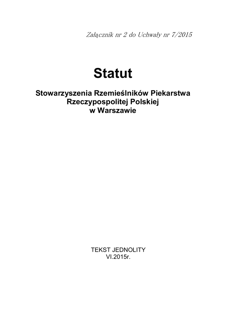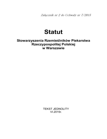Załącznik nr 2 do Uchwały nr 7/2015 Statut Stowarzyszenia Rzemieślników Piekarstwa Rzeczypospolitej Polskiej w Warszawie TEKST JEDNOLITY VI.2015r. ROZDZIAŁ I. Postanowienia ogólne §1 Stowarzyszenie nosi nazwę: „Stowarzyszenie Rzemieślników Piekarstwa Rzeczypospolitej Polskiej”, zwane dalej SRP. §2 Terenem działania SRP jest obszar Rzeczypospolitej Polskiej z siedzibą w m.st. Warszawie. §3 SRP posiada osobowość prawną i jest organizacją o charakterze non – profit. §4 SRP jest dobrowolnym, samorządnym zrzeszeniem rzemieślników i osób prowadzących działalność gospodarczą w zakresie piekarstwa i cukiernictwa oraz innych osób wskazanych w niniejszym Statucie. §5 SRP może tworzyć terenowe jednostki organizacyjne, zasady ich tworzenia i strukturę organizacyjną określa §31-37 Statutu. §6 Do SRP mogą wstępować cudzoziemcy nie mający miejsca zamieszkania na terytorium Rzeczypospolitej Polskiej. §7 SRP używa pieczęci i odznak zgodnie z obowiązującymi przepisami prawa. §8 SRP może być członkiem krajowych i międzynarodowych organizacji o pokrewnych celach działania, a także organizacji pracodawców. Cele i sposoby ich realizacji §9 1. Celem SRP jest ochrona i rozwój rzemiosła piekarskiego i cukierniczego, poprzez aktywizację rzemieślników tej branży oraz osób z nią -2- współdziałających i współpracujących we wszystkich dziedzinach, a przede wszystkim dla: rozwoju nowej techniki, wynalazczości całego procesu technologicznego piekarstwa i cukiernictwa, doskonalenia kwalifikacji zawodowych na rzecz pełnego wykorzystania wiedzy i własnego potencjału majątkowego, kształtowania postaw społecznych, etyki zawodowej członków i więzi środowiskowej, prezentowania opinii i wnioskowania w kwestiach dorobku i osiągnięć zawodowych, reprezentowania wobec władz i administracji Rzeczypospolitej Polskiej, czynnego uczestnictwa w działaniach integracyjnych z organizacjami i instytucjami europejskimi w zakresie przemysłu spożywczego, w tym piekarstwa i cukiernictwa. 2. Ponadto celem SRP jest wspieranie: działań mających na celu informowanie o jakości i cechach, w tym zaletach zbóż oraz przetworów zbożowych pochodzących z ich przetworzenia w tym pieczywa, działań mających na celu promocję spożycia przetworów zbożowych, w szczególności pieczywa oraz zmiany postrzegania pieczywa i produktów zbożowych jako elementu zdrowej diety, prowadzenie i wspieranie działań mających na celu promowanie spożycia pieczywa i produktów zbożowych, na terytorium kraju i poza nim, udziału w wystawach i targach związanych z produkcją lub przetwórstwem zbóż, a także produktów zbożowych, badań rynkowych dotyczących spożycia przetworów i produktów zbożowych, szkoleń producentów i przetwórców zbóż, a także wytwórców pieczywa, działalności krajowych organizacji branżowych, w tym ich przedstawicieli, biorących udział w pracach specjalistycznych stałych i roboczych komitetów organizacji międzynarodowych lub będących członkami statutowych organów tych organizacji, zajmujących się problemami rynku zbóż i przetworów zbożowych oraz wytwórców pieczywa, działań mających na celu szerzenie i pielęgnowanie kultury związanej z rzemiosłem a także wspieranie dziedzictwa narodowego w tym zakresie działalności oświatowej obejmującej promowanie rzemiosła a także spożycia przetworów zbożowych jako elementu zrównoważonej diety, inicjatyw społecznych na rzecz zdrowego trybu życia i ochrony zdrowia §10 1. SRP realizuje swoje cele poprzez : 1) Analizowanie zagadnień technicznych, ekonomicznych i organizacyjnych oraz opracowywanie wniosków wynikających z potrzeb piekarstwa i cukiernictwa dla doskonalenia metod zawodowych. 2) Popieranie i rozwijanie ruchu racjonalizatorskiego i wynalazczości. 3) Organizowanie wymiany doświadczeń zawodowych. 4) Organizowanie konferencji, narad, sympozjów, spotkań dyskusyjnych, odczytów, wykładów. 5) Popularyzację nowoczesnych zasad gospodarowania surowcami, urządzeniami w procesie technologicznym produkcji oraz indywidualnych osiągnięć zawodowych umożliwiających dostosowanie polskich standardów piekarskich i cukierniczych do wymogów światowej gospodarki wolnorynkowej. -3- 6) Współpracę z instytucjami, stowarzyszeniami i innymi organizacjami w kraju i za granicą w kierunku promowania pozytywnego wizerunku polskiego piekarstwa i cukiernictwa zarówno w kraju, jak i zagranicą. 7) Czuwanie nad przestrzeganiem przez członków etyki zawodowej. 8) Udzielanie pomocy zawodowej, prawnej, organizacyjnej oraz poradnictwa finansowo-księgowego członkom. 9) Opiniowanie i inicjowanie projektów legislacyjnych dotyczących przemysłu spożywczego i rynku żywnościowego ze szczególnym uwzględnieniem interesów i ochrony piekarstwa i cukiernictwa oraz opracowywanie stanowisk w tych sprawach. §11 Stowarzyszenie może zatrudniać pracowników. ROZDZIAŁ II Członkowie SRP, ich prawa i obowiązki §12 Członkowie SRP dzielą się na: 1. zwyczajnych, 2. nadzwyczajnych, 3. honorowych, 4. wspierających. §13 1. Członkiem zwyczajnym SRP może zostać pełnoletnia osoba fizyczna, mająca pełną zdolność do czynności prawnych i nie pozbawiona praw publicznych, będąca obywatelem polskim lub cudzoziemcem, która prowadzi działalność gospodarczą w zakresie piekarstwa i cukiernictwa oraz osoba współpracująca a także pełnoletni zstępni tych osób. 2. Członkiem nadzwyczajnym SRP może być osoba fizyczna nie mająca miejsca zamieszkania na terytorium Rzeczypospolitej Polskiej, prowadząca działalność gospodarczą na własny rachunek o charakterze piekarskim, cukierniczym. 3. Członkiem honorowym może zostać osoba fizyczna, która szczególnie zasłużyła się dla SRP. Członek honorowy zwolniony jest od płacenia składek członkowskich. 4. Członkowi zwyczajnemu, pełniącemu efektywnie i wyróżniająco funkcję Prezesa SRP przez co 