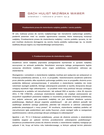 Przedawnienie prawa do stwierdzenia nadpłaty podatku i zwrotu podatku W celu realizacji prawa do zwrotu nadpłaconego lub nienależnie zapłaconego podatku, podatnik powinien mieć na uwadze ograniczenia czasowe, które towarzyszą instytucji nadpłaty. Przedawnienie prawa do stwierdzenia nadpłaty i zwrotu podatku sprawia, że nie jest możliwe skuteczne domaganie się zwrotu kwoty podatku wpłaconego np. na skutek wadliwej decyzji organu czy nieprawidłowego samowymiaru. 1. Przedawnienie prawa do stwierdzenia nadpłaty Zasadniczo zwrot nadpłaty poprzedza postępowanie wymiarowe w sprawie nadpłaty wszczynane na wniosek podatnika. Rezultatem wszczęcia takiego postępowania będzie zazwyczaj określenie nadpłaty przez organ podatkowy, ewentualnie odmowa jej stwierdzenia. Wystąpienie z wnioskiem o stwierdzenie nadpłaty możliwe jest wyłącznie we wskazanym w Ordynacji podatkowej zakresie, tj. m.in. w przypadku kwestionowania zasadności pobrania przez płatnika podatku albo wysokości pobranego podatku oraz w przypadku złożenia przez podatnika deklaracji samowymiarowej. Z wnioskiem o stwierdzenie nadpłaty nie może natomiast wystąpić podatnik, którego zobowiązanie powstało w wyniku doręczenia decyzji ustającej wysokość tego zobowiązania - za przykład może tutaj posłużyć decyzja ustalająca zobowiązanie w podatku od nieruchomości. Jak wskazał NSA w wyroku z dnia 26 stycznia 2011, II FSK 1769/10), „instytucja stwierdzenia nadpłaty nie znajduje zastosowania we wszystkich wypadkach powstania nadpłaty w rozumieniu przepisów Ordynacji podatkowej, lecz jedynie wówczas, gdy powstanie nadpłaty nie jest skutkiem działania systemu podatkowego, błędnych decyzji organów podatkowych - ale jest efektem pomyłki lub wadliwego działania samego podatnika, płatnika lub inkasenta w zakresie zobowiązań podatnika powstających z mocy prawa”. W rezultacie, stwierdzenie nadpłaty podatku od nieruchomości (gdy podatnikiem jest osoba fizyczna) „może nastąpić tylko w następstwie wyeliminowania z obrotu prawnego decyzji ustalającej to zobowiązanie”. Zgodnie z art. 79 § 2 Ordynacji podatkowej, „prawo do złożenia wniosku o stwierdzenie nadpłaty wygasa po upływie terminu przedawnienia zobowiązania podatkowego”. Zasadniczo przedawnienie prawa do złożenia wniosku o stwierdzenie nadpłaty następuje po upływie 5 lat, licząc od końca roku kalendarzowego, w którym upłynął termin płatności GACH, HULIST, MIZIŃSKA, WAWER – ADWOKACI I RADCOWIE PRAWNI SP.P. podatku (art. 70 Ordynacji podatkowej). Konsekwencją zastosowania takiego rozwiązania jest wydłużenie czasu na wniesienie wniosku o stwierdzenie nadpłaty w przypadku zawieszenia albo przerwania biegu terminu przedawnienia. Problematyczne na tym tle może być określenie terminu przedawnienia, w przypadku gdy podatnik dokonał wpłaty „podatku” mimo braku istnienia po jego stronie jakiegokolwiek zobowiązania. Wydaje się, że możliwym rozwiązaniem tego problemu mogłoby być przyjęcie, że termin ten należy liczyć od momentu powstania fikcyjnego zobowiązania, tj. momentu wystąpienia zdarzenia z którym organ podatkowy/podatnik powiązał obowiązek zapłaty podatku. Nie należy wiązać momentu przedawnienia zobowiązania podatkowego z niemożliwością dochodzenia w jakikolwiek sposób nienależnie wpłaconego podatku. Do przedawnienia zobowiązania podatkowego może dojść w czasie rozpatrywania przez organ podatkowy prawidłowo złożonego wniosku o stwierdzenie nadpłaty, nie można jednak stwierdzić, że postępowanie jest w tym przypadku bezprzedmiotowe. Jak wskazał NSA w Warszawie w wyroku z dnia 2 marca 2012 r., II FSK 1849/11: „Przedawnienie zobowiązania podatkowego nie powoduje niemożności wydania decyzji w sprawie stwierdzenia nadpłaty, skoro istotą sprawy jest (…) stwierdzenie, czy część (całość) kwoty zapłaconej jako podatek faktycznie nie jest podatkiem należnym”. 2. Przedawnienie prawa do zwrotu nadpłaty podatku Drugim ograniczeniem czasowym, które towarzyszy instytucji nadpłaty jest przedawnienie prawa do zwrotu nadpłaty. Prawo to powstaje w stosunku do nadpłaty ujawnionej i wymagalnej. „Niestwierdzona w postępowaniu nadpłata nie może być wymagalna, a zatem nie rozpoczyna się w takim przypadku w ogóle bieg terminu przedawnienia prawa do zwrotu (zadysponowania) nadpłaty” – tak WSA w Krakowie w wyroku z dnia 15 grudnia 2006 r., I SA/KR 728/05. Zgodnie z art. 80 § 1 Ordynacji podatkowej „prawo do zwrotu nadpłaty podatku wygasa po upływie 5 lat, licząc od końca roku kalendarzowego, w którym upłynął termin jej zwrotu”. Zwrot lub zaliczenie nadpłaty na poczet istniejących lub przyszłych zobowiązań podatkowych następuje z kolei w terminach wskazanych w art. 77 Ordynacji podatkowej. Bieg terminu do zwrotu nadpłaty może zostać przerwany w następstwie złożenia wniosku o: stwierdzenie nadpłaty; zwrot nadpłaty; zaliczenie nadpłaty na poczet przyszłych zobowiązań podatkowych. GACH, HULIST, MIZIŃSKA, WAWER – ADWOKACI I RADCOWIE PRAWNI SP.P. Nic nie stoi na przeciwko temu, aby bieg terminu do zwrotu został przerywany wielokrotnie – np. wskutek wystąpienia z innym wnioskiem spośród wyżej przywołanego katalogu. Brak dokonania zwrotu nadpłaty przez organ we wskazanym przez ustawę terminie powoduje wygaśnięcie przysługującego podatnikowi uprawnienia do otrzymania nadpłaconego podatku Rozwiązanie to stosowane jest również w stosunku do zwrotu podatku, co do którego nie znajdują jednak zastosowania przepisy dotyczące wygaśnięcia prawa do złożenia wniosku o stwierdzenie nadplaty (art. 79 § 2 Ordynacji podatkowej) oraz przepisy regulujące terminy zwrotu nadpłaty (art. 77 § 1 Ordynacji podatkowej). Należy powtórzyć za WSA w Łodzi (wyrok z dnia 9 lipca 2014 r., III SA/Łd 368/14), że „skoro (….) do zwrotu podatku należy odpowiednio stosować spośród tych przepisów jedynie art