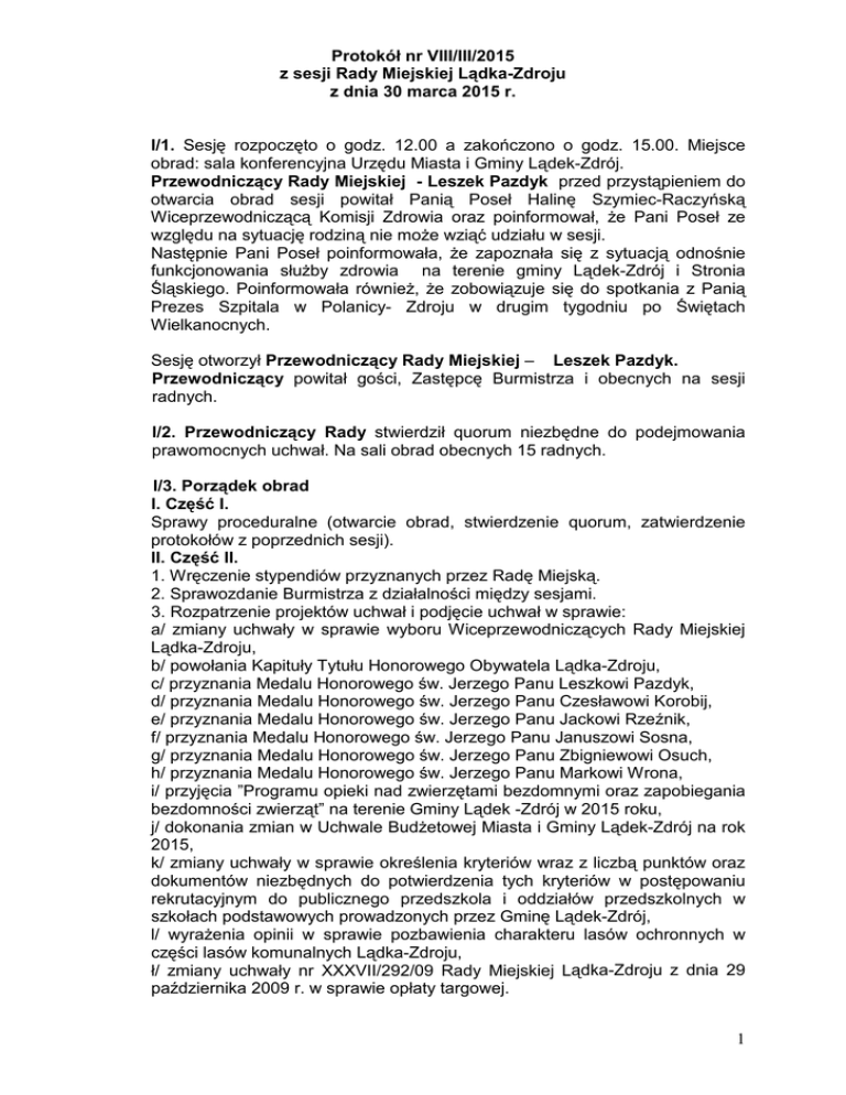 Protokół nr VIII/III/2015 z sesji Rady Miejskiej Lądka-Zdroju z dnia 30 marca 2015 r. I/1. Sesję rozpoczęto o godz. 12.00 a zakończono o godz. 15.00. Miejsce obrad: sala konferencyjna Urzędu Miasta i Gminy Lądek-Zdrój. Przewodniczący Rady Miejskiej - Leszek Pazdyk przed przystąpieniem do otwarcia obrad sesji powitał Panią Poseł Halinę Szymiec-Raczyńską Wiceprzewodniczącą Komisji Zdrowia oraz poinformował, że Pani Poseł ze względu na sytuację rodziną nie może wziąć udziału w sesji. Następnie Pani Poseł poinformowała, że zapoznała się z sytuacją odnośnie funkcjonowania służby zdrowia na terenie gminy Lądek-Zdrój i Stronia Śląskiego. Poinformowała również, że zobowiązuje się do spotkania z Panią Prezes Szpitala w Polanicy- Zdroju w drugim tygodniu po Świętach Wielkanocnych. Sesję otworzył Przewodniczący Rady Miejskiej – Leszek Pazdyk. Przewodniczący powitał gości, Zastępcę Burmistrza i obecnych na sesji radnych. I/2. Przewodniczący Rady stwierdził quorum niezbędne do podejmowania prawomocnych uchwał. Na sali obrad obecnych 15 radnych. I/3. Porządek obrad I. Część I. Sprawy proceduralne (otwarcie obrad, stwierdzenie quorum, zatwierdzenie protokołów z poprzednich sesji). II. Część II. 1. Wręczenie stypendiów przyznanych przez Radę Miejską. 2. Sprawozdanie Burmistrza z działalności między sesjami. 3. Rozpatrzenie projektów uchwał i podjęcie uchwał w sprawie: a/ zmiany uchwały w sprawie wyboru Wiceprzewodniczących Rady Miejskiej Lądka-Zdroju, b/ powołania Kapituły Tytułu Honorowego Obywatela Lądka-Zdroju, c/ przyznania Medalu Honorowego św. Jerzego Panu Leszkowi Pazdyk, d/ przyznania Medalu Honorowego św. Jerzego Panu Czesławowi Korobij, e/ przyznania Medalu Honorowego św. Jerzego Panu Jackowi Rzeźnik, f/ przyznania Medalu Honorowego św. Jerzego Panu Januszowi Sosna, g/ przyznania Medalu Honorowego św. Jerzego Panu Zbigniewowi Osuch, h/ przyznania Medalu Honorowego św. Jerzego Panu Markowi Wrona, i/ przyjęcia ”Programu opieki nad zwierzętami bezdomnymi oraz zapobiegania bezdomności zwierząt” na terenie Gminy Lądek -Zdrój w 2015 roku, j/ dokonania zmian w Uchwale Budżetowej Miasta i Gminy Lądek-Zdrój na rok 2015, k/ zmiany uchwały w sprawie określenia kryteriów wraz z liczbą punktów oraz dokumentów niezbędnych do potwierdzenia tych kryteriów w postępowaniu rekrutacyjnym do publicznego przedszkola i oddziałów przedszkolnych w szkołach podstawowych prowadzonych przez Gminę Lądek-Zdrój, l/ wyrażenia opinii w sprawie pozbawienia charakteru lasów ochronnych w części lasów komunalnych Lądka-Zdroju, ł/ zmiany uchwały nr XXXVII/292/09 Rady Miejskiej Lądka-Zdroju z dnia 29 października 2009 r. w sprawie opłaty targowej. 1 4. Zapoznanie się z funkcjonowaniem służby zdrowia na terenie Miasta i Gminy Lądek-Zdrój. 5. Sprawozdanie za 2014 rok z realizacji zadań publicznych w ramach ogłoszonych konkursów dla organizacji pozarządowych. 6. Informacja o realizacji świadczeń rodzinnych, ustawy o pomocy osobom uprawnionym do alimentów w latach 2013-2014. 7. Sprawozdanie z działalności Gminnego Zespołu Interdyscyplinarnego ds. Przeciwdziałania Przemocy w Rodzinie w Lądku-Zdroju za rok 2014. 8. Interpelacje, zapytania, wnioski i sprawy różne. 9. Zamknięcie obrad. Następnie Przewodniczący Rady przedstawił zmiany do porządku obrad. Punkt 2 - sprawozdanie Burmistrza z działalności między sesjami zostanie przeniesiony do punktu 8. I/3. Zatwierdzenie protokołów z poprzednich sesji. Przewodniczący Rady poddał pod głosowanie protokoły z poprzednich sesji. W wyniku głosowania przy 15 głosach „za” Rada przyjęła jednogłośnie protokoły z poprzednich sesji. Ad. pkt 1 Wręczenie stypendiów przyznanych przez Radę Miejską. Przewodniczący Rady przypomniał, że Rada przyznała stypendium sportowe Katarzynie Ożga i Weronice Ożga. Na wręczenie stypendium przybyły uczennice Szkoły Podstawowej Nr 1 w Lądku-Zdroju wraz z matką. Uczennicom wręczyli stypendium i złożyli gratulacje: Przewodniczący Rady Leszek Pazdyk, W-ce Przewodniczący Rady Jan Zawadzki. Ad. pkt 3 Rozpatrzenie projektów uchwał i podjęcie uchwał w sprawie: a/ zmiany uchwały w sprawie wyboru Wiceprzewodniczących Rady Miejskiej Lądka-Zdroju Przewodniczący Rady poprosił o zgłaszanie się radnych do pracy w Komisji Skrutacyjnej. Skład osobowy Komisji Skrutacyjnej: Tomasz Stuła – Przewodniczący Komisji Skrutacyjnej, Jolanta Kotlarz - członek , Łukasz Mróz– członek. Następnie w wyniku głosowania przy 15 głosach „za” przyjęto skład osobowy Komisji Skrutacyjnej. Przewodniczący Rady poprosił o zgłaszanie kandydatów na Wiceprzewodniczącego Rady Miejskiej Lądka-Zdroju wraz jednocześnie z krótką charakterystyką kandydata. Radny Tomasz Nowicki zgłosił kandydaturę radnej Doroty Urbańczyk oraz przybliżył radnym jej osobę. Radna Dorota Urbańczyk wyraziła zgodę. 2 Przewodniczący Rady zarządził przerwę w obradach w celu przygotowania kart do głosowania. Po przerwie radny Tomasz Stuła Przewodniczący Komisji Skrutacyjnej przedstawił radnym zasady głosowania oraz poinformował, iż głosowanie jest tajne. Radny Tomasz Stuła rozdał karty do głosowania, a następnie wyczytywani przez niego kolejni radni podchodzili do specjalnie przygotowanego miejsca celem oddania głosu. Po zakończeniu głosowania Przewodniczący Rady zarządził przerwę, aby Komisja Skrutacyjna mogła ogłosić wyniki głosowania. Po przerwie radny Tomasz Stuła przedstawił wyniki głosowania, odczytując protokół z pracy Komisji Skrutacyjnej, który stanowi załącznik do niniejszego protokołu wraz z kartami do głosowania. W wyniku głosowania tajnego przy 11 głosach „za” , 3 głosach „przeciw” i 1 głosie „wstrzymującym” Wiceprzewodniczącą Rady Miejskiej Lądka-Zdroju została Pani Dorota Urbańczyk. Rada podjęła uchwałę nr VIII/39/15, któr