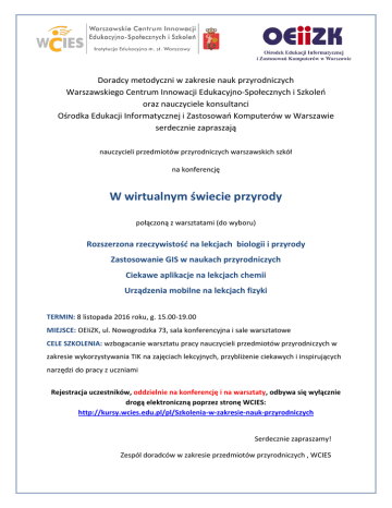 Doradcy metodyczni w zakresie nauk przyrodniczych Warszawskiego Centrum Innowacji Edukacyjno-Społecznych i Szkoleń oraz nauczyciele konsultanci Ośrodka Edukacji Informatycznej i Zastosowań Komputerów w Warszawie serdecznie zapraszają nauczycieli przedmiotów przyrodniczych warszawskich szkół na konferencję W wirtualnym świecie przyrody połączoną z warsztatami (do wyboru) Rozszerzona rzeczywistość na lekcjach biologii i przyrody Zastosowanie GIS w naukach przyrodniczych Ciekawe aplikacje na lekcjach chemii Urządzenia mobilne na lekcjach fizyki TERMIN: 8 listopada 2016 roku, g. 15.00-19.00 MIEJSCE: OEIiZK, ul. Nowogrodzka 73, sala konferencyjna i sale warsztatowe CELE SZKOLENIA: wzbogacanie warsztatu pracy nauczycieli przedmiotów przyrodniczych w zakresie wykorzystywania TIK na zajęciach lekcyjnych, przybliżenie ciekawych i inspirujących narzędzi do pracy z uczniami Rejestracja uczestników, oddzielnie na konferencję i na warsztaty, odbywa się wyłącznie drogą elektroniczną poprzez stronę WCIES: http://kursy.wcies.edu.pl/pl/Szkolenia-w-zakresie-nauk-przyrodniczych Serdecznie zapraszamy! Zespól doradców w zakresie przedmiotów przyrodniczych , WCIES PROGRAM KONFERENCJI W wirtualnym świecie przyrody 14.45 – 15.00 Rejestracja uczestników 15.00 – 15.10 Przywitanie uczestników, uroczyste rozpoczęcie konferencji Urszula Depczyk (WCIES), Elżbieta Kawecka (OEIiZK) 15.10-15.35 Przyrodnicy w terenie z technologią w kieszeni Elżbieta Kawecka, Małgorzata Witecka (OEIiZK) 15.35-16.00 Z technologią w świat nauki Renata Sidoruk-Sołoducha (OEIiZK) 16.00-16.30 Scientix inspiracją do innowacyjnego nauczania przedmiotów przyrodniczych Elżbieta Kawecka (OEIiZK) 16.30-16.45 Przerwa WARSZTATY METODYCZNE (do wyboru) 16.45 – 19.00 Rozszerzona rzeczywistość na lekcjach przyrody i biologii Małgorzata Witecka(OEIiZK), Urszula Depczyk (WCIES) Zastosowanie GIS w naukach przyrodniczych Anna Grzybowska (OEIiZK), Marta Czerniak-Czyżniak (WCIES) Ciekawe aplikacje na lekcjach chemii Małgorzata Chmurska(OEIiZK), Hanna Rokita(WCIES) Urządzenia mobilne na lekcjach fizyki Elżbieta Kawecka(OEIiZK), Ewa Sołowiej-Mędrzak(WCIES) 18.50 – 19.00 Podsumowanie szkolenia – Urszula Depczyk, Elżbieta Kawecka