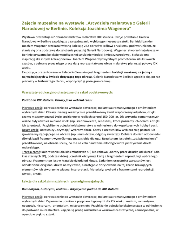 Zajęcia muzealne na wystawie „Arcydzieła malarstwa z Galerii Narodowej w Berlinie. Kolekcja Joachima Wagenera” Wystawa prezentuje 67 obrazów mistrzów malarstwa XIX stulecia. Swoje powstanie Galeria Narodowa w Berlinie zawdzięcza zaangażowaniu wybitnego mecenasa sztuki. Berliński bankier Joachim Wagener przekazał własną kolekcję 262 obrazów królowi pruskiemu pod warunkiem, że stanie się ona podstawą do założenia przyszłej Galerii Narodowej. Wagener stworzył największą w Berlinie prywatną kolekcję współczesnej sztuki niemieckiej i międzynarodowej. Stała się ona inspiracją dla innych kolekcjonerów. Joachim Wagener był wybitnym promotorem sztuki swoich czasów, a zebrane przez niego prace dają reprezentatywny obraz malarstwa pierwszej połowy XIX wieku. Ekspozycja prezentowana w Pałacu Królewskim jest fragmentem kolekcji uważanej za jedną z najważniejszych w świecie dotyczącą tego okresu. Galeria Narodowa w Berlinie zgodziła się, po raz pierwszy w historii tego zbioru, wypożyczyć ją poza granice kraju. Warsztaty edukacyjno-plastyczne dla szkół podstawowych: Podróż do XIX stulecia. Obrazy jako wehikuł czasu Pierwsza część: oprowadzenie po wystawie dotyczącej malarstwa romantycznego z omówieniem wybranych dzieł. Obrazy ukazują realistycznie przedstawiony świat współczesny artystom, dzięki czemu możemy poznać życie codzienne w realiach sprzed 150-200 lat. Dla artystów romantycznych ważne były również minione wieki (np. średniowiecze, renesans), które poznamy ich oczami i dzięki ich talentowi. Przybliżenie pojęcia kolekcjonerstwa w odniesieniu do współczesnych hobby i pasji. Druga część: uczestnicy „ożywiają” wybrany obraz. Każdy z uczestników wybiera rolę postaci lub zjawiska występującego na obrazie (np. szum drzew, odgłosy zwierząt). Dobiera do nich odpowiedni dźwięk bądź fragment wymyślonego przez siebie dialogu. Rezultatem jest efekt „udźwiękowienia” przedstawionej na obrazie sceny, co ma na celu nauczenie młodego widza przeżywania dzieła malarskiego. Trzecia część: kolorowanki (dla klas młodszych SP) lub zabawa „obrazy przez dziurkę od klucza” (dla klas starszych SP), podczas której uczestnik otrzymuje kartę z fragmentem reprodukcji wybranego obrazu. Fragment ten jest w kształcie dziurki od klucza. Zadaniem uczestnika warsztatów jest odnalezienie oryginału dzieła na wystawie, a następnie dorysowanie na tej karcie brakujących elementów lub stworzenie własnej interpretacji. Materiały: wydruki z fragmentami reprodukcji, ołówki, kredki. Lekcja dla szkół gimnazjalnych i ponadgimnazjalnych: Romantyzm, historyzm, realizm… Artystyczna podróż do XIX stulecia Pierwsza część: oprowadzenie po wystawie dotyczącej malarstwa romantycznego z omówieniem wybranych dzieł. Zapoznanie uczniów z pojęciami typowymi dla XIX wieku: realizm, romantyzm, neogotyk, historyzm, orientalizm, mistycyzm etc. Przybliżenie pojęcia kolekcjonerstwa w odniesieniu do podwalin muzealnictwa. Zajęcia są próbą rozbudzenia wrażliwości estetycznej i emocjonalnej w oparciu o piękno sztuki. Druga część: uczestnicy „ożywiają” wybrany obraz. Każdy z uczestników wybiera rolę postaci lub zjawiska występującego na obrazie (np. szum drzew, odgłosy zwierząt). Dobiera do nich odpowiedni dźwięk bądź fragment wymyślonego przez siebie dialogu. Rezultatem jest efekt „udźwiękowienia” przedstawionej na obrazie sceny, co ma na celu nauczenie młodego widza przeżywania dzieła malarskiego. Zajęcia będą odbywały się w Muzeum Historycznym (Pałac Królewski), ul. Kazimierza Wielkiego 35, Wrocław, od 5 października 2016 do 13 stycznia 2017. Godziny: 10.10 - 14.00 Czas trwania: 60 minut lekcja; 80 minut warsztaty Koszt: 4 zł od ucznia - lekcja; 5 zł od ucznia – warsztaty Informacje i rezerwacje: 71 391 69 40 wew. 113 661 349 411 [email protected] [email protected]
