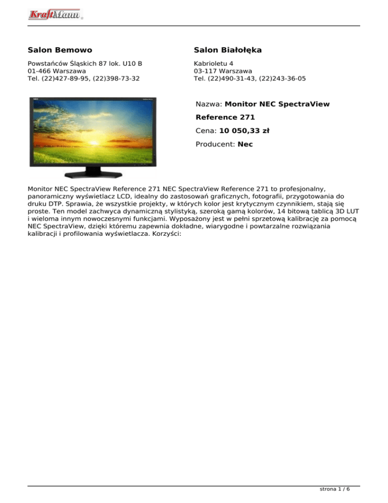Salon Bemowo Salon Białołęka Powstańców Śląskich 87 lok. U10 B 01-466 Warszawa Tel. (22)427-89-95, (22)398-73-32 Kabrioletu 4 03-117 Warszawa Tel. (22)490-31-43, (22)243-36-05 Nazwa: Monitor NEC SpectraView Reference 271 Cena: 10 050,33 zł Producent: Nec Monitor NEC SpectraView Reference 271 NEC SpectraView Reference 271 to profesjonalny, panoramiczny wyświetlacz LCD, idealny do zastosowań graficznych, fotografii, przygotowania do druku DTP. Sprawia, że wszystkie projekty, w których kolor jest krytycznym czynnikiem, stają się proste. Ten model zachwyca dynamiczną stylistyką, szeroką gamą kolorów, 14 bitową tablicą 3D LUT i wieloma innym nowoczesnymi funkcjami. Wyposażony jest w pełni sprzetową kalibrację za pomocą NEC SpectraView, dzięki któremu zapewnia dokładne, wiarygodne i powtarzalne rozwiązania kalibracji i profilowania wyświetlacza. Korzyści: strona 1 / 6 Zgodność kolorów - dzięki ekranowi 10-bit P-IPS TFT w panoramicznym formacie 16:10. Technologia True Colours - z szerokim gamutem barwowym (107% wielkości/98% pokrycia AdobeRGB) oraz w pełni kalibrowalną 14-bitową tablicą LUT dla 42-bitowego sterowania kolorami i korekcją gamma, niezależnie od koloru i wejścia. strona 2 / 6 Gwarancja "zero uszkodzonych pikseli" - do 6 miesięcy od daty zakupu. Ergonomiczne wzornictwo - wygodne praca dzięki technologii ErgoDesign® i TORO™. Kompensacja starzenia świetlówek (Backlight Ageing Correction) - jasność i biel zawsze na tym samym poziomie. strona 3 / 6 Łatwość tworzenia i kalibracji - dzięki oprogramowaniu SpectraView® Profiler, dokumentowi SpectraView® certifier oraz zdejmowanej osłonie ekranu wraz z akcesoriami. Cechy szczególne - Adjustable power LED (colour and brightness); AmbiBright; Auto Black Level; AutoBright; Auto Brightness; Auto Contrast; Korekta przyciemniania podświetlenia; strona 4 / 6 CableComp with Sync Continuity Detection; DDC/CI compatible; Digital Uniformity Control (ColorComp); Direct Brightness and Contrast; EcoModes; GammaComp (14 bit Look Up Table) and 14 bit Gamma Correction; NaViSet®and NaViSet®Administrator compatible; OmniColor™ : sRGB and 6-Axis-Colour-Control; Overdrive; Picture-in-Picture Mode; Quick strona 5 / 6 release Stand and Handle; RapidMotion; Rapid Response Technology; Real Time Clock with Scheduler (Power-On and Power-Off Timer); SpectraView® Profiler Software; Self Diagnostics; Sześcioosiowe sterowanie kolorem Monitor NEC SpectraView Reference 271 podobnie jak inne profesjonalne monitory graficzne, posługuje się sześcioosiowym systemem regulacji kolorów. Balans bieli jest tu oparty nie tylko na standardowych barwach czerwonej, zielonej i niebieskiej, ale także na podstawowych kolorach drukarskich - cyjan, magenta i żółty. Każdy z nich może być kalibrowany TileComp; TileMatrix; TORO™ Design; Windows compatible niezależnie, bez wpływu na biały. CableComp Długość 7kabla sygnałowego jest z reguły ograniczona. Wraz ze wzrostem długości przewodu, spada jakość obrazu. Dzięki technologii CableComp ekrany mogą być umieszczane nawet w odległości 100 metrów od źródła sygnału bez najmniejszej utraty jakości obrazu. NaviSet Aby w pełni korzystać z możliwości monitora, firma NEC stworzyła oprogramowanie NEC NaviSet, dzięki któremu można kontrolować wyświetlany obraz przy pomocy myszki i klawiatury. Toro-Design Ogromną zaletą monitorów LCD jest ich bardzo mała waga, jednak niewielu producentów wykorzystuje tą cechę tak, jak robi to firma NEC. Dzięki projektowi obudowy Toro-Design, monitor może być nie tylko odłączony od stojaka i zawieszony na ścianie (w orientacji panoramicznej lub portretowej); istnieje również możliwość obrotu ekranu na podstawce. Monitor automatycznie wykrywa położenie ekranu i dostosowuje format wyświetlanego obrazu do aktualnej pozycji. strona 6 / 6 Powered by TCPDF (www.tcpdf.org)