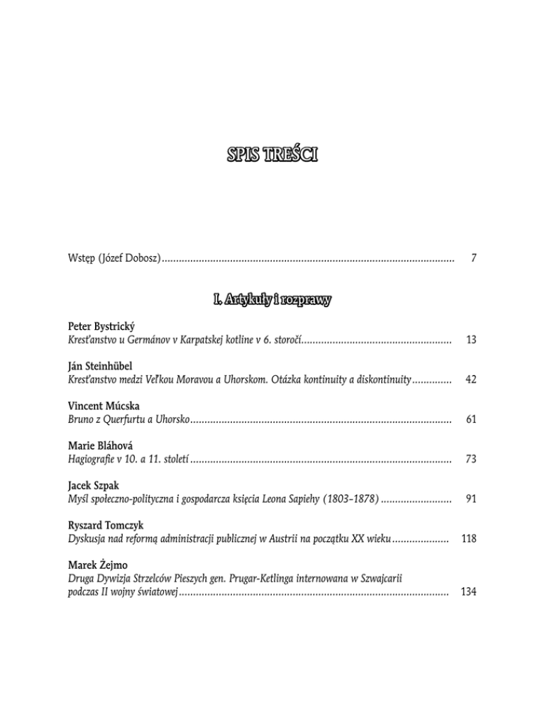 SPIS TREŚCI Wstęp (Józef Dobosz) ....................................................................................................... 7 I. Artykuły i rozprawy Peter Bystrický Kresťanstvo u Germánov v Karpatskej kotline v 6. storočí..................................................... 13 Ján Steinhübel Kresťanstvo medzi Veľkou Moravou a Uhorskom. Otázka kontinuity a diskontinuity .............. 42 Vincent Múcska Bruno z Querfurtu a Uhorsko ............................................................................................ 61 Marie Bláhová Hagiografie v 10. a 11. století ............................................................................................ 73 Jacek Szpak Myśl społeczno-polityczna i gospodarcza księcia Leona Sapiehy (1803–1878) ......................... 91 Ryszard Tomczyk Dyskusja nad reformą administracji publicznej w Austrii na początku XX wieku .................... 118 Marek Żejmo Druga Dywizja Strzelców Pieszych gen. Prugar-Ketlinga internowana w Szwajcarii podczas II wojny światowej ............................................................................................... 134 4 SPIS TREŚCI II. Recenzje Dušan Škvarna, Adam Hudek Cyril a Metod v historickom vedomí a pamäti 19. a 20. storočia na Slovensku, Historický ústav Slovenskej akadémie vied, Bratislava 2013 (Miroslav Lysý) ......................... 154 Ingrid Kušniráková a kol. „Vyjdeme v noci vo fakľovom sprievode a rozsvietime svet”. Integračný a mobilizačný význam slávností v živote spoločnosti, Historický ústav Slovenskej akadémie vied, Bratislava 2012 (Dušan Škvarna) ............................................................................................................ 158 III. Sprawozdania Konferencja Europa Środkowa – podobieństwa, różnice, perspektywy, Poznań 9 maja 2014 roku (Jakub Wojtczak) ............................................................................................................ 162 Czwarta Międzynarodowa Konferencja Młodych Slawistów, Budapeszt 25 kwietnia 2014 roku (Robert Tomczak, Jakub Wojtczak) ................................................................................... 166 Wykaz skrótów ...................................................................................................................... 169 Informacje dla autorów ......................................................................................................... 171 Informace pro autory ............................................................................................................ 174 OBSAH Úvod (Józef Dobosz) ........................................................................................................ 7 I. Články a studie Peter Bystrický Křesťanství u Germánů v Karpatské kotlině v 6. století ........................................................ 13 Ján Steinhübel Křesťanství mezi Velkou Moravou a Uherskem. Otázka kontinuity a diskontinuity ................. 42 Vincent Múcska Bruno z Querfurtu a Uhersko ............................................................................................ 61 Marie Bláhová Hagiografie v 10. a 11. století ............................................................................................ 73 Jacek Szpak Sociálně-politické a hospodářské ideje knížete Leona Sapiehy (1803–1878) ............................. 91 Ryszard Tomczyk Diskuse o reformě veřejné administrace v Rakousku na začátku 20. století ............................. 118 Marek Żejmo Druhá divize střelecké pěchoty gen. Prugar-Ketlinga internovaná ve Švýcarsku během 2. světové války ............................................................................................................... 134 6 OBSAH II. Recenze Dušan Škvarna, Adam Hudek Cyril a Metod v historickom vedomí a pamäti 19. a 20. storočia na Slovensku, Historický ústav Slovenskej akadémie vied, Bratislava 2013 (Miroslav Lysý) ................................................. 154 Ingrid Kušniráková a kol. „Vyjdeme v noci vo fakľovom sprievode a rozsvietime svet”. Integračný a mobilizačný význam slávností v živote spoločnosti, Historický ústav Slovenskej akadémie vied, Bratislava 2012 (Dušan Škvarna) ............................................................................................................ 158 III. Zprávy Konference Europa Środkowa – podobieństwa, różnice, perspektywy [Střední Evropa – podotnosti, rozdíly, perspektivy], Poznań 9. května 2014 (Jakub Wojtczak) 162 Čtvrtá mezinárodní konference mladých slavistů, Budapešť 25. dubna 2014 (Robert Tomczak, Jakub Wojtczak) ................................................................................... 166 Seznam zkratek ...................................................................................................................... 169 Informacje dla autorów ......................................................................................................... 171 Informace pro autory ............................................................................................................ 174