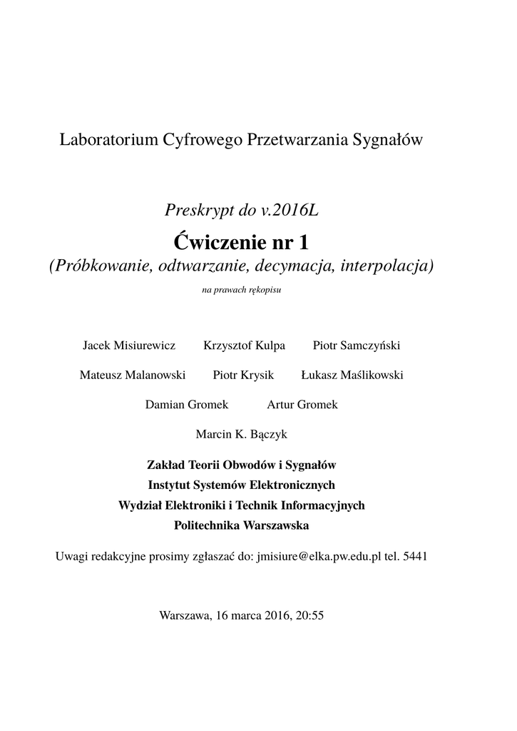 Laboratorium Cyfrowego Przetwarzania Sygnałów Preskrypt do v.2016L Ćwiczenie nr 1 (Próbkowanie, odtwarzanie, decymacja, interpolacja) na prawach rękopisu Jacek Misiurewicz Krzysztof Kulpa Mateusz Malanowski Piotr Krysik Damian Gromek Piotr Samczyński Łukasz Maślikowski Artur Gromek Marcin K. Bączyk Zakład Teorii Obwodów i Sygnałów Instytut Systemów Elektronicznych Wydział Elektroniki i Technik Informacyjnych Politechnika Warszawska Uwagi redakcyjne prosimy zgłaszać do: [email protected] tel. 5441 Warszawa, 16 marca 2016, 20:55 Spis treści 1 Próbkowanie, odtwarzanie, decymacja, interpolacja 1.1 Podstawy teoretyczne . . . . . . . . . . . . . . . 1.1.1 Sygnał dyskretny . . . . . . . . . . . . . 1.1.2 Redukcja i ekspansja próbek . . . . . . . 1.1.3 Zadania do pracy własnej studenta . . . . 1.2 Dostępny sprzęt i oprogramowanie . . . . . . . . R . . . . . . . . . . 1.2.1 Skrypty MATLABa⃝ 1.2.2 Aparatura . . . . . . . . . . . . . . . . . 1.3 Eksperymenty do wykonania w laboratorium . . 1.3.1 Sygnał dyskretny i jego widmo . . . . . . 1.3.2 Efekty kwantowania . . . . . . . . . . . 1.3.3 Redukcja i ekspansja próbek . . . . . . . 2 . . . . . . . . . . . . . . . . . . . . . . . . . . . . . . . . . . . . . . . . . . . . . . . . . . . . . . . . . . . . . . . . . . . . . . . . . . . . . . . . . . . . . . . . . . . . . . . . . . . . . . . . . . . . . . . . . . . . . . . . . . . . . . . . . . . . . . . . . . . . . . . . . . . . . . . . . . . . . . . . . . . . . 3 3 3 11 14 15 15 16 18 19 22 23 Ćwiczenie 1 Próbkowanie, odtwarzanie, decymacja, interpolacja Opiekun ćwiczenia: JM 1.1. Podstawy teoretyczne Celem ćwiczenia jest opanowanie nastepujących zagadnień: – okresowy sygnał dyskretny: pojecie okresu, częstotliwości (unormowanej), ich związku z częstotliwością i okresem “fizycznym” (sygnału analogowego); – okresowość widma sygnału dyskretnego; – ekspansja (upsampling) i redukcja (downsampling) próbek i ich wpływ na widmo; – odtwarzanie sygnału z próbek (idealne i nieidealne) – (dodatkowo) efekty kwantyzacji sygnału. 1.1.1. Sygnał dyskretny W ćwiczeniu tym sygnał dyskretny x[n] będzie na ogół traktowany jako ciąg liczbowy {x(n)}, którego elementami są próbki x(n) (notacja z użyciem różnych nawiasów podkreśla rozróżnienie pomiędzy całym sygnałem a pojedynczą próbką). Najczęściej spotyka się sytuację, gdy sygnał x[n] jest wynikiem próbkowania pewnego sygnału analogowego xa (t). Warto zauważyć, że czasami takiego “analogowego prototypu” jednak nie ma, i sygnał jest od razu dyskretny. W typowym przypadku tzw. próbkowania równomiernego1 próbki x(n) są równe wartościom sygnału analogowego xa (t) mierzonym w chwilach tn = n · Ts , gdzie Ts jest okresem próbkowania. Zmienna n oznacza czas dyskretny tn unormowany względem okresu próbkowania Ts (patrz rys. 1.1). Ostatecznie więc operację próbkowania można w dzedzinie czasu zapisać wzorem x(n) = xa (n · Ts ) (1.1) 1 Nierównomierne próbkowanie stosuje się tylko w bardzo szczególnych zastosowaniach – np. w niektórych typach radarów. 3 4 Próbkowanie, odtwarzanie, decymacja, interpolacja 2016-03-16 20:55 Rys. 1.1: Sygnał analogowy xa (t) i sygnał dyskretny x[n] otrzymamy przez próbkowanie xa (t) z okresem Ts Sygnały z czasem dyskretnym przetwarzane są zazwyczaj w urządzeniach cyfrowych – faktycznie jednak przetwarzane są sygnały cyfrowe xc [n] = Q(x[n]) , gdzie Q oznacza operację kwantowania, wprowadzającą pewne różnice pomiędzy x(n) i xc (n) – błędy kwantowania. W analizie problemów rozpatrywanych w tym ćwiczeniu nie będziemy uwzględniać błędów kwantowania, tzn. będziemy niejako utożsamiać sygnały dyskretne z cyfrowymi (liczba bitów typowego współczesnego przetwornika A/C jest na tyle duża, że uzasadnia przyjęcie zależności xc [n] = Q(x[n]) ≈ x[n] ). Jedynie w punkcie 1.3.2 spróbujemy eksperymentalnie zbadać wpływ kwantowania na jakość sygnału dźwiękowego. Teoria próbkowania rozwijała się bardzo dynamicznie w początku XX wieku. Zajmowało się nią wielu naukowców (Whittaker, Kotielnikow, Shannon, Gabor, Kupfmüller...), i do dziś w różnych tradycjach nazywa się ją różnymi nazwiskami. My na wszelki wypadek bedziemy używać nazwy “Twierdzenie o próbkowaniu” (The Sampling Theorem), chociaż np. matematycy woleliby “Kardynalne twierdzenie teorii interpolacji” (Cardinal Theorem of the Interpolation Theory)... 1.1.1.1. Próbkowanie sygnału Proces próbkowania sygnału ((1.1)) można matematycznie opisać jako wymnożenie przez ciąg impulsów jednostkowych (impulsów Diraca δ(t)) umieszczonych w chwilach nTs . Lekko zaniedbując poprawność matematyczną2 , zauważmy, że mnożenie sygnałów odpowiada splataniu ich widm. Widmem ciągu impulsów umieszczonych w odstępach czasowych Ts s(t) = +∞ X δ(t − nTs ) (1.2) n=−∞ jest ciąg impulsów umieszczonych w odstępach fs = 1/TS w częstotliwości (patrz rys. 1.2). Co więc stanie się z widmem sygnału wskutek próbkowania? Załóżmy, że próbkujemy sygnał analogowy xa (t), którego widmo oznaczymy jako Xa (f ). Splot danej funkcji Xa (f ) z przesuniętym o fs impulsem jednostkowym δ(f − fs ) odpowiada przesunięciu tej funkcji w prawo o odcinek o długości fs (rys. 1.3). Splot z całym ciągiem impulsów rozmieszczonych 2 Np. nie zastanawiamy się tu do jakiej klasy należą rozpatrywane sygnały, a więc jak konkretnie zdefiniowane jest pojęcie ich widma. 2016-03-16 20:55 Próbkowanie, odtwarzanie, decymacja, interpolacja Rys. 1.2: Ciąg impulsów jednostkowych i jego widmo Rys. 1.3: Splot widma sygnału z pojedynczą składową widma ciągu s(t) 5 6 Próbkowanie, odtwarzanie, decymacja, interpolacja 2016-03-16 20:55 Rys. 1.4: Powielenie widma wskutek próbkowania sygnału dolnopasmowego w punktach k · fs spowoduje więc umieszczenie ciągu poprzesuwanych kopii Xa (f ) w tych punktach (patrz rys. 1.4). Przy