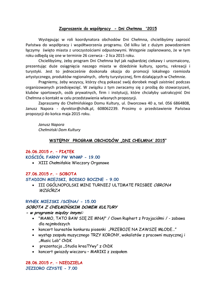 Zaproszenie do współpracy - Dni Chełmna '2015 Występując w roli koordynatora obchodów Dni Chełmna, chcielibyśmy zaprosić Państwa do współpracy i współtworzenia programu. Od kilku lat z dużym powodzeniem łączymy święto miasta z uroczystościami odpustowymi. Wstępnie zaplanowano, że w tym roku odbędą się one w terminie 26 czerwca - 2 lica 2015 roku. Chcielibyśmy, żeby program Dni Chełmna był jak najbardziej ciekawy i urozmaicony, prezentując duże osiągnięcia naszego miasta w dziedzinie kultury, sportu, rekreacji i turystyki. Jest to jednocześnie doskonała okazja do promocji lokalnego rzemiosła artystycznego, produktów regionalnych, oferty turystycznej, firm działających w Chełmnie. Pragniemy, żeby wszyscy, którzy chcą pokazać swój dorobek mogli zaistnieć podczas organizowanych przedsięwzięć. W związku z tym zwracamy się z prośbą do stowarzyszeń, klubów sportowych, osób prywatnych, firm i instytucji, które chciałyby uatrakcyjnić Dni Chełmna o kontakt w celu przedstawienia własnych propozycji. Zapraszamy do Chełmińskiego Domu Kultury, ul. Dworcowa 40 a, tel. 056 6864808, Janusz Napora - [email protected], 608062239. Prosimy o przedstawienie Państwa propozycji do końca maja 2015 roku. Janusz Napora Chełmiński Dom Kultury WSTĘPNY PROGRAM OBCHODÓW „DNI CHEŁMNA’ 2015” 26.06.2015 r. – PIĄTEK KOŚCIÓŁ FARNY PW WNMP - 19.00 XIII Chełmińskie Wieczory Organowe 27.06.2015 r. – SOBOTA STADION MIEJSKI, BOISKO BOCZNE - 9.00 III OGÓLNOPOLSKI MINI TURNIEJ ULTIMATE FRISBEE OBRONA WZGÓRZA RYNEK MIEJSKI /SCENA/ - 15.00 SOBOTA Z CHEŁMIŃSKIM DOMEM KULTURY - w programie między innymi: "MAMO, TATO BAW SIĘ ZE MNĄ!" / Clown Ruphert z Przyjaciółmi / - zabawa dla najmłodszych koncert laureatów konkursu piosenki „PRZEBOJE NA ZAWSZE MŁODE…” występ zespołu muzycznego TRZY KORONY, wokalistów z pracowni muzycznej i „Music Lab” ChDK prezentacja „Studia kreaTYwy” z ChDK koncert gwiazdy wieczoru – MARIKI z zespołem 28.06.2015 r. – NIEDZIELA JEZIORO CZYSTE - 7.00 OTWARTE ZAWODY SPŁAWIKOWE O PUCHAR DYREKTORA CHDK” /zapisy – Sklep Wędkarski „SUKCES”, ul. Dworcowa/ STADION MIEJSKI, BOISKO BOCZNE - 9.00 godz. 9.00 - III OGÓLNOPOLSKI MINI TURNIEJ ULTIMATE FRISBEE OBRONA WZGÓRZA EUROPEJSKIE CENTRUM WYMIANY MŁODZIEŻY – J. STAROGRODZKIE - od godz. 10.00 "I KRAJOWA WYSTAWA PSÓW RASOWYCH W CHEŁMNIE" podsumowanie konkursu fotograficznego dla dzieci „MÓJ PRZYJACIEL PIES W ZABAWNEJ SYTUACJI” / informacje szczegółowe - www.chdk.pl / „SPACERKI PO CHEŁMNIE” - 10.30 „Historia Sanktuarium Maryjnego w Chełmnie”- kościół podominikański, osada rycerska, Nowe Planty - Studzienka, Brama Grudziądzka, ul. Grudziądzka, Fara – Sanktuarium Maryjne (dla chętnych na wejście na wieżę – obowiązuje bilet). Przewodnik: Sławomir Grabowski /zbiórka przed Ratuszem/ MUZEUM ZIEMI CHEŁMIŃSKIEJ – 15.00 Otwarcie „VI wystawy prac plastycznych słuchaczy Uniwersytetu Trzeciego Wieku przy ChDK w Chełmnie” 29.06.2015 r. – PONIEDZIAŁEK Sala koncertowa Państwowej Szkoły Muzycznej w Chełmnie - godz. 18.00 Koncert pt. „YAGA W REPERTUARZE EDITH PIAF” w wykonaniu Teatru Piosenki Francuskiej z Krakowa. 30.06.2015 r. – WTOREK KINOTEATR „RONDO” - godz. 16.00 Koncert „Budzimy Sandrusię” 1.07.2015 r. – ŚRODA BRAMA GRUDZIĄDZKA - 12.00 Występ Zespołu Pieśni i Tańca „Pomorze” - Chełmiński Dom Kultury EUROPEJSKIE CENTRUM WYMIANY MŁODZIEŻY – J. STAROGRODZKIE -16.00 Warsztaty gitarowo – wokalne dla uczestników III Festiwalu Piosenki Religijnej i innych chętnych / informacje na stronie www.chdk.pl / 2.07.2015 r. – CZWARTEK Kościół p.w. św. Piotra i św. Pawła - ok. 12.00 III Festiwal Piosenki Religijnej „W Ramionach Matki” /informacje na www.chdk.pl/ gość specjalny festiwalu - zespół „PROKONCEPCJA” Uroczystości odpustowe ku czci Matki Bożej Bolesnej Chełmno, Anno Domini 2015 1 lipca (środa) 16.00 – Msza św. przy Studzience 18.00 – Uroczysta Msza św. pod przewodnictwem Ks. Biskupa Józefa Szamockiego i procesja Eucharystyczna do Studzienki 21.00 – Apel Jasnogórski 22.30 – Nabożeństwo różańcowe 24.00 – Msza św. 2 lipca (czwartek) 6.00 – Msza św. przy Studzience 7.00; 8.30; 16.00; 18.00 – Msze św. 11.00 – SUMA ODPUSTOWA pod przewodnictwem Ks. Biskupa Andrzeja Suskiego, po której rozpoczynają się przesłuchania festiwalowe