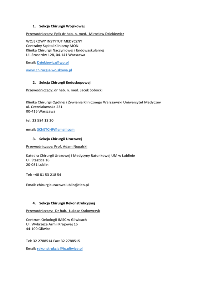 1. Sekcja Chirurgii Wojskowej Przewodniczący: Ppłk dr hab. n. med. Mirosław Dziekiewicz WOJSKOWY INSTYTUT MEDYCZNY Centralny Szpital Kliniczny MON Klinika Chirurgii Naczyniowej i Endowaskularnej Ul. Szaserów 128, 04-141 Warszawa Email: [email protected] www.chirurgia-wojskowa.pl 2. Sekcja Chirurgii Endoskopowej Przewodniczący: dr hab. n. med. Jacek Sobocki Klinika Chirurgii Ogólnej i Żywienia Klinicznego Warszawski Uniwersytet Medyczny ul. Czerniakowska 231 00-416 Warszawa tel. 22 584 13 20 email: [email protected] 3. Sekcja Chirurgii Urazowej Przewodniczący: Prof. Adam Nogalski Katedra Chirurgii Urazowej i Medycyny Ratunkowej UM w Lublinie Ul. Staszica 16 20-081 Lublin Tel: +48 81 53 218 54 Email: [email protected] 4. Sekcja Chirurgii Rekonstrukcyjnej Przewodniczący: Dr hab. Łukasz Krakowczyk Centrum Onkologii IMSC w Gliwicach Ul. Wybrzeże Armii Krajowej 15 44-100 Gliwice Tel: 32 2788514 Fax: 32 2788515 Email: [email protected] 5. Sekcja Chirurgii Endokrynologicznej Przewodniczący: Prof. Maciej Otto Katedra i Klinika Chirurgii Ogólnej, Naczyniowej i Transplantacyjnej WUM ul. Banacha 1a 02-097 Warszawa Tel. 22 599 24 67 email: [email protected] 6. Sekcja Żywienia Pozajelitowego i Dojelitowego Towarzystwa Chirurgów Polskich Przewodniczący: Dr Włodzimierz Cebulski Katedra i Klinika Chirurgii Ogólnej, Gastroenterologicznej i Onkologicznej WUM ul. Banacha 1a, 02-097 Warszawa, Tel: 22 5992257, fax 22 5992057 e-mail: [email protected] 7. Sekcja Videochirurgii Towarzystwa Chirurgów Polskich Przewodniczący: Prof. Marek Jackowski Sekcja Wideochirurgii TCHP Ul. Św. Józefa 53/59 87-100 Toruń Tel: 56 6101199 Fax: 56 6544054 [email protected] www.wideochirurgia.pl 8. Sekcja Chirurgii Metabolicznej i Bariatrycznej Przewodniczący: Prof. Maciej Michalik Katedra i Klinika Chirurgii Ogólnej i Małoinwazyjnej Uniwersytecki Szpital Kliniczny w Olsztynie ul. Warszawska 30, 10-082 Olsztyn Tel. 89 524 53 50 Fax 89 541 30 93 [email protected] 9. Sekcja Chirurgii Trzustki Przewodniczący: Prof. Paweł Lampe Katedra i Klinika Chirurgii Przewodu Pokarmowego ŚUM w Katowicach Ul. Medyków 14 40-752 Katowice tel. 32 789 42 51-53 e-mail: [email protected] www.kchpp.pl 10. Sekcja Przepuklin Przewodniczący: Dr. Rafał Solecki Specjalistyczne Centrum Diagnostyczno-Zabiegowe Medicina Ul. Barska 12 30-307 Kraków Tel: +48604475179 e-mail: [email protected] 11. Sekcja Oparzeń Przewodniczący: Prof. Krystyn Sosada Adres do korespondencji Wojewódzki Szpital Specjalistyczny nr 5 im. Św. Barbary 41-200 Sosnowiec pl. Medykow 1 sekr. 32 368 25 21 tel. kom. 502133 808 [email protected] 12. Sekcja Zakażeń Chirurgicznych Przewodnicząca: Prof. Jadwiga Snarska ZOZ MSW z W-MCO w Olsztynie Katedra i Klinika Chirurgii Ogólnej Ul. Wojska Polskiego 37 10-228 Olsztyn Email: [email protected] KOŁO MŁODYCH CHIRURGÓW TOWARZYSTWA CHIRURGÓW POLSKICH Przewodniczący: Oddział Kliniczny Chirurgii Ogólnej i Urazów Wielonarządowych Katedry Chirurgii Ogólnej i Urazów Wielonarządowych Wydziału Nauk o Zdrowiu Śląskiego Uniwersytetu Medycznego w Katowicach Wojewódzki Szpital Specjalistyczny nr 5 im. Św. Barbary w Sosnowcu Centrum Urazowe Plac Medyków 1 41-200 Sosnowiec [email protected] Grupa na Facebook: Koło Młodych Chirurgów Tel: 502228590