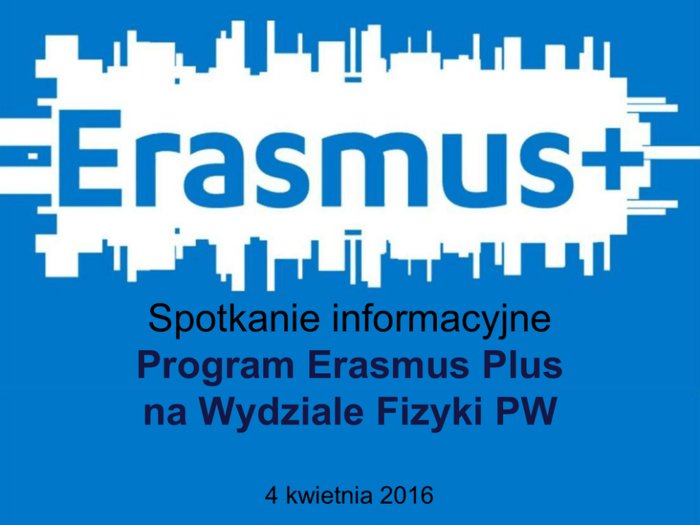 Spotkanie informacyjne Program Erasmus Plus na Wydziale Fizyki PW 4 kwietnia 2016 Co to jest Program Erasmus? Program Erasmus powstał w 1987 roku. Jego celem jest podnoszenie jakości kształcenia w krajach uczestniczących w tym programie poprzez rozwijanie międzynarodowej współpracy między uczelniami oraz wspieranie mobilności studentów i pracowników szkół wyższych. Kraje uczestniczące w programie Erasmus: a. 28 państw członkowskich UE b. Islandia, Liechtenstein, Norwegia c. Szwajcaria d. Turcja e. Była republika Jugosławii Macedonia (FYROM) Co to jest Program Erasmus? W programie Erasmus można ubiegać się o trzy rodzaje wyjazdów: • wyjazd na część studiów – do zagranicznej uczelni współpracującej z Twoją uczelnią macierzystą; • wyjazd na praktykę – do zagranicznego przedsiębiorstwa lub instytucji współpracującej z Twoją uczelnią – ewentualne zgłoszenia do końca kwietnia (praktyki studenckie w ramach Programu Erasmus musza trwać co najmniej 2 miesiące (a maksymalnie 3) i powinny sie zakończyć przed końcem roku akademickiego, tj. przed 31 sierpnia 2016 r.) •wyjazd na praktykę dla absolwentów - nowością w programie Erasmus+ jest możliwość wyjazdu absolwentów uczelni na zagraniczną praktykę lub staż. Wyjazd tego typu może się odbyć w ciągu jednego roku od ukończenia studiów, a jego długość jest wliczana do łącznego czasu trwania mobilności na tym poziomie studiów, na którym student został zakwalifikowany na wyjazd. Rekrutacja odbywa się na ostatnim roku studiów. Co powinniście wiedzieć zanim zdecydujecie się na wyjazd w ramach programu Erasmus Kto może wyjechać na stypendium? Ogólnie: Aby ubiegać się o wyjazd w ramach Erasmusa, należy: • być studentem uczelni, która posiada Kartę Uczelni Erasmusa i prowadzi wymianę studentów • być zarejestrowanym na studiach prowadzących do uzyskania stopnia/dyplomu (licencjata, inżyniera, magistra lub doktora) • mieć ukończony pierwszy rok studiów pierwszego stopnia (licencjackich, inżynierskich) • być obywatelem kraju uczestniczącego w Erasmusie (albo mieć status uchodźcy lub prawo stałego pobytu w kraju uczestniczącym) PW: • student chcący wyjechać nie może być urlopowany • wyjazd nie powinien kolidować z ukończeniem studiów w terminie przewidywanym w planie studiów Zgodę na wyjazd wydaje Dziekan po konsultacji z opiekunem naukowym studenta i/lub Koordynatorem Programu Kto może wyjechać na stypendium? Rekrutację studentów na wyjazdy przeprowadzają komisje wydziałowe pod przewodnictwem Dziekanów lub Pełnomocników Dziekanów z udziałem opiekunów podpisanych wcześniej umów o współpracy dwustronnej w ramach Programu LLP-Erasmus. Przy rekrutacji uwzględnia się następujące kryteria: • średnia ważona ocen z całego okresu studiów • znajomość języka danego kraju lub języka, w którym student będzie porozumiewał się na danej uczelni • opinia o studencie • zaangażowanie w opiekę nad studentami zza granicy w Politechnice Warszawskiej Procedurze rekrutacji ogólnej nie podlegają studenci lub doktoranci, którzy sami zainicjowali podpisanie umowy z uczelnią zagraniczną i uzyskali wstępną akceptację przyjęcia oraz zgodę Dziekana Wydziału. Kiedy i na jak długo można wyjechać? W ramach programu Erasmus+ studenci mogą się ubiegać o wyjazdy na studia i na praktyki w innych krajach uczestniczących w programie. Na każdym z trzech poziomów studiów można skorzystać z wyjazdu lub wyjazdów trwających łącznie do 12 miesięcy. Minimalny czas pobytu na studiach za granicą wynosi 3 miesiące, a na praktyce – 2 miesiące. Studentom jednolitych studiów magisterskich lub równoważnych (np. kierunków lekarskich) przysługuje możliwość skorzystania z wyjazdów, których łączny czas trwania wynosi do 24 miesięcy. Do całkowitej liczby miesięcy są jednak wliczane w ramach każdego poziomu studiów – wcześniejsze wyjazdy z programu Erasmus („Uczenie się przez całe życie”). Kiedy i na jak długo można wyjechać? Uczelnia powinna wysyłać swoich studentów na okres stanowiący pewną zamkniętą część programu studiów, którą łatwo jest zaliczyć, np. jeden semestr. Możliwe są wyjazdy na okres od 3 miesięcy do jednego roku akademickiego. (w przypadku praktyk od 2 do 3 miesięcy) Pobyt za granicą w ramach Erasmusa nie może wykroczyć poza jeden – ten sam – rok akademicki - tzn. stypendium, które rozpoczęło się w semestrze letnim jednego roku akademickiego nie może być kontynuowane w semestrze zimowym następnego roku. Dokładny termin rozpoczęcia studiów w partnerskiej uczelni zagranicznej zależy przede wszystkim od tego, kiedy rozpoczynają się tam zajęcia w semestrze zimowym i letnim, a także od indywidualnych ustaleń między studentem, uczelnią wysyłającą i przyjmującą. Gdzie można wyjechać? Program Erasmus dofinansowuje wyjazdy na Uczelnie Europejskie, które posiadają własną Kartę Erasmusa. Baza danych wszystkich uczelni w Europie, które posiadają Kartę Erasmusa znajduje się na stronie: http://eacea.cec.eu.int/static/en/llp/erasmus/index_en.html Można planować wyjazd na część studiów do zagranicznej uczelni, która zawarła z Twoją macierzystą uczelnią (wydziałem) porozumienie o współpracy. Gdzie można wyjechać? Lista uczelni, z którymi Wydział Fizyki ma aktualne umowy: 1. 2. 3. 4. 5. 6. 7. 8. 9. 10. 11. 12. 13. 14. 15. Vrije Universiteit Brussel (Bruksela, Belgia) Czech Technical University in Prague (Czechy) Technische Unlversitat Darmstadt (Niemcy) Ecole Nationale Superieure des Mines de Nantes (Francja) Université Pierre et Marie Curie (Francja) MINES ParisTech - Ecole Nationale Superleure des mines de Paris (Francja) Université de Maine (Le Mans, Francja) Universita'Degli Studi Di Firenze (Florencja, Włochy) Vilniaus Universitetas (Wilno, Litwa) Stockholm University (Szwecja) University of Jyväskylä