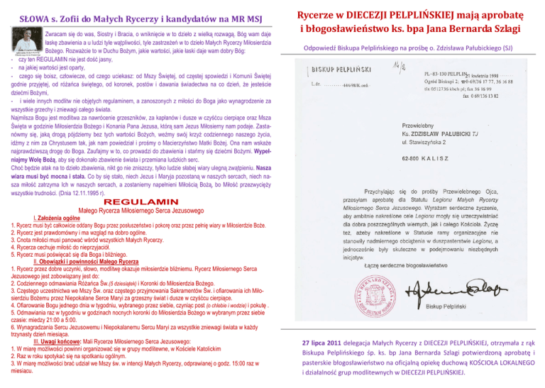 SŁOWA s. Zofii do Małych Rycerzy i kandydatów na MR MSJ Zwracam się do was, Siostry i Bracia, o wniknięcie w to dzieło z wielką rozwagą. Bóg wam daje łaskę zbawienia a u ludzi tyle wątpliwości, tyle zastrzeżeń w to dzieło Małych Rycerzy Miłosierdzia Bożego. Rozważcie to w Duchu Bożym, jakie wartości, jakie łaski daje wam dobry Bóg: - czy ten REGULAMIN nie jest dość jasny, - na jakiej wartości jest oparty, - czego się boisz, człowiecze, od czego uciekasz: od Mszy Świętej, od częstej spowiedzi i Komunii Świętej godnie przyjętej, od różańca świętego, od koronek, postów i dawania świadectwa na co dzień, że jesteście dziećmi Bożymi, - i wiele innych modlitw nie objętych regulaminem, a zanoszonych z miłości do Boga jako wynagrodzenie za wszystkie grzechy i zniewagi całego świata. Najmilsza Bogu jest modlitwa za nawrócenie grzeszników, za kapłanów i dusze w czyśćcu cierpiące oraz Msza Święta w godzinie Miłosierdzia Bożego i Konania Pana Jezusa, którą sam Jezus Miłosierny nam podaje. Zastanówmy się, jaką drogą pójdziemy bez tych wartości Bożych, weźmy swój krzyż codziennego naszego życia, idźmy z nim za Chrystusem tak, jak nam powiedział i prośmy o Macierzyństwo Matki Bożej. Ona nam wskaże najprawdziwszą drogę do Boga. Zaufajmy w to, co prowadzi do zbawienia i stańmy się dziećmi Bożymi. Wypełniajmy Wolę Bożą, aby się dokonało zbawienie świata i przemiana ludzkich serc. Choć będzie atak na to dzieło zbawienia, nikt go nie zniszczy, tylko ludzie słabej wiary ulegną zwątpieniu. Nasza wiara musi być mocna i stała. Co by się stało, niech Jezus i Maryja pozostaną w naszych sercach, niech nasza miłość zatrzyma Ich w naszych sercach, a zostaniemy napełnieni Miłością Bożą, bo Miłość przezwycięży wszystkie trudności. (Dnia 12.11.1995 r). Rycerze w DIECEZJI PELPLIŃSKIEJ mają aprobatę i błogosławieństwo ks. bpa Jana Bernarda Szlagi Odpowiedź Biskupa Pelplińskiego na prośbę o. Zdzisława Pałubickiego (SJ) REGULAMIN Małego Rycerza Miłosiernego Serca Jezusowego I. Założenia ogólne 1. Rycerz musi być całkowicie oddany Bogu przez posłuszeństwo i pokorę oraz przez pełnię wiary w Miłosierdzie Boże. 2. Rycerz jest prawdomówny i ma wzgląd na dobro ogólne. 3. Cnota miłości musi panować wśród wszystkich Małych Rycerzy. 4. Rycerza cechuje miłość do nieprzyjaciół. 5. Rycerz musi poświęcać się dla Boga i bliźniego. II. Obowiązki i powinności Małego Rycerza 1. Rycerz przez dobre uczynki, słowo, modlitwę okazuje miłosierdzie bliźniemu. Rycerz Miłosiernego Serca Jezusowego jest zobowiązany jest do: 2. Codziennego odmawiania Różańca Św.(5 dziesiątek) i Koronki do Miłosierdzia Bożego. 3. Częstego uczestnictwa we Mszy Św. oraz częstego przyjmowania Sakramentów Św. i ofiarowania ich Miłosierdziu Bożemu przez Niepokalane Serce Maryi za grzeszny świat i dusze w czyśćcu cierpiące. 4. Ofiarowanie Bogu jednego dnia w tygodniu, wybranego przez siebie, czyniąc post (o chlebie i wodzie) i pokutę . 5. Odmawiania raz w tygodniu w godzinach nocnych koronki do Miłosierdzia Bożego w wybranym przez siebie czasie: miedzy 21:00 a 5:00. 6. Wynagradzania Sercu Jezusowemu i Niepokalanemu Sercu Maryi za wszystkie zniewagi świata w każdy trzynasty dzień miesiąca. III. Uwagi końcowe: Mali Rycerze Miłosiernego Serca Jezusowego: 1. W miarę możliwości powinni organizować się w grupy modlitewne, w Kościele Katolickim 2. Raz w roku spotykać się na spotkaniu ogólnym. 3. W miarę możliwości brać udział we Mszy św. w intencji Małych Rycerzy, odprawianej o godz. 15:00 raz w miesiącu. 27 lipca 2011 delegacja Małych Rycerzy z DIECEZJI PELPLIŃSKIEJ, otrzymała z rąk Biskupa Pelplińskiego śp. ks. bp Jana Bernarda Szlagi potwierdzoną aprobatę i pasterskie błogosławieństwo na oficjalną opiekę duchową KOŚCIOŁA LOKALNEGO i działalność grup modlitewnych w DIECEZJI PELPLIŃSKIEJ. MODLITWA ZANURZENIA WE KRWI CHRYSTUSA NA ROZPOCZYNAJACY SIĘ DZIEŃ JJaa wwaass wwyybbrraałłeem m ii wwaass ppoowwoołłaałłeem m,, ppoottrrzzeebbuujjęę wwaass ii wwzzyywwaam m Jezu, zanurzam w Twojej Przenajdroższej Krwi cały ten rozpoczynający się dzień, który jest darem Twojej nieskończonej miłości. Zanurzam w Twojej Krwi siebie samą. Wszystkie osoby, które dziś spotkam, o których pomyślę czy w jakikolwiek sposób czegokolwiek o nich się dowiem. Zanurzam moich bliskich i osoby powierzające się mojej modlitwie. Przez Najświętszy Sakrament Zanurzam w Twojej Krwi, Panie, wszystkie sytuacje, które dziś zaistnieją, wszystkie sprawy, które będę załatwiać, rozmowy, które będę prowadzić, prace, które będę wykonywać i mój odpoczynek. www.malirycerze.koszalin.opoka.org.pl Zapraszam Cię, Jezu, do tych sytuacji, spraw, rozmów, prac i odpoczynku. Czasopismo do użytku wewnętrznego Proszę, aby Twoja Krew przenikała te osoby i sprawy, przynosząc według Twojej woli uwolnienie, oczyszczenie, uzdrowienie i uświęcenie. Niech dziś zajaśnieje chwała Twojej Krwi i objawi się jej moc. Przyjmuję wszystko, co mi dziś ześlesz, ku chwale Twojej Krwi, ku pożytkowi Kościoła św. i jako zadośćuczynienie za moje grzechy, składając to wszystko Bogu Ojcu przez wstawiennictwo Maryi. Legionu Małych Rycerzy Miłosiernego Serca Jezusowego Polska będzie uratowana papież Pius IX Oddaję siebie samą do pełnej dyspozycji Maryi, zawierzając Jej moją przeszłość, przyszłość i teraźniejszość, bez warunków i bez zastrzeżeń. Amen. KRÓTKA LITANIA – WEZWANIA DO KRWI CHRYSTUSA – Krwi Chrystusa, tryskająca przy biczowaniu, ofiarowana Ojcu Niebieskiemu za grzechy nieczyste, zablokuj kanały tych grzechów w naszym domu. – Krwi Chrystusa, brocząca spod cierniowej korony, ofiarowana Ojcu Niebieskiemu za grzechy pychy i detronizacji Boga, zablokuj kanały tego zła w naszej rodzinie. – Krwi Chrystusa, przelana na krz