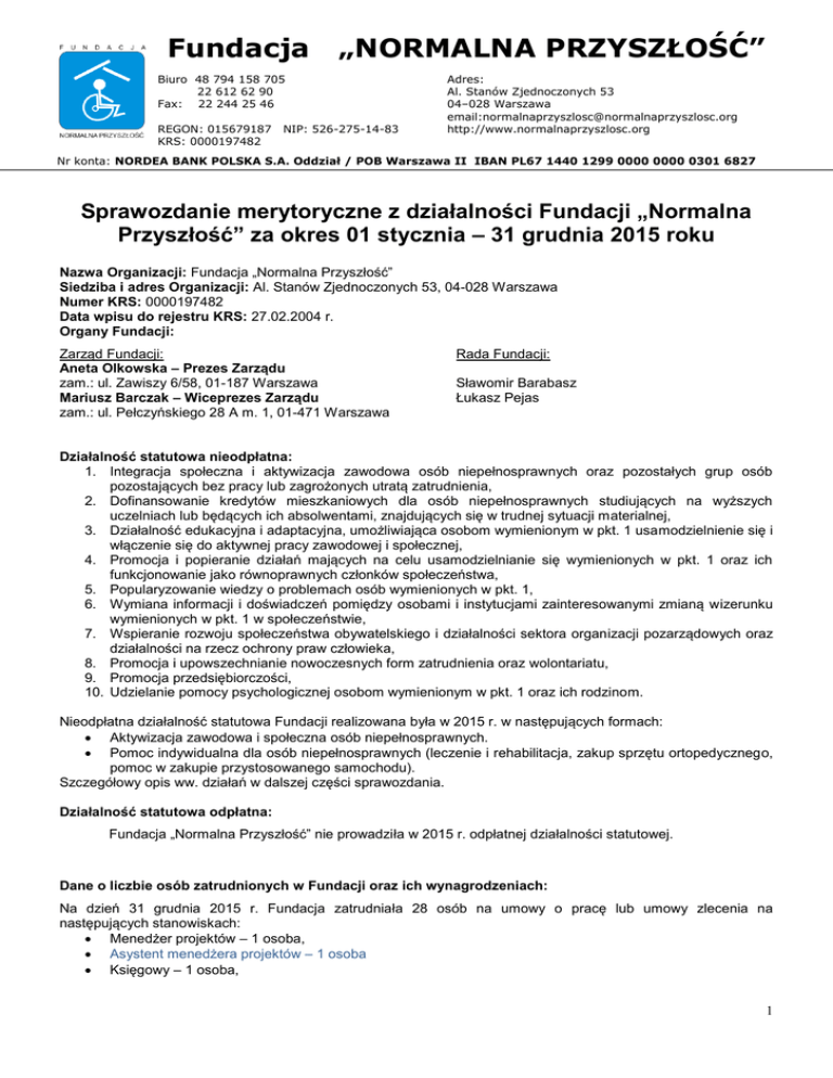 Fundacja „NORMALNA PRZYSZŁOŚĆ” Biuro 48 794 158 705 22 612 62 90 Fax: 22 244 25 46 REGON: 015679187 KRS: 0000197482 NIP: 526-275-14-83 Adres: Al. Stanów Zjednoczonych 53 04–028 Warszawa email:[email protected] http://www.normalnaprzyszlosc.org Nr konta: NORDEA BANK POLSKA S.A. Oddział / POB Warszawa II IBAN PL67 1440 1299 0000 0000 0301 6827 KRS Sprawozdanie merytoryczne z działalności Fundacji „Normalna Przyszłość” za okres 01 stycznia – 31 grudnia 2015 roku Nr konta: NORDEA BANK POLSKA S.A. Oddział / POB Warszawa II IBAN PL67 1440 1299 0000 0000 0301 6827 Nazwa Organizacji: Fundacja „Normalna Przyszłość” Siedziba i adres Organizacji: Al. Stanów Zjednoczonych 53, 04-028 Warszawa Numer KRS: 0000197482 Data wpisu do rejestru KRS: 27.02.2004 r. Organy Fundacji: Zarząd Fundacji: Aneta Olkowska – Prezes Zarządu zam.: ul. Zawiszy 6/58, 01-187 Warszawa Mariusz Barczak – Wiceprezes Zarządu zam.: ul. Pełczyńskiego 28 A m. 1, 01-471 Warszawa Rada Fundacji: Sławomir Barabasz Łukasz Pejas Działalność statutowa nieodpłatna: 1. Integracja społeczna i aktywizacja zawodowa osób niepełnosprawnych oraz pozostałych grup osób pozostających bez pracy lub zagrożonych utratą zatrudnienia, 2. Dofinansowanie kredytów mieszkaniowych dla osób niepełnosprawnych studiujących na wyższych uczelniach lub będących ich absolwentami, znajdujących się w trudnej sytuacji materialnej, 3. Działalność edukacyjna i adaptacyjna, umożliwiająca osobom wymienionym w pkt. 1 usamodzielnienie się i włączenie się do aktywnej pracy zawodowej i społecznej, 4. Promocja i popieranie działań mających na celu usamodzielnianie się wymienionych w pkt. 1 oraz ich funkcjonowanie jako równoprawnych członków społeczeństwa, 5. Popularyzowanie wiedzy o problemach osób wymienionych w pkt. 1, 6. Wymiana informacji i doświadczeń pomiędzy osobami i instytucjami zainteresowanymi zmianą wizerunku wymienionych w pkt. 1 w społeczeństwie, 7. Wspieranie rozwoju społeczeństwa obywatelskiego i działalności sektora organizacji pozarządowych oraz działalności na rzecz ochrony praw człowieka, 8. Promocja i upowszechnianie nowoczesnych form zatrudnienia oraz wolontariatu, 9. Promocja przedsiębiorczości, 10. Udzielanie pomocy psychologicznej osobom wymienionym w pkt. 1 oraz ich rodzinom. Nieodpłatna działalność statutowa Fundacji realizowana była w 2015 r. w następujących formach: Aktywizacja zawodowa i społeczna osób niepełnosprawnych. Pomoc indywidualna dla osób niepełnosprawnych (leczenie i rehabilitacja, zakup sprzętu ortopedycznego, pomoc w zakupie przystosowanego samochodu). Szczegółowy opis ww. działań w dalszej części sprawozdania. Działalność statutowa odpłatna: Fundacja „Normalna Przyszłość” nie prowadziła w 2015 r. odpłatnej działalności statutowej. Dane o liczbie osób zatrudnionych w Fundacji oraz ich wynagrodzeniach: Na dzień 31 grudnia 2015 r. Fundacja zatrudniała 28 osób na umowy o pracę lub umowy zlecenia na następujących stanowiskach: Menedżer projektów – 1 osoba, Asystent menedżera projektów – 1 osoba Księgowy – 1 osoba, 1 Fundacja „NORMALNA PRZYSZŁOŚĆ” Biuro 48 794 158 705 22 612 62 90 Fax: 22 244 25 46 REGON: 015679187 KRS: 0000197482 NIP: 526-275-14-83 Adres: Al. Stanów Zjednoczonych 53 04–028 Warszawa email:[email protected] http://www.normalnaprzyszlosc.org Nr konta: NORDEA BANK POLSKA S.A. Oddział / POB Warszawa II IBAN PL67 1440 1299 0000 0000 0301 6827 KRSdo spraw aktywizacji zawodowej osób niepełnosprawnych – 1 osoba, Specjalista Pośrednik pracy – 4 osoby, Doradca zawodowy – 4 osoby Doradca życiowy – 4 osoby Psycholog – 8 osób Specjaliści ds. rekrutacji beneficjentów – 4 osoby Informatyk – 1 osoba Nr konta: NORDEA BANK POLSKA S.A. Oddział / POB Warszawa II IBAN PL67 1440 1299 0000 0000 0301 6827 Łączna kwota wypłaconych wynagrodzeń z tytułu umów o pracę, umów zlecenia oraz o dzieło wyniosła w 2015 r. 904.981,99 złotych. Członkowie Zarządu i Rady Fundacji nie otrzymywali w 2015 r. wynagrodzenia z tytułu pełnionych funkcji. Informacja o wysokości otrzymanych przychodów z działalności statutowej z wyodrębnieniem ich źródeł: Darowizny pieniężne osób prywatnych 71.025,94 zł Wpłaty 1 % podatku na rzecz organizacji pożytku publicznego 22.924,32 zł Darowizny osób prawnych 3.500,00 zł Dotacje ze środków publicznych (Program Operacyjny Kapitał Ludzki, PFRON) 1.190.461,39 zł Fundacja „Normalna Przyszłość” nie realizowała w 2015 r. odpłatnych świadczeń w ramach działalności statutowej. Informacje o działalności zleconej fundacji przez podmioty państwowe i samorządowe (usługi, państwowe zadania zlecone i zamówienia publiczne) oraz o wyniku finansowym tej działalności. Fundacja realizowała następujące zadania zlecone przez podmioty państwowe i samorządowe: Projekt Wysokie kwalifikacje szansą na dobry start III. Projekt współfinansowany ze środków Państwowego Funduszu Rehabilitacji Osób Niepełnosprawnych w ramach 13 konkursu o zlecenie realizacji zadań w ramach art. 36 ustawy z dnia 27 sierpnia 1997 r. o rehabilitacji zawodowej i społecznej oraz zatrudnianiu osób niepełnosprawnych (umowa nr ZZB/000272/BF/D). Kwota dotacji z PFRON wykorzystana w 2015 r.: 572 231,77 zł. Projekt jest kontynuowany w 2016 r. Projekt Poradnia życiowa dla osób z niepełnosprawnościami. Projekt współfinansowany ze środków Państwowego Funduszu Rehabilitacji Osób Niepełnosprawnych w ramach 13 konkursu o zlecenie realizacji zadań w ramach art. 36 ustawy z dnia 27 sierpnia 1997 r. o rehabilitacji zawodowej i społecznej oraz zatrudnianiu osób niepełnosprawnych (umowa nr ZZB/000267/BF/D). Kwota dotacji z PFRON wykorzystana w 2015 r.: 618 229,62 zł. Projekt jest kontynuowany w 2016 r. Fundacja nie realizowała w 2015 r. usług dla podmiotów państwowych i samorządowych w trybie zamówień publicznych. Pozostałe 
