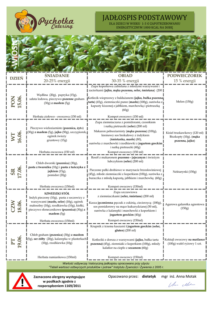 JADŁOSPIS PODSTAWOWY WIOSN DLA DZIECI W WIEKU 1-3 O ZAPOTRZEBOWANIU ENERGETYCZNYM 1000 KCAL NA DOBĘ PON 15.06. DZIEŃ ŚNIADANIE 20-25% energii OBIAD 30-35 % energii Wędlina (20g), papryka (15g), sałata lodowa, pieczywo pszenne graham (30g) z masłem (5g) Zupa koperkowa zabielana z młodymi warzywami i zacierkami (jajko, mąka pszenna, seler, śmietana) (200 ml) Kotlecik wieprzowy z bakłażanem (jajko, bułka pszenna tarta) (45g), ziemniaczki puree (masło) (100g), surówka z kapusty kiszonej z jabłkiem, marchewką i pietruszką (60g) WT 16.06. Herbata ziołowo - owocowa (150 ml) Pieczywo wieloziarniste (pszenica, żyto) (30g) z masłem (5g), jajko (50g), szczypiorek, ogórek świeży gruntowy (15g) CZW 18.06. ŚR 17.06. Herbata owocowa (150 ml) Chleb dworski (pszenica) (30g), pasta z twarożku (10g) i pasta z tuńczyka z jajkiem (15g), pomidor (20g) PODWIECZOREK 15 % energii Melon (150g) Kompot owocowy (150 ml) Zupa ziemniaczana z pomidorami, czosnkiem i natką pietruszki (seler) (200 ml) Makaron pełnoziarnisty (mąka pszenna) (100g), kremowy sos brokułowy z indykiem (śmietanka, masło) (80), surówka z marchewki i rzodkiewki z jogurtem greckim i natką pietruszki (40g) Kisiel truskawkowy (120 ml) Biszkopty (10g). (mąka pszenna, jajko) Kompot owocowy (150 ml) Rosół z makaronem pszenno - jajecznym i świeżym lubczykiem (seler) (200 ml) Pieczone pałki drobiowe w marynacie brzoskwiniowej (45g), młode ziemniaczki z koperkiem (100g), surówka z buraczka z młodą kapustą, jabłkiem i marchewką (60g) Herbata owocowa (150ml) Kompot owocowy (150ml) SZWEDZKI STÓŁ Indyk pieczony (10g), pasta z soczewicy z warzywami (masło, seler) (10g), ogórek małosolny (10g), rzodkiewka (10g), kiełki, pieczywo słonecznikowe (pszenica) (30g) z masłem (5g) Zupa szczawiowa z ziemniaczkami (seler, śmietana) (200 ml) Kasza jęczmienna pęczak z cukinią, ciecierzycą (180g), sos pomidorowy na mące kukurydzianej (50 ml), surówka z kalarepki i marchewki z koperkiem i jogurtem greckim (40g) Herbata owocowa (150ml) Kompot owocowy (150ml) Nektarynki (150g) Agarowa galaretka agrestowa (150g) PT 19.06. Krupnik z trzema kaszami i jogurtem greckim (seler, gluten) (200 ml) Chleb graham (pszenica) (30g) z masłem (5g), ser żółty (20g), kalarepka w plasterkach (10g), rzodkiewka (10g) Herbata rumiankowa (150ml) Koktajl owocowy na maślance (100g) wafel ryżowy 1 szt. Kotleciki z dorsza z warzywami (jajko, bułka tarta pszenna) (45g), ziemniaki z koperkiem (100g), młody kalafior na ciepło z sezamem (60g) Kompot owocowy (150ml) Wartość odżywczą i kaloryczną jadłospisu opracowano przy użyciu "Tabeli wartosci odżwyczych produktów i potraw" Instytutu Żywności i Żywienia z 2005 r. Zaznaczono alergeny występujące w posiłkach zgodnie z rozporządzeniem 1169/2011 Opacowano przez: dietetyk mgr inż. Anna Motak JADŁOSPIS PODSTAWOWY WIOSN DLA DZIECI W WIEKU 1-3 O ZAPOTRZEBOWANIU ENERGETYCZNYM 1000 KCAL NA DOBĘ DZIEŃ ŚNIADANIE 20-25% energii OBIAD 30-35 % energii PODWIECZOREK 15 % energii WT 23.06. PON 22.06. Kapuśniak z młodej kapusty z ziemniaczkami (seler) (200 ml) Chleb orkiszowy (30g) z masłem (5g) ser żółty (20g) papryka (10g), ogórek zielony (10g) Gulasz drobiowy (mąka pszenna) (80g), kasza jaglana (100g) surówka z ogórka małosolnego z papryki i kukurydzy (60g) Arbuz (150g) Herbata ziołowa (150 ml) Kompot mieszany (150 ml) Pieczywo żytnie (30g) z masłem ekstra (5g), sałatka z jajka z warzywami (jajko, jogurt) (50g), pomidor (10g) szczypiorek Zupa ogórkowa zabielana z dodatkiem świeżych ogórków z ryżem i koperkiem (seler, jogurt grecki) (200 ml) Filet z indyka w panierce z otrębami pszennymi (jajko, buła tarta pszenna) (45g), młode ziemniaki z koperkiem (100g), świeża fasolka szparagowa na parze z sezamem (60g) Herbata owocowa (150 ml) Kompot owocowy (150ml) ŚR 24.06. Botwinka z ziemniakami zabielana (seler, śmietana) (200 ml) Wędlina (20g), kiełki, rzodkiewka (15g), bułka pszenna (30g) z masłem (5g) PT 26.06. CZW 25.06. Herbata owocowa (150ml) Paluch drożdżowy z makiem (mąka pszenna) (pół) Dziecięce guacamole (dip z awokado z gotowanym kalafiorem i sokiem z cytryny) (30g) Ryż zapiekany z jabłkami i cynamonem (180g) polewa jogurtowo - truskawkowa (50g), surówka z marchwi, brzoskwiń i żurawiny (40g) Kompot owocowy (150ml) Zupa pomidorowa zabielana (seler, jogurt grecki) z Pasztet mięsny z marchewką makaronem (mąka pszenna) (200 ml) i brokułem (jajko, mąka pszenna) (20g), Kotleciki wieprzowo - wołowe ogórek kiszony (15g), ziarna do posypania, z kalarepką (jajko, bułka tarta pszenna) (45g) kasza kus pieczywo graham (pszenica) (30g) z masłem kus (100g) (5g) mizeria z ogórków gruntowych z jogurtem greckim (60g) Kompot owocowy (150ml) Herbata owocowa (150ml) Płatki jęczmienne na mleku z miodem (150 ml) Pieczywo pszenne (30g) z masłem (5g), pasta z trzech serów (30g), pomidor (20g), szczypiorek Herbata owocowa (150ml) Serek twarogowy z owocami (150 g) Truskawki (150g) Zupa z młodych jarzyn z kaszą jaglaną i koperkiem (seler) (200 ml) Kotleciki z rybno - marchewkowy z sezamem (jajko, mąka pszenna) (45g), szpinak na gęsto (śmietana, duszony czosnek, masło, mąka pszenna) (60g), ziemniaki puree (masło) (100g) Mus bananowo - owocowy (150g) Kompot mieszany (`50 ml) Wartość odżywczą i kaloryczną jadłospisu opracowano przy użyciu "Tabeli wartosci odżwyczych produktów i potraw" Instytutu Żywności i Żywienia z 2005 r. Zaznaczono alergeny występujące w posiłkach zgodnie z rozporządzeniem 1169/2011 Opacowano przez: dietetyk mgr inż. Anna Motak