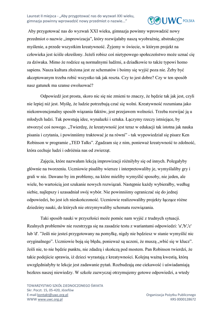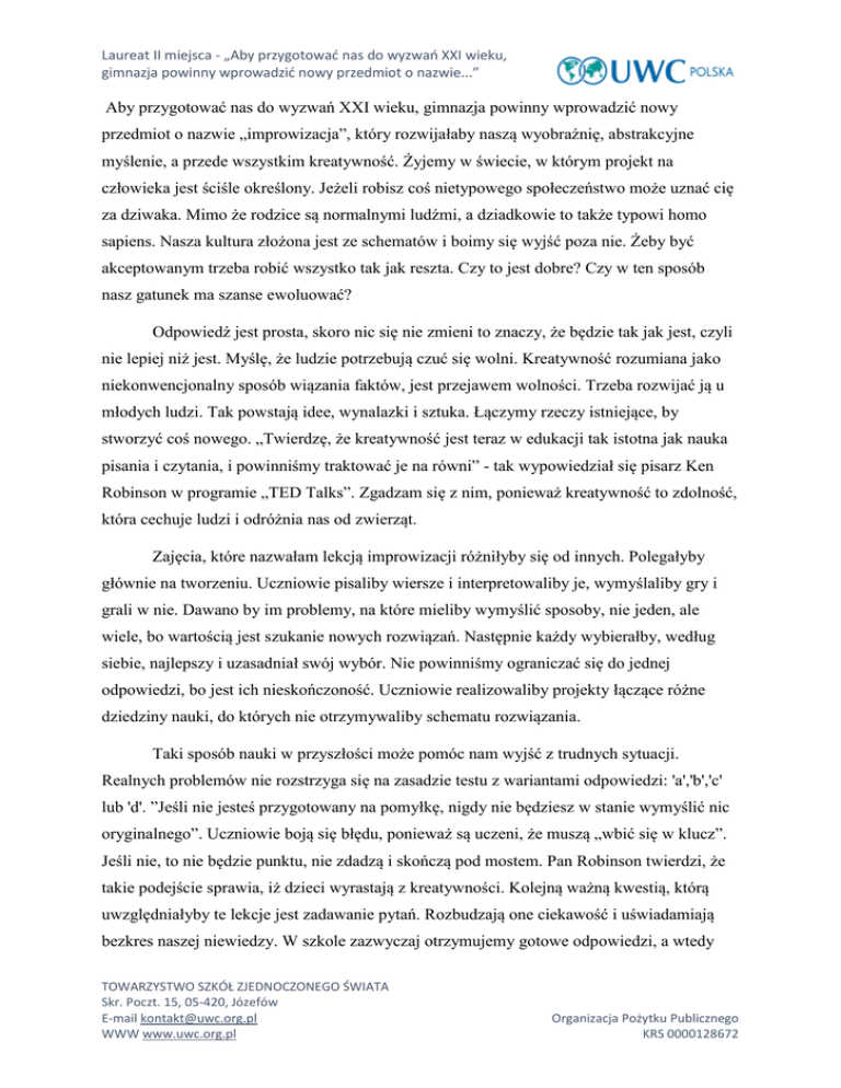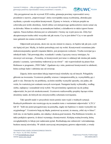 Laureat II miejsca - „Aby przygotować nas do wyzwań XXI wieku, gimnazja powinny wprowadzić nowy przedmiot o nazwie...” Aby przygotować nas do wyzwań XXI wieku, gimnazja powinny wprowadzić nowy przedmiot o nazwie „improwizacja”, który rozwijałaby naszą wyobraźnię, abstrakcyjne myślenie, a przede wszystkim kreatywność. Żyjemy w świecie, w którym projekt na człowieka jest ściśle określony. Jeżeli robisz coś nietypowego społeczeństwo może uznać cię za dziwaka. Mimo że rodzice są normalnymi ludźmi, a dziadkowie to także typowi homo sapiens. Nasza kultura złożona jest ze schematów i boimy się wyjść poza nie. Żeby być akceptowanym trzeba robić wszystko tak jak reszta. Czy to jest dobre? Czy w ten sposób nasz gatunek ma szanse ewoluować? Odpowiedź jest prosta, skoro nic się nie zmieni to znaczy, że będzie tak jak jest, czyli nie lepiej niż jest. Myślę, że ludzie potrzebują czuć się wolni. Kreatywność rozumiana jako niekonwencjonalny sposób wiązania faktów, jest przejawem wolności. Trzeba rozwijać ją u młodych ludzi. Tak powstają idee, wynalazki i sztuka. Łączymy rzeczy istniejące, by stworzyć coś nowego. „Twierdzę, że kreatywność jest teraz w edukacji tak istotna jak nauka pisania i czytania, i powinniśmy traktować je na równi” - tak wypowiedział się pisarz Ken Robinson w programie „TED Talks”. Zgadzam się z nim, ponieważ kreatywność to zdolność, która cechuje ludzi i odróżnia nas od zwierząt. Zajęcia, które nazwałam lekcją improwizacji różniłyby się od innych. Polegałyby głównie na tworzeniu. Uczniowie pisaliby wiersze i interpretowaliby je, wymyślaliby gry i grali w nie. Dawano by im problemy, na które mieliby wymyślić sposoby, nie jeden, ale wiele, bo wartością jest szukanie nowych rozwiązań. Następnie każdy wybierałby, według siebie, najlepszy i uzasadniał swój wybór. Nie powinniśmy ograniczać się do jednej odpowiedzi, bo jest ich nieskończoność. Uczniowie realizowaliby projekty łączące różne dziedziny nauki, do których nie otrzymywaliby schematu rozwiązania. Taki sposób nauki w przyszłości może pomóc nam wyjść z trudnych sytuacji. Realnych problemów nie rozstrzyga się na zasadzie testu z wariantami odpowiedzi: 'a','b','c' lub 'd'. ”Jeśli nie jesteś przygotowany na pomyłkę, nigdy nie będziesz w stanie wymyślić nic oryginalnego”. Uczniowie boją się błędu, ponieważ są uczeni, że muszą „wbić się w klucz”. Jeśli nie, to nie będzie punktu, nie zdadzą i skończą pod mostem. Pan Robinson twierdzi, że takie podejście sprawia, iż dzieci wyrastają z kreatywności. Kolejną ważną kwestią, którą uwzględniałyby te lekcje jest zadawanie pytań. Rozbudzają one ciekawość i uświadamiają bezkres naszej niewiedzy. W szkole zazwyczaj otrzymujemy gotowe odpowiedzi, a wtedy TOWARZYSTWO SZKÓŁ ZJEDNOCZONEGO ŚWIATA Skr. Poczt. 15, 05-420, Józefów E-mail [email protected] WWW www.uwc.org.pl Organizacja Pożytku Publicznego KRS 0000128672 Laureat II miejsca - „Aby przygotować nas do wyzwań XXI wieku, gimnazja powinny wprowadzić nowy przedmiot o nazwie...” nie są już dla nas tak interesujące. Robinson doszedł do wniosku, że dzisiejszy system nauczania powstał ze względu na wymagania industrializmu, dlatego narodziła się hierarchia przedmiotów, w której matematyka i języki są na samej górze, niżej przedmioty humanistyczne, a na końcu artystyczne. Jednakże w XXI w. inne rzeczy są ważne. Czynności powtarzalne i niewymagające myślenia wykonują za ludzi maszyny. My natomiast powinniśmy się zająć naszym rozwojem i poprawianiem jakości życia. Ludzie chcą być szczęśliwi, zdrowi i wolni. Pragną być sobą i mieć własne zdanie. Mam nadzieję, że kiedy lekcje improwizacji wprowadzone zostaną do gimnazjum uczniowie przestaną się bać być oryginalnym. TOWARZYSTWO SZKÓŁ ZJEDNOCZONEGO ŚWIATA Skr. Poczt. 15, 05-420, Józefów E-mail [email protected] WWW www.uwc.org.pl Organizacja Pożytku Publicznego KRS 0000128672