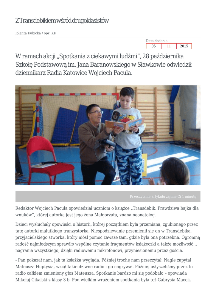 ZTransdebikiemwśróddrugoklasistów Jolanta Kubicka / opr. KK Data dodania: 05 11 2015 W ramach akcji „Spotkania z ciekawymi ludźmi”, 28 października Szkołę Podstawową im. Jana Baranowskiego w Sławkowie odwiedził dziennikarz Radia Katowice Wojciech Pacula. Przeczytanie artykułu zajmie Ci 1 minutę Redaktor Wojciech Pacula opowiedział uczniom o książce „Transdebik. Prawdziwa bajka dla wnuków”, której autorką jest jego żona Małgorzata, znana neonatolog. Dzieci wysłuchały opowieści o historii, której początkiem była przemiana, zgubionego przez tatę autorki malutkiego tranzystorka. Niespodziewanie przemienił się on w Transdebika, przyjacielskiego stworka, który niósł pomoc zawsze tam, gdzie była ona potrzebna. Ogromną radość najmłodszym sprawiło wspólne czytanie fragmentów książeczki a także możliwość… nagrania wszystkiego, dzięki radiowemu mikrofonowi, przyniesionemu przez gościa. - Pan pokazał nam, jak ta książka wygląda. Później trochę nam przeczytał. Nagle zapytał Mateusza Huptysia, wziął takie dziwne radio i go nagrywał. Później usłyszeliśmy przez to radio całkiem zmieniony głos Mateusza. Spotkanie bardzo mi się podobało – opowiada Mikołaj Cikalski z klasy 3 b. Pod wielkim wrażeniem spotkania była też Gabrysia Macek. – Pan Wojciech Pacula z naszą pomocą przeczytał fragment książki o samolubnym chłopcu, który zmienił się i odzyskał przyjaciół. Zrozumiał, że trzeba dzielić się z innymi – stwierdza z przekonaniem Gabrysia. Na zakończenie gość spotkania obdarowany został bukietem kwiatów i wykonanymi przez uczniów klas drugich i klasy 3 b ilustracjami do książki i portretami współczesnych Krasnali-Transdebików. Wśród nich znalazły się między innymi trójwymiarowe prace autorstwa Bartosza Sztylera i Natalii Koszyk z klasy 2 d. Spotkanie dostarczyło uczniom wielu, niezapomnianych wrażeń. Niektórych nawet zainspirowało do… sięgnięcia po pióro. – Książka bardzo mi się podobała. Chciałabym w przyszłości sama napisać książkę tak ciekawą, jak ta Pani Małgorzaty – przekonuje Karolina Lewandowska z klasy 3 b. D R U KUJ D RUKUJ DO PDF http://www.slawkow.pl/print.php?pdf=true&unique=z-transdebikiem-wsrod-drugoklasistow