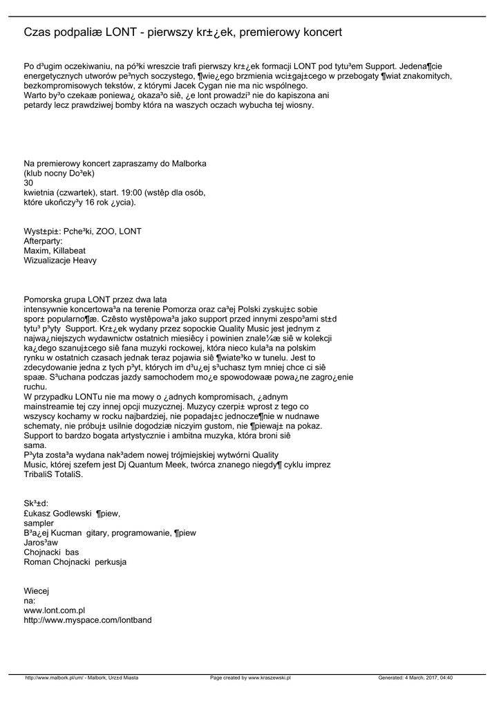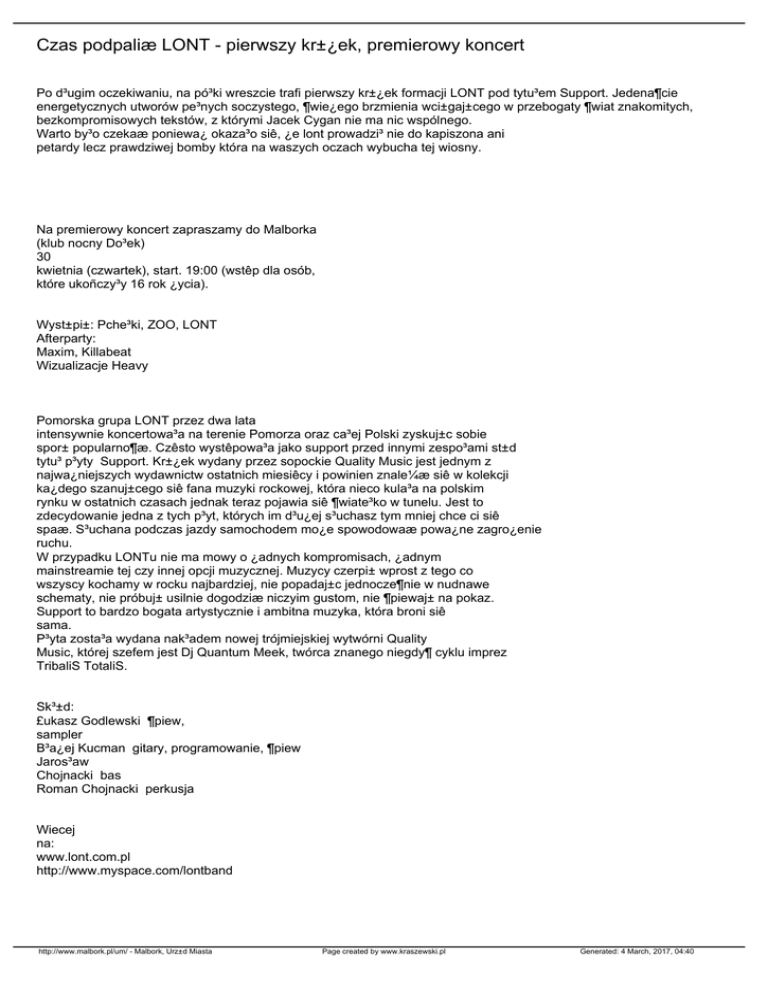 Czas podpaliæ LONT - pierwszy kr±¿ek, premierowy koncert Po d³ugim oczekiwaniu, na pó³ki wreszcie trafi pierwszy kr±¿ek formacji LONT pod tytu³em Support. Jedena¶cie energetycznych utworów pe³nych soczystego, ¶wie¿ego brzmienia wci±gaj±cego w przebogaty ¶wiat znakomitych, bezkompromisowych tekstów, z którymi Jacek Cygan nie ma nic wspólnego. Warto by³o czekaæ poniewa¿ okaza³o siê, ¿e lont prowadzi³ nie do kapiszona ani petardy lecz prawdziwej bomby która na waszych oczach wybucha tej wiosny. Na premierowy koncert zapraszamy do Malborka (klub nocny Do³ek) 30 kwietnia (czwartek), start. 19:00 (wstêp dla osób, które ukoñczy³y 16 rok ¿ycia). Wyst±pi±: Pche³ki, ZOO, LONT Afterparty: Maxim, Killabeat Wizualizacje Heavy Pomorska grupa LONT przez dwa lata intensywnie koncertowa³a na terenie Pomorza oraz ca³ej Polski zyskuj±c sobie spor± popularno¶æ. Czêsto wystêpowa³a jako support przed innymi zespo³ami st±d tytu³ p³yty Support. Kr±¿ek wydany przez sopockie Quality Music jest jednym z najwa¿niejszych wydawnictw ostatnich miesiêcy i powinien znale¼æ siê w kolekcji ka¿dego szanuj±cego siê fana muzyki rockowej, która nieco kula³a na polskim rynku w ostatnich czasach jednak teraz pojawia siê ¶wiate³ko w tunelu. Jest to zdecydowanie jedna z tych p³yt, których im d³u¿ej s³uchasz tym mniej chce ci siê spaæ. S³uchana podczas jazdy samochodem mo¿e spowodowaæ powa¿ne zagro¿enie ruchu. W przypadku LONTu nie ma mowy o ¿adnych kompromisach, ¿adnym mainstreamie tej czy innej opcji muzycznej. Muzycy czerpi± wprost z tego co wszyscy kochamy w rocku najbardziej, nie popadaj±c jednocze¶nie w nudnawe schematy, nie próbuj± usilnie dogodziæ niczyim gustom, nie ¶piewaj± na pokaz. Support to bardzo bogata artystycznie i ambitna muzyka, która broni siê sama. P³yta zosta³a wydana nak³adem nowej trójmiejskiej wytwórni Quality Music, której szefem jest Dj Quantum Meek, twórca znanego niegdy¶ cyklu imprez TribaliS TotaliS. Sk³±d: £ukasz Godlewski ¶piew, sampler B³a¿ej Kucman gitary, programowanie, ¶piew Jaros³aw Chojnacki bas Roman Chojnacki perkusja Wiecej na: www.lont.com.pl http://www.myspace.com/lontband http://www.malbork.pl/um/ - Malbork, Urz±d Miasta Page created by www.kraszewski.pl Generated: 4 March, 2017, 04:40 Pche³ki to przedstawiciele nowego nurtu w muzyce, hop-siupu. Etno, post-rock i psychodeliczny pop ³±cz± siê z po³amanym rytmem jungle'u, transowo¶ci± trip-hopu, frywolno¶ci± jazzu i pocieszno¶ci± metalu. Pche³ki gra³y miêdzy innymi na festiwalach: OffFestival, FAMA2008 - Nagroda Trytona za najwiêksz± osobowo¶æ artystyczn±, Wrock - III miejsce, Nowa Tradycja (Studio Koncertowe Polskiego Radia im. Witolda Lutos³awskiego) - wyró¿nienie dla wokalistki; Pche³kom przy¶wieca idea by ¿ycie mia³o sens, by³o ró¿norodne i uczciwe. Wiecej na: www.pchelki.pl http://www.myspace.com/pchelki ZOO to bydgoski zespó³ inspiruj±cy siê muzycznym brzmieniem lat 90-tych. Ca³a 4-ka muzyków nie ukrywa, i¿ najwiêkszy wp³yw na to w jaki sposób podchodz± do swojej twórczo¶ci wywar³ gatunek wywodz±cy siê z Seattle czyli grunge. Ich piosenki zahaczaj± równie¿ o nutê punkowej zadziorno¶ci nie stroni±c jednocze¶nie od uroku popowych melodii. Wiecej na: www.myspace.com/zooart http://pl.youtube.com/watch?v=cuxlVOBFp2Y&mode=related&search Przedsprzeda¿ biletów Malbork: Klub Nocny "Do³ek" pl. S³owiañski 5 tel. +48 (55) 272 31 31 Szko³a Muzyczna Yamaha ul. Targowa 17 pon.-pt. 15:00-19:00 tel. +48 600 975 639 klub "Do³ek" - podczas trwania imprez Gdañsk: Gryf - Centrum Graficzne (klub Kwadratowa) http://www.malbork.pl/um/ - Malbork, Urz±d Miasta Page created by www.kraszewski.pl Generated: 4 March, 2017, 04:40 ul.Siedlicka 4 pon.-pt. 8:00 - 20:00 sob. 9:00 15:00 tel. +48 (58) 347 16 25 Rada Samorz±du Studentów AWFiS ul. Kazimierza Górskiego 1 tel. +48 (58) 554 72 65 Uwaga! Podczas koncertu bêdzie mo¿na nabyæ p³yty oraz podkoszulki zespo³u! http://www.malbork.pl/um/ - Malbork, Urz±d Miasta Page created by www.kraszewski.pl Generated: 4 March, 2017, 04:40