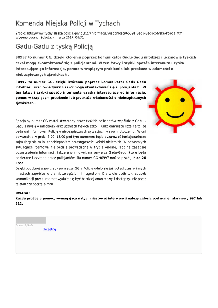 Komenda Miejska Policji w Tychach Źródło: http://www.tychy.slaska.policja.gov.pl/k27/informacje/wiadomosci/65391,Gadu-Gadu-z-tyska-Policja.html Wygenerowano: Sobota, 4 marca 2017, 04:31 Gadu-Gadu z tyską Policją 90997 to numer GG, dzięki któremu poprzez komunikator Gadu-Gadu młodziez i uczniowie tyskich szkół mogą skontaktować się z policjantami. W ten łatwy i szybki sposób internauta uzyska interesujące go informacje, pomoc w trapiącym problemie lub przekaże wiadomości o niebezpiecznych zjawiskach . 90997 to numer GG, dzięki któremu poprzez komunikator Gadu-Gadu młodziez i uczniowie tyskich szkół mogą skontaktować się z policjantami. W ten łatwy i szybki sposób internauta uzyska interesujące go informacje, pomoc w trapiącym problemie lub przekaże wiadomości o niebezpiecznych zjawiskach . Specjalny numer GG został stworzony przez tyskich policjantów wspólnie z Gadu – Gadu z myślą o młodzieży oraz uczniach tyskich szkół. Funkcjonariusze liczą na to, że będą oni informowali Policję o niebezpiecznych sytuacjach w swoim otoczeniu . W dni powszednie w godz. 8.00 -15.00 pod tym numerem będą dyżurować funkcjonariusze zajmujący się m.in. zapobieganiem przestępczości wśród nieletnich. W pozostałych sytuacjach rozmowa nie będzie prowadzona w trybie on-line, lecz na zasadzie pozostawienia informacji, także anonimowej, na serwerze Gadu-Gadu, które będą odbierane i czytane przez policjantów. Na numer GG 90997 można pisać już od 20 lipca. Dzięki podobnej współpracy pomiędzy GG a Policją udało się już dotychczas w innych miastach zapobiec wielu nieszczęściom i tragediom. Dla wielu osób taki sposób komunikacji przez internet wydaje się być bardziej anonimowy i dostępny, niż przez telefon czy pocztę e-mail. UWAGA ! Każdą prośbę o pomoc, wymagającą natychmiastowej interwencji należy zgłosić pod numer alarmowy 997 lub 112. Ocena: 0/5 (0) Tweetnij